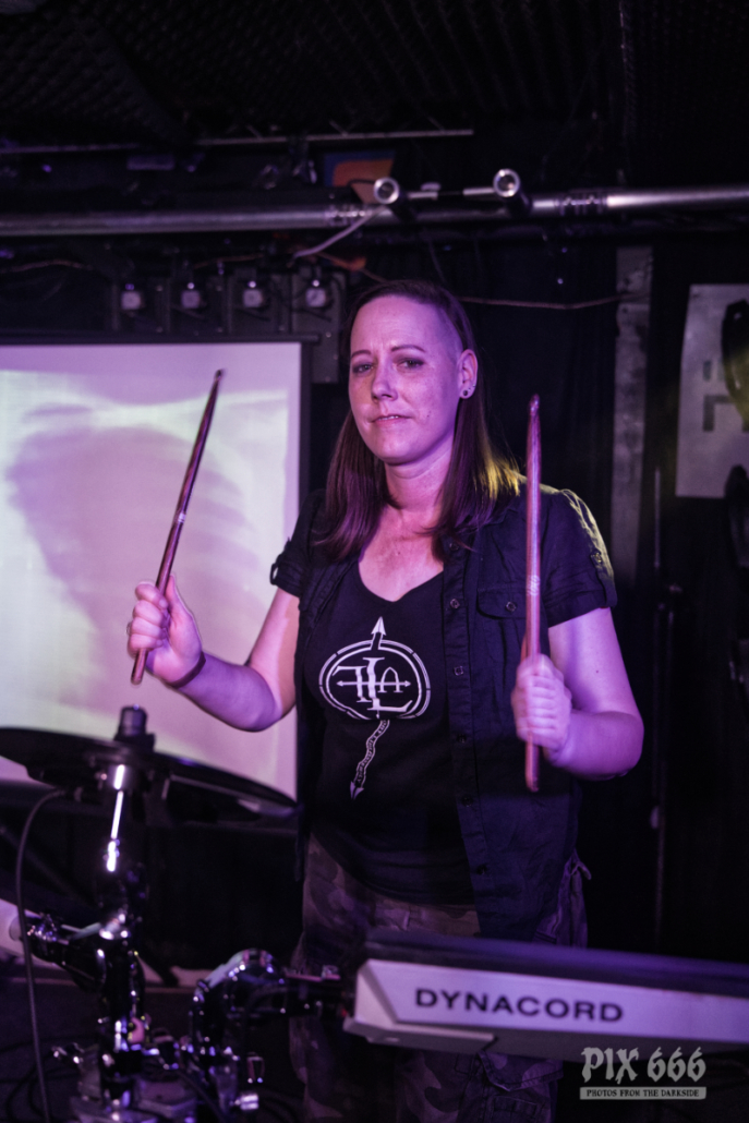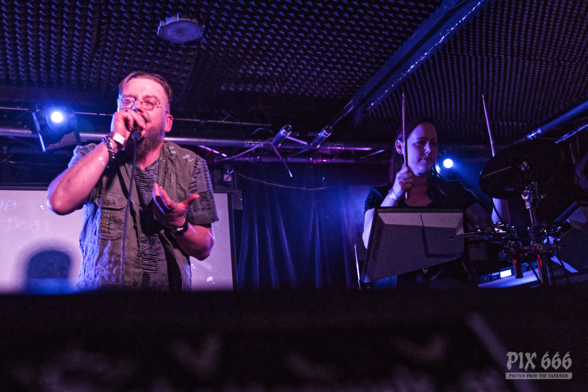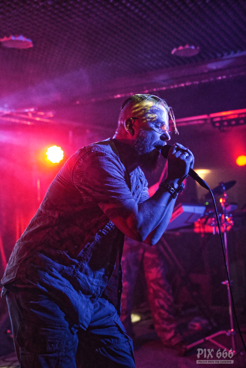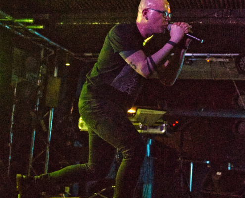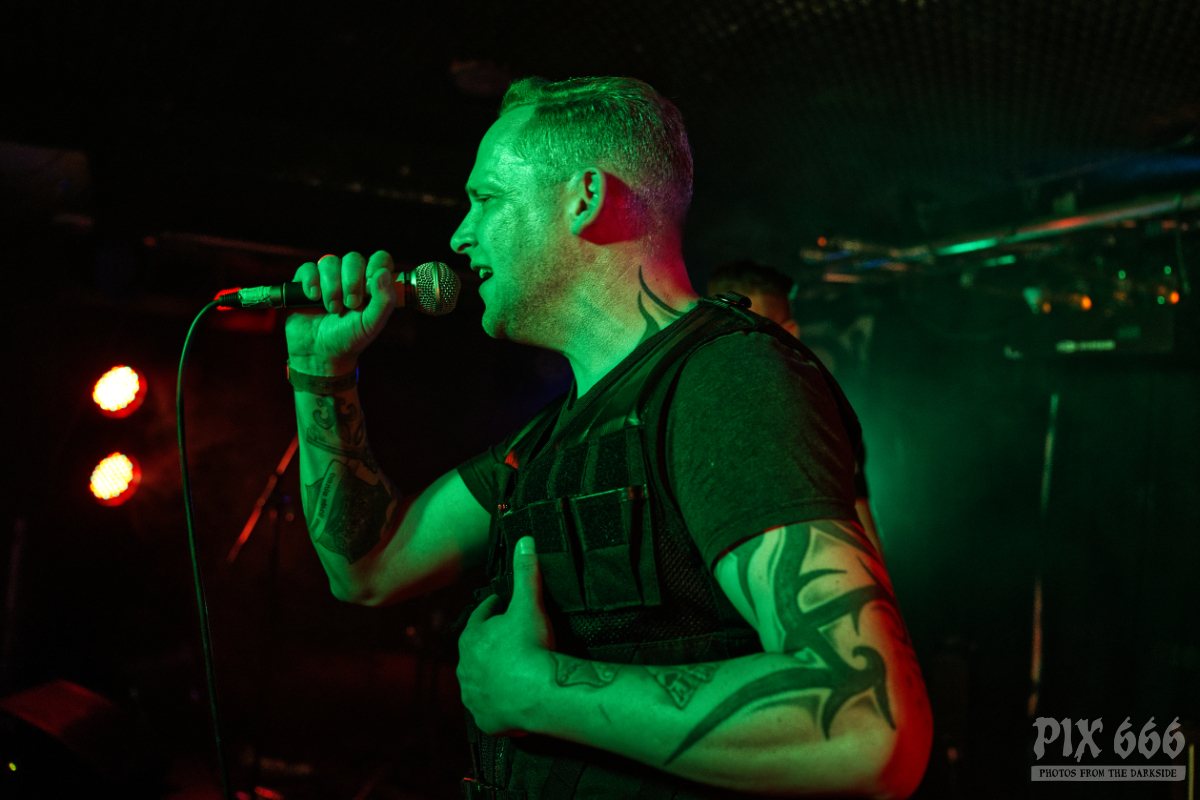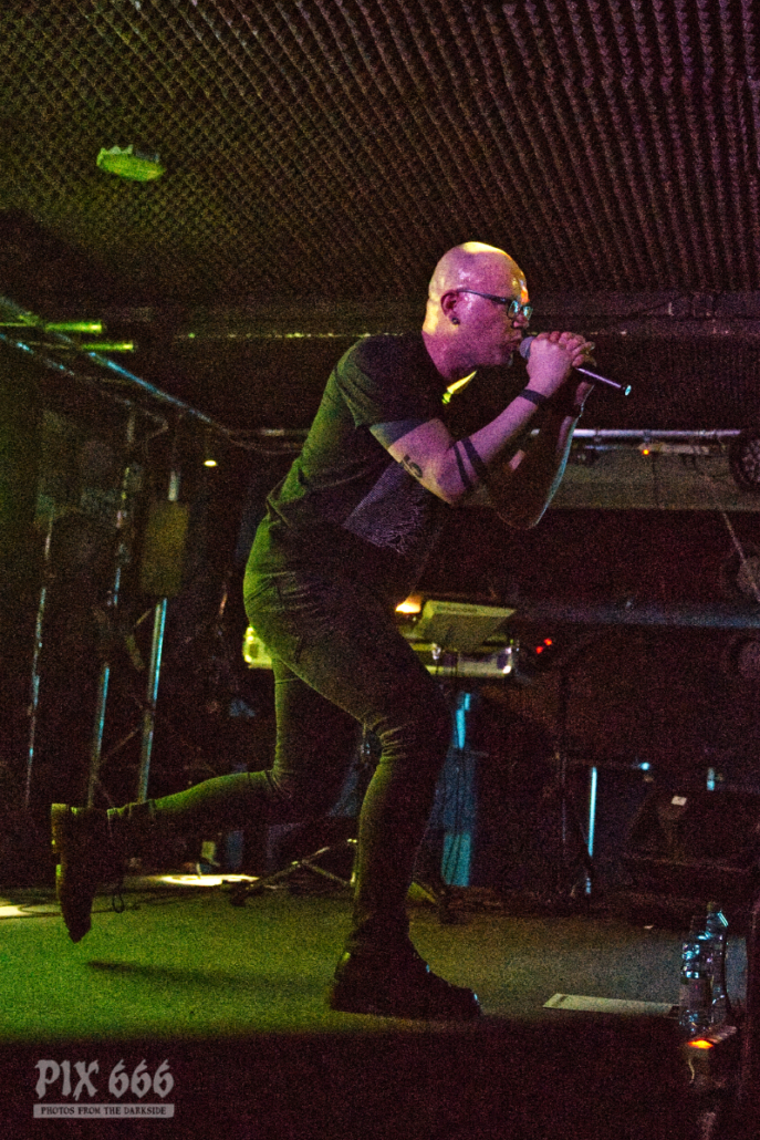 Der nächste Act kam ebenfalls aus Deutschland. Die Band g.o.l.e.m. wurde 2010 gegründet und hat inzwischen mehrere Singles und Alben veröffentlicht. Ihren Stil kann man als eine Mischung aus Electro-Industrial und EBM beschreiben. Brachiale Beats mit dem Electrodrum versetzte das Tanzvolk in Ekstase. Die Stimmung beim Duo aus München war von Beginn an fantastisch. Immer noch war es sehr dunkel im Replugged, aber das ist scheinbar die Standardbeleuchtung bei EBM Veranstaltungen. Beim Auftritt von g.o.l.e.m. blieb es nun nicht mehr nur beim Tanzen, der coole Beat verleitete die Fans inzwischen auch mal zum Springen. Die düsteren und atmosphärischen Klänge, gepaart mit verzerrten Vocals und treibenden Beats sorgten für perfekter Electro/EBM Feeling.