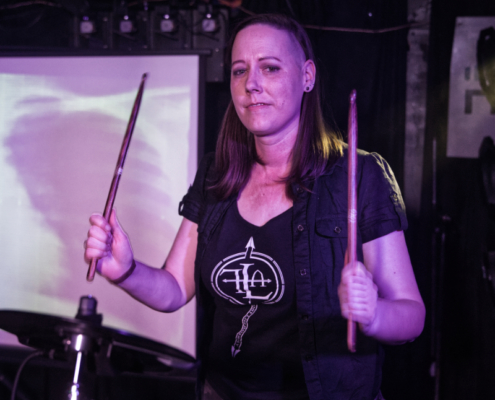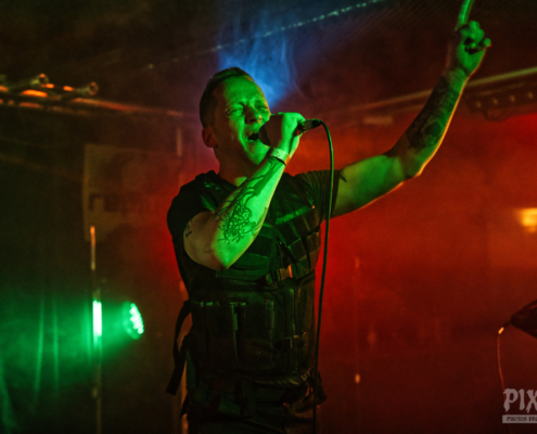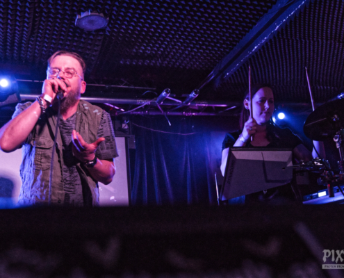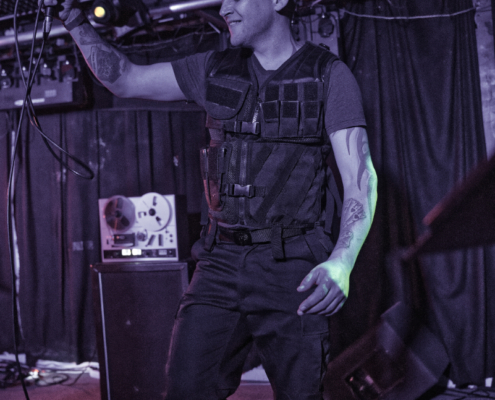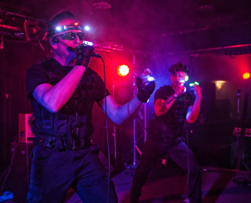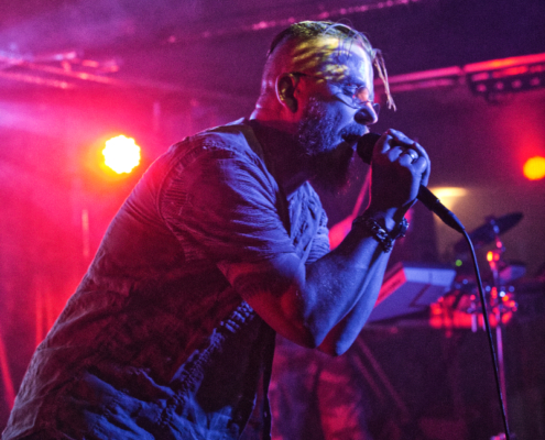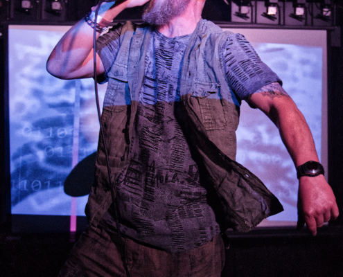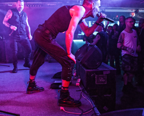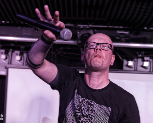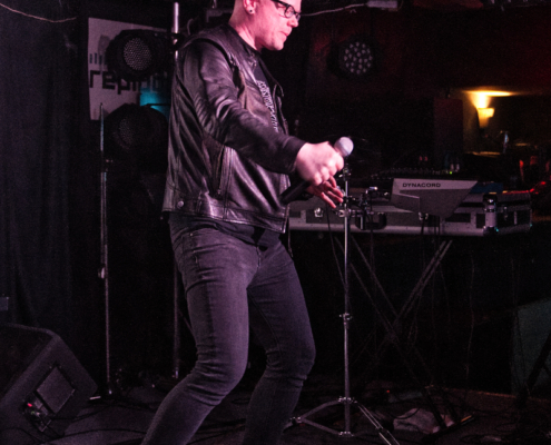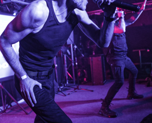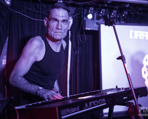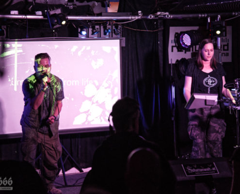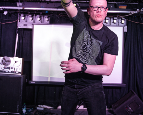 System 84 sind nicht zum ersten Mal im LineUp der EBM Reunion OST – das Duo aus der Steiermark war in diesem Jahr die einzige einheimische Band und hatte sogar eine eigene, kleine Fangruppe angelockt. System 84 sorgten ordentlich für Wirbel, die Jungs waren auf der Bühne sehr aktiv und hatten das Publikum im Replugged voll im Griff. Das war inzwischen für alle Beteiligten eine schweißtreibende Angelegenheit, da musste erstmal eine kleine Stärkung aus der Flasche her. Der Sound mit den treibenden Beats lässt die Festivalbesucher in die gute alte Zeit eintauchen und abfeiern. Und abgefeiert wurde nun noch jemand – Mijk Destino vom Schattenwelt Verein wurde auf die Bühne gebeten und erhielt jede Menge warme und dankende Worte, für die tolle Organisation der Veranstaltungsreihe, die wie gesagt heute zum letzten Mal stattfand. Lautstarker Applaus und Jubel flog ihm auch von den dankbaren EBM Fans entgegen. Anschließend ging es noch ein bisschen mit Musik weiter. Mitten im letzten Song bedankten sich die beiden Musiker dann auch beim Publikum, welches sich hier wirklich so langsam in einen Rausch tanzte.