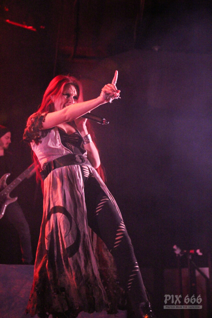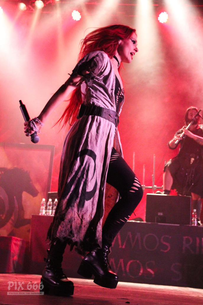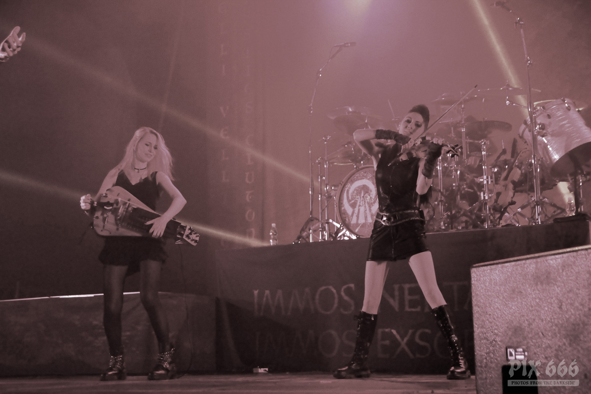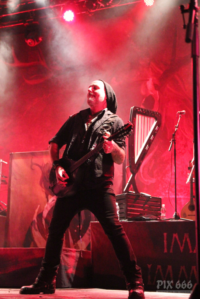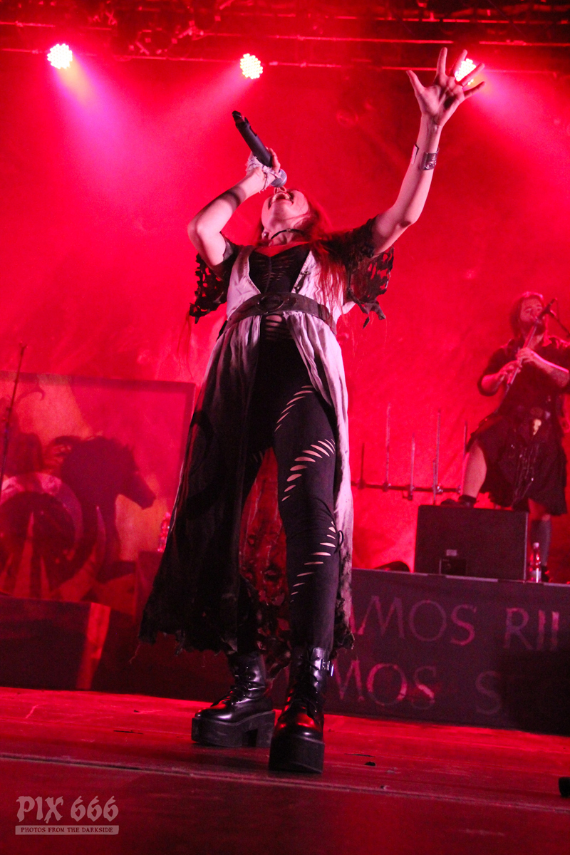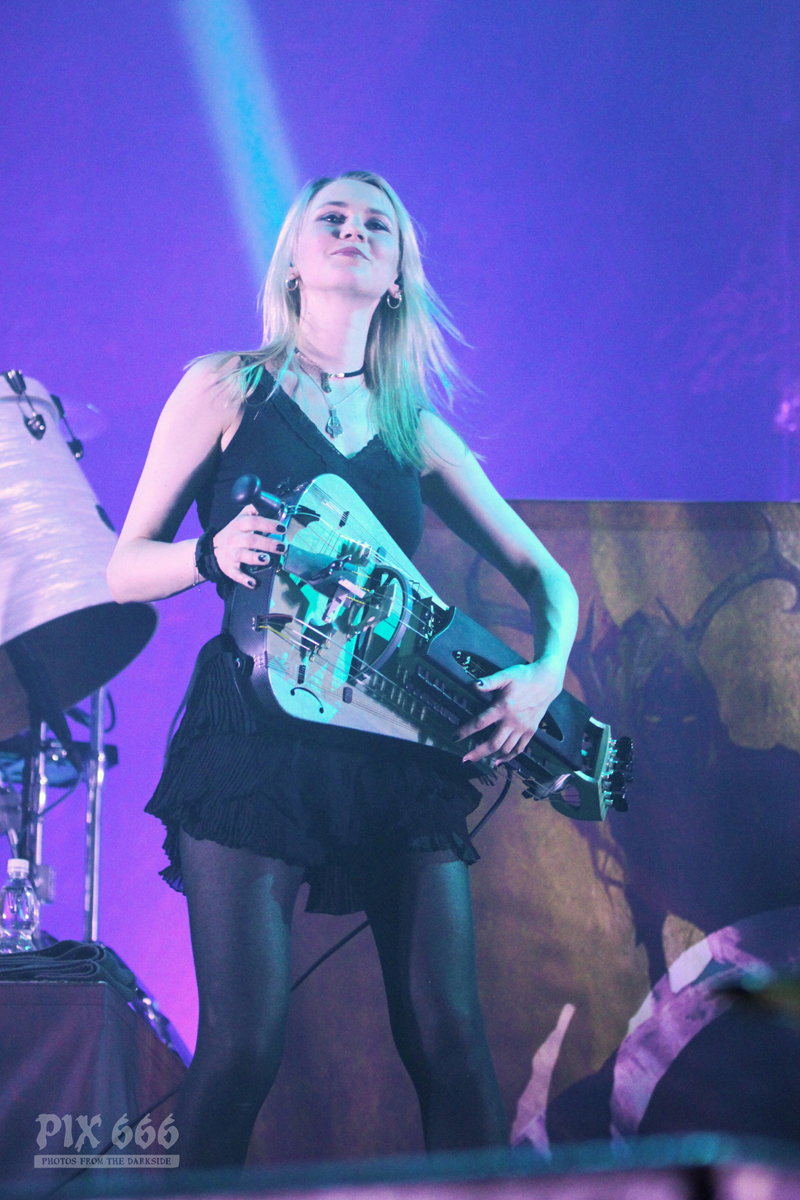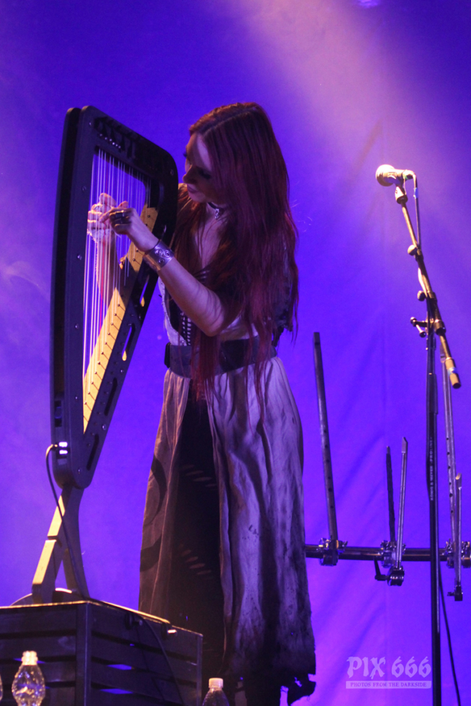 Nun gab es ein Drumsolo mit tollen Lichteffekten und eine kurze Pause für die anderen Bandmitglieder. Weiter ging es dann mit bunten Lichtern und schnellem, fetten Sound bei ‚King‘. Die wehenden Haare an Drehleier und Harfe sahen wirklich spektakulär aus – bei einem Eluveitie Konzert bräuchte man eigentlich vier Augen, um alles gleichzeitig erfassen zu können. Eluveitie bedankten sich dann bei den anderen Bands, die mit ihnen diese Tour bestreiten. „ …aber am meisten ein Danke an jeden Einzelnen von euch … jetzt kommt der letzte Song“.