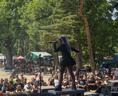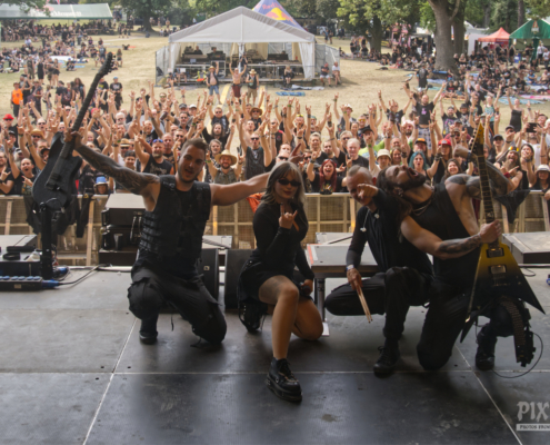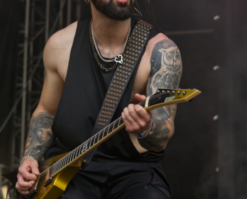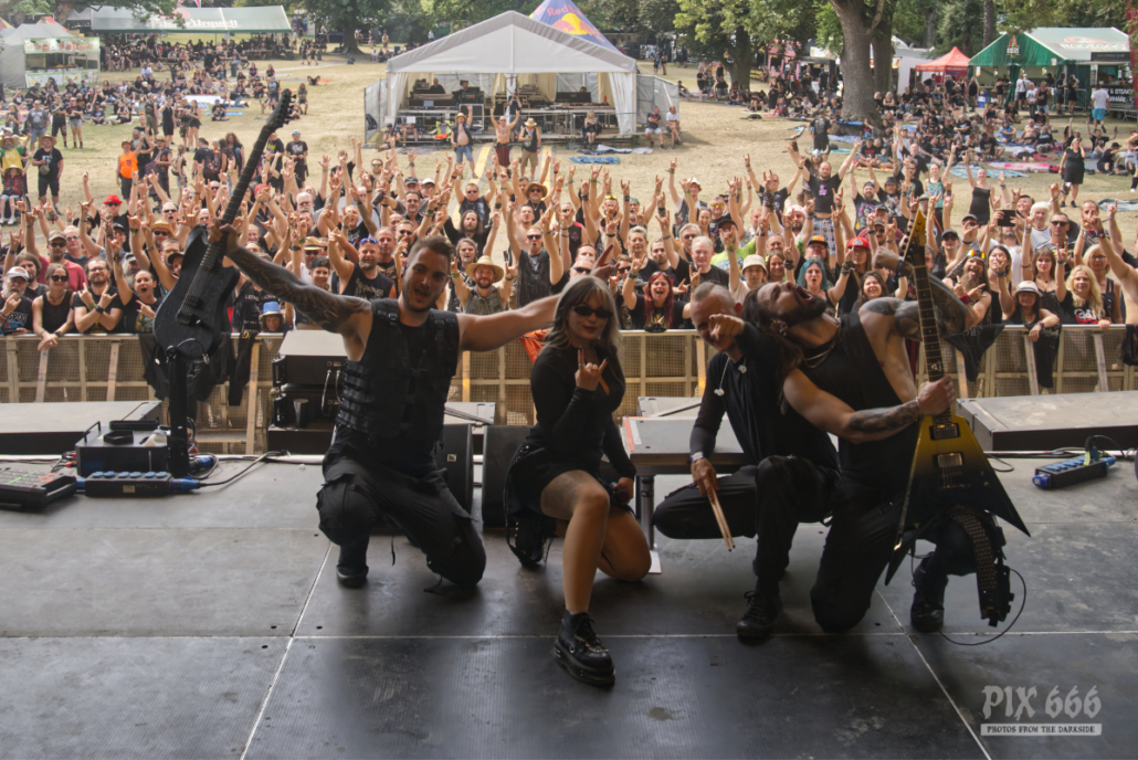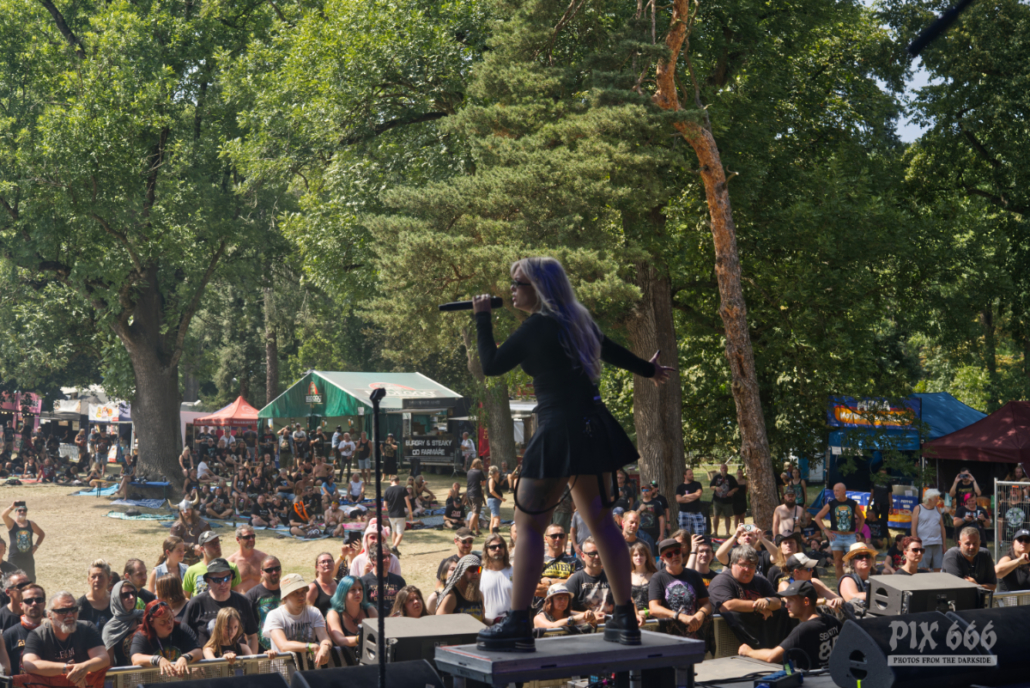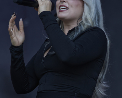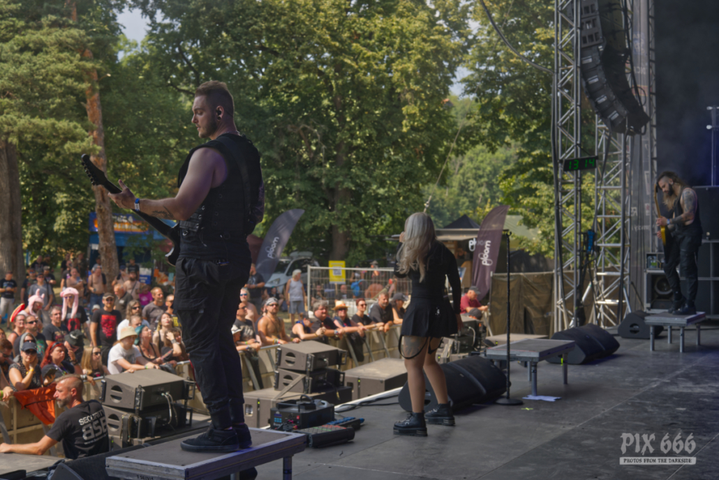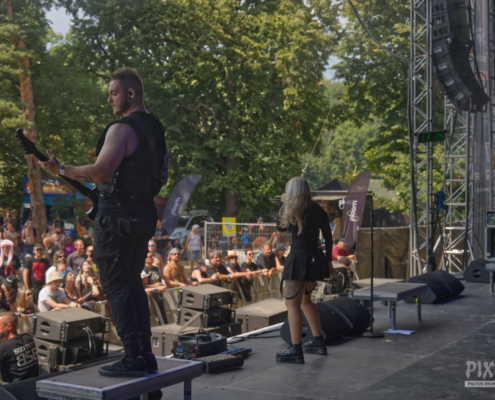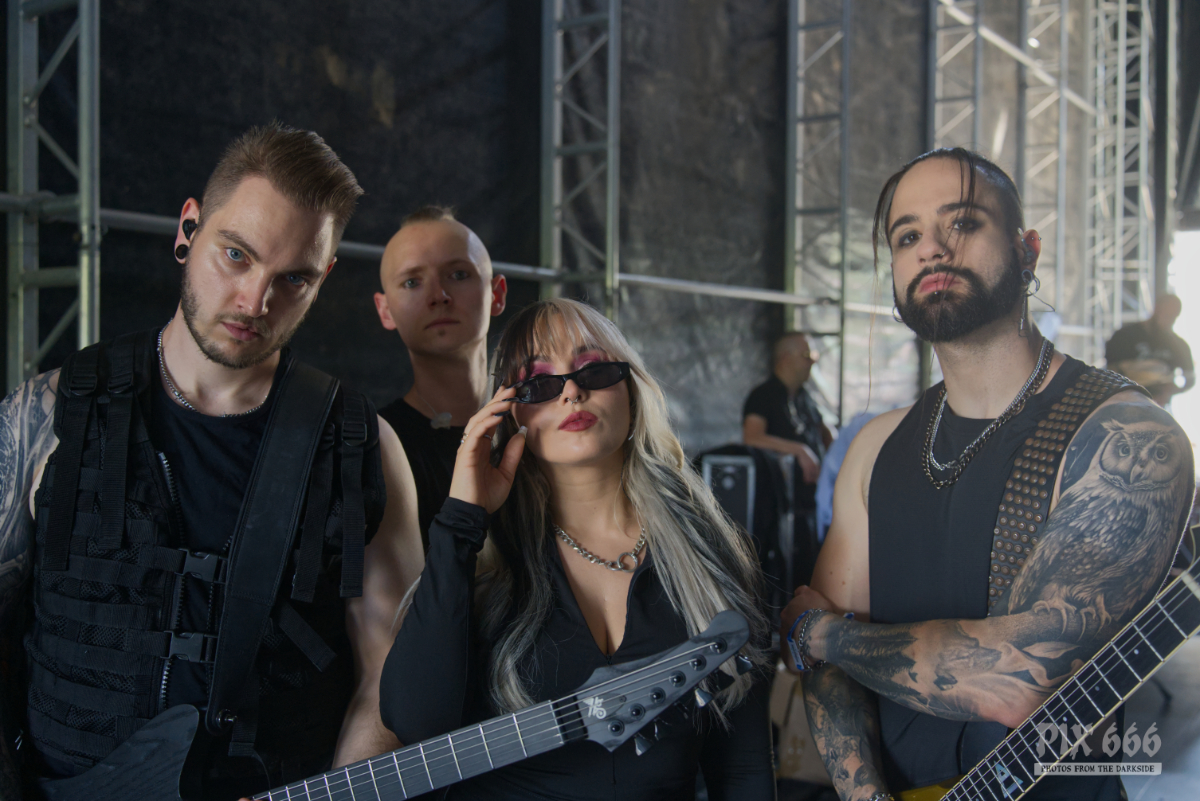 Kurze Zeit später hiess es dann schon Stage-Time. Mit einer fesselnden Mischung aus düsterer Atmosphäre, modernen Metal-Elementen und eindringlicher Melodik lieferten Enemy Inside beim Rock Castle Festival 2025 einen starken, emotional aufgeladenen Auftritt. Während der Show in der Mittagshitze hatten sich immer noch viele Fans links und rechts unter den Bäumen vor der Höllenglut versteckt – aber auch die Band auf der Bühne kam ordentlich ins Schwitzen – die Sonne brannte unerbittlich und die Sonnenbrille war während der gesamten Show ein notwendiger Begleiter für Sängerin Nastassja. Die Frontfrau begeisterte das Publikum mit ihrer charismatischen Präsenz und facettenreichen Stimme – von gefühlvoll-zart bis kraftvoll und anklagend. Die Band unterstützte sie mit druckvollen Riffs, melancholisch-melodischen Gitarrenparts und dichten Soundwänden, die zwischen Alternative Metal und Dark Rock pendelten. Enemy Inside überzeugten mit einem modernen, düster-eleganten Sound und einer leidenschaftlichen Bühnenperformance. Ein starker Auftritt, der musikalisch wie inhaltlich nachwirkte – intensiv, ehrlich und kraftvoll. Besonders die starken Singles vom neuen Album ‚Venom‘ kamen richtig gut an. Schaut euch bei Gelegenheit auch mal die tollen, bereits hunderttausende Male geklickten Videoclips von Enemy Inside an – es lohnt sich. Zum krönenden Abschluss gab es dann mit dem inzwischen schon sieben Jahre alten Klassiker ‚Phoenix‘ vom gleichnamigen Debutalbum – ein echter Ohrwurm. Für die deutsche Band geht es Mitte September für fünf Shows nach Spanien – also wer Lust auf einen Spätsommerurlaub in Spanien hat, sollte das auf jeden Fall mit einer Enemy Inside Show verbinden.