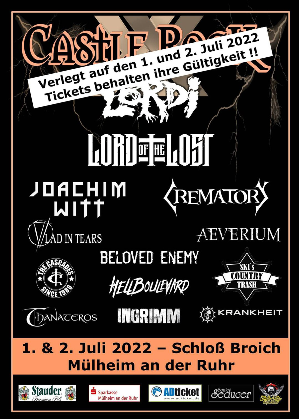 Die Castle Rock Fans müssen noch ein weiteres Jahr auf das Jubiläumsfestival warten. Das nächste Castle Rock Festival findet nun erst 2022 statt. 2019 musste die 20. Auflage des Festivals wegen Baumaßnahmen an der Burg leider ausfallen – in diesem Jahr fällt das Festival, wie schon 2020 den euch bekannten Gründen zum Opfer.