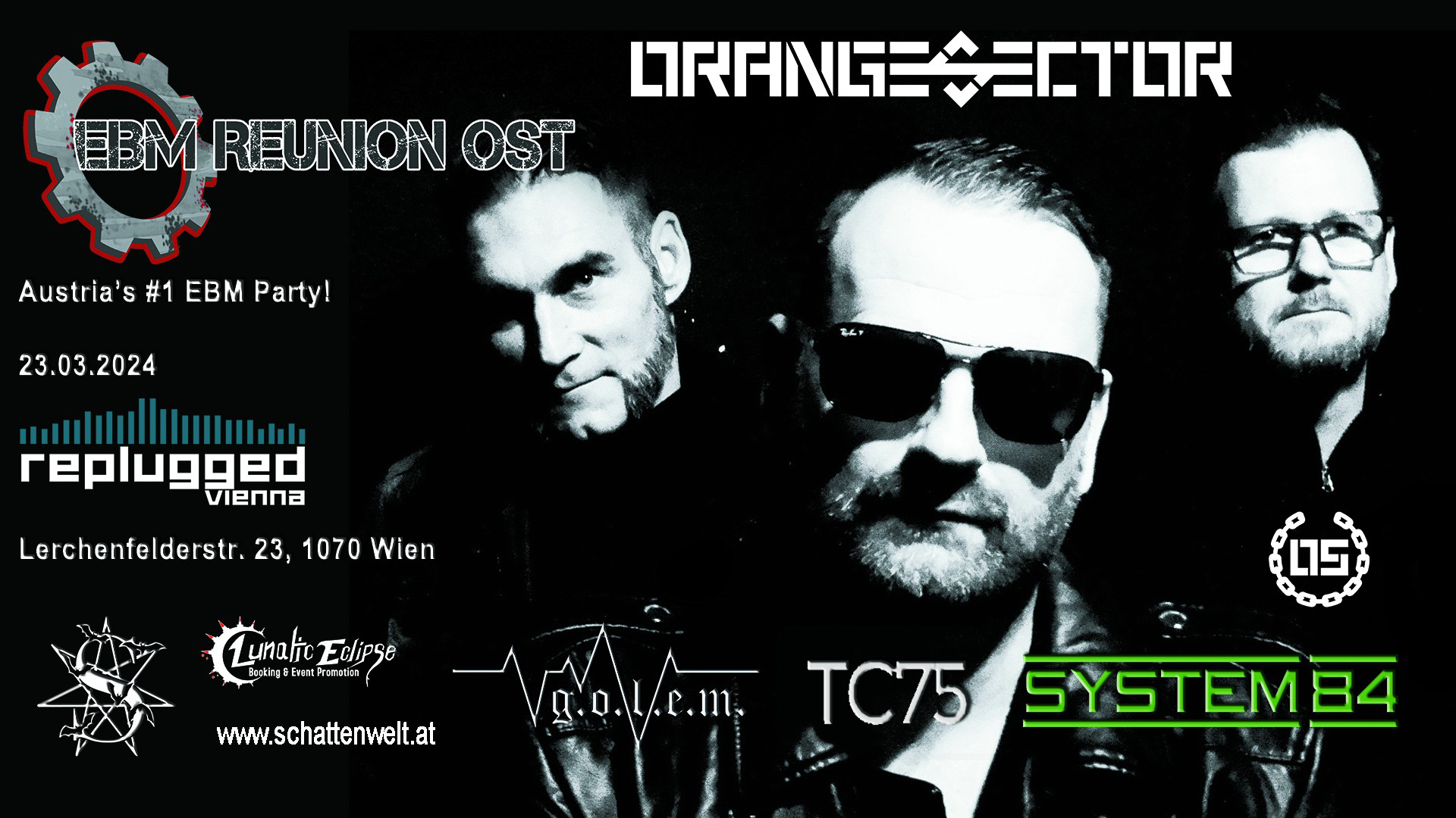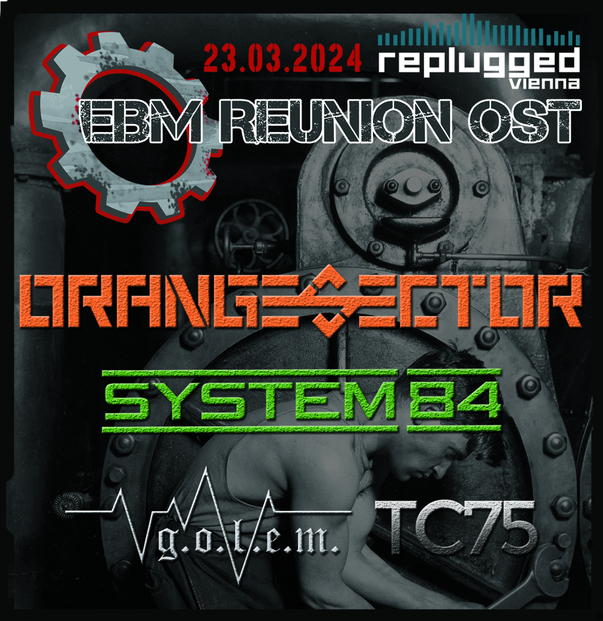 In diesem Jahr werden ORANGE SECTOR Headliner sein – die Band aus Hannover ist bereits seit über 30 Jahren eine fixe Größe in der EBM Szene. Die anderen Bands sind TC75, g.o.l.e.m. und System 84.