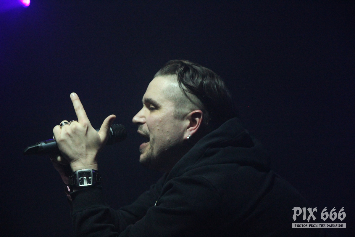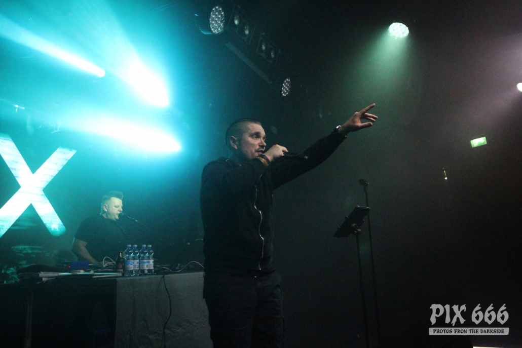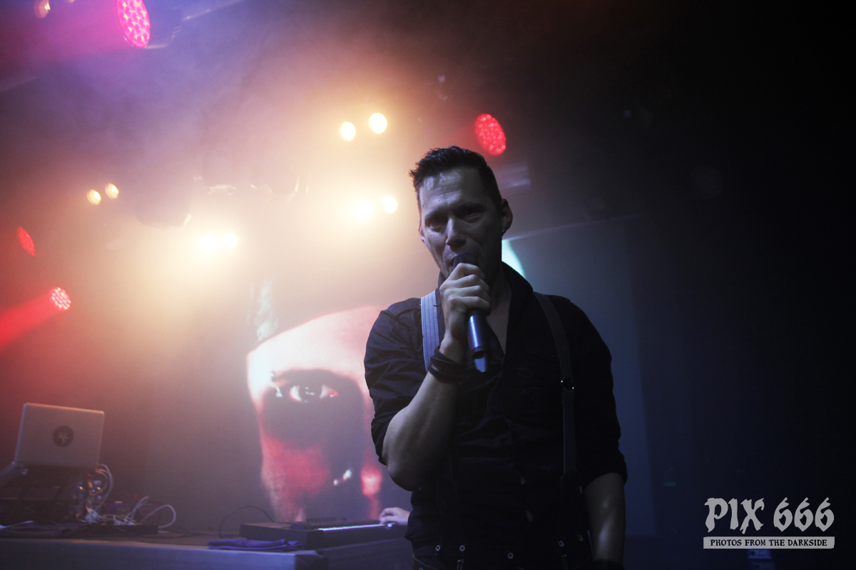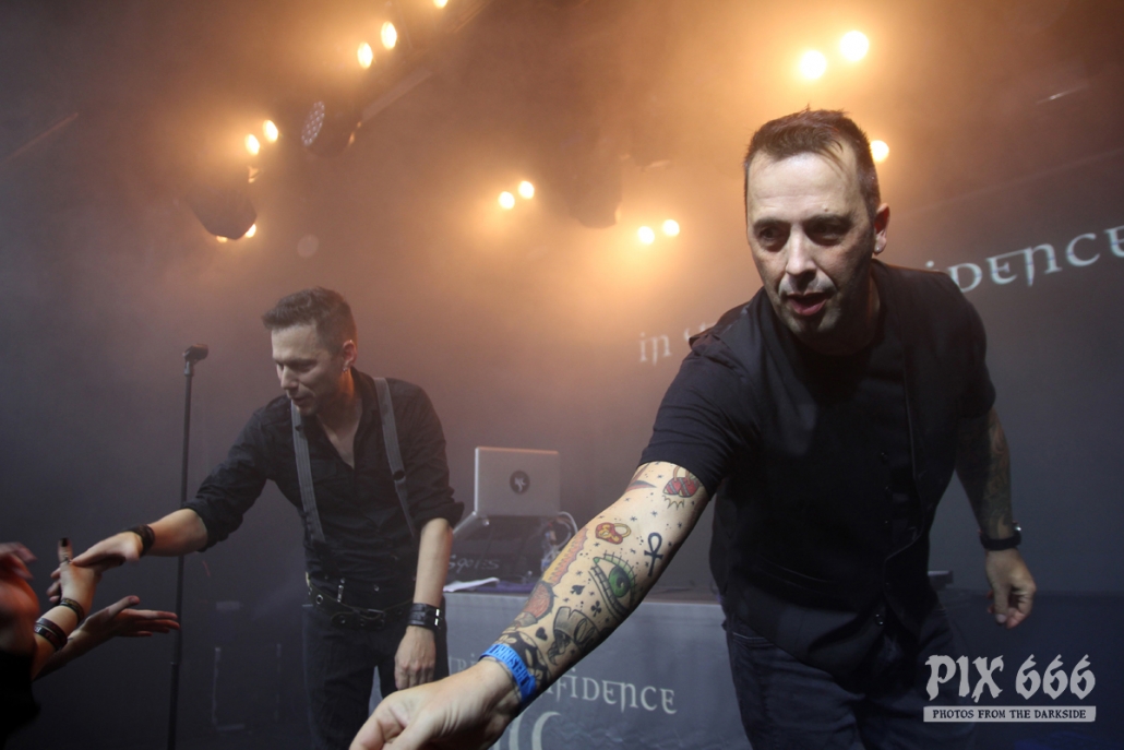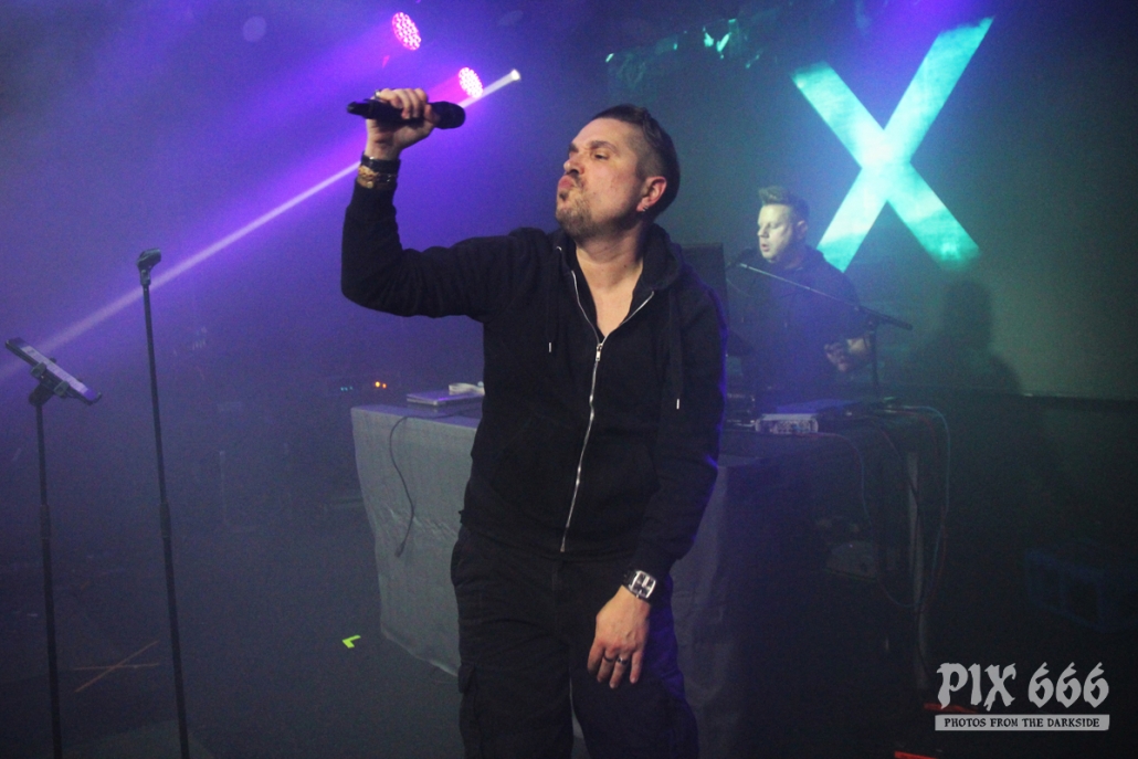 Als zweite Band war die deutsche Aggrotech Formation [:SITD:] an der Reihe. Die Band aus dem Ruhrgebiet wurde bereits vor über 20 Jahren gegründet und hat schon zahlreiche CD’s veröffentlicht. Das aktuelle Werk ‚Stunde X‘ stammt aus dem Mai dieses Jahres. Nun war es 21.00 Uhr und es ging schon weiter – der Changeover ging sehr zügig. „Wir sind [:SITD:] aus Deutschland“ so begrüßte Sänger Carsten die Fans, die nun zahlreich vor der Bühne standen. Das Publikum stand nicht lange still und machte ordentlich Stimmung. Zwischendurch hat Carsten bei den Ansagen immer mal zwischen deutscher und englischer Sprache geswitcht – er hat bestimmt bei der tollen Stimmung gedacht, er sei in Deutschland. Aber hey auch die Finnen mögen harten Electro und können Party machen – in den ersten Reihen hüpften und sprangen die Leute jetzt sogar richtig. Die Stimmung war jetzt richtig gut und Carsten sagte mehrmals „Danke Helsinki – ihr seid die Größten“ Der Tisch, auf dem das Keyboard aufgebaut war, sah fast aus wie in einem Kinderzimmer – der Laptop war umzingelt von zahlreichen Getränkeflaschen. Dann gab es reichlich Körperkontakt – die Fans in der ersten Reihe wurden fast alle abgeklatscht. Die Band wurde stürmisch gefeiert – „Es ist noch nicht zu Ende“ sagte Carsten nach etwa 50 Minuten – er wünschte aber schon Mal vorab viel Spaß mit In Strict Confidence, die im Anschluss als Headliner des ersten Tages dran waren. Aber vorher ging die Party mit [:SITD:] noch weiter. Bei der Zugabe gab es stampfende Bässe zum Song ‚Snuff Machinery‘. „Zeigt mir eure Hände, Helsinki – Leute, ihr seid verrückt. Danke!“