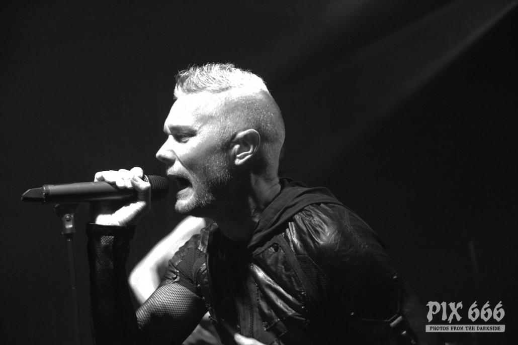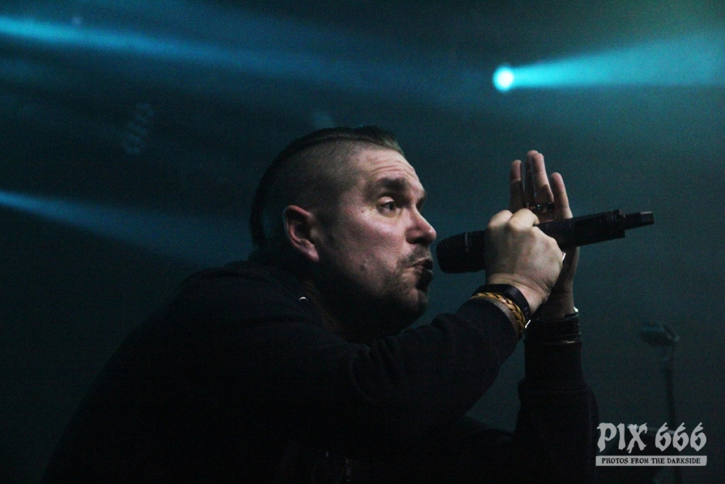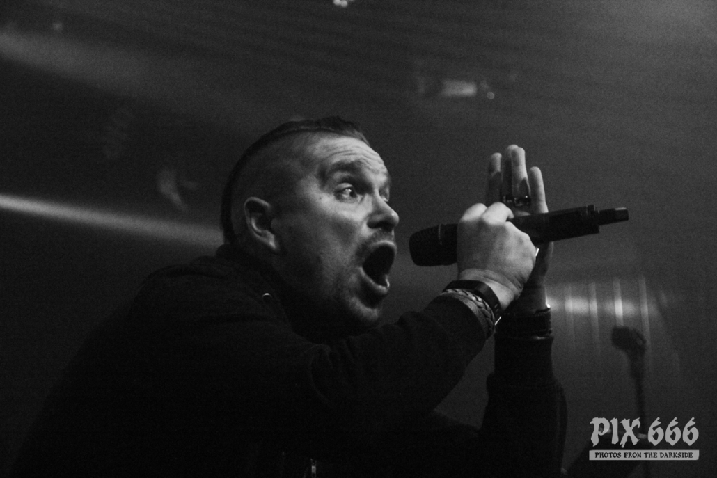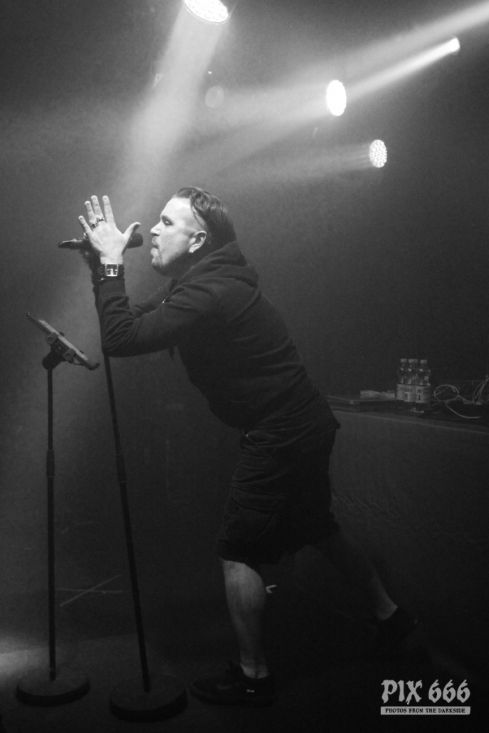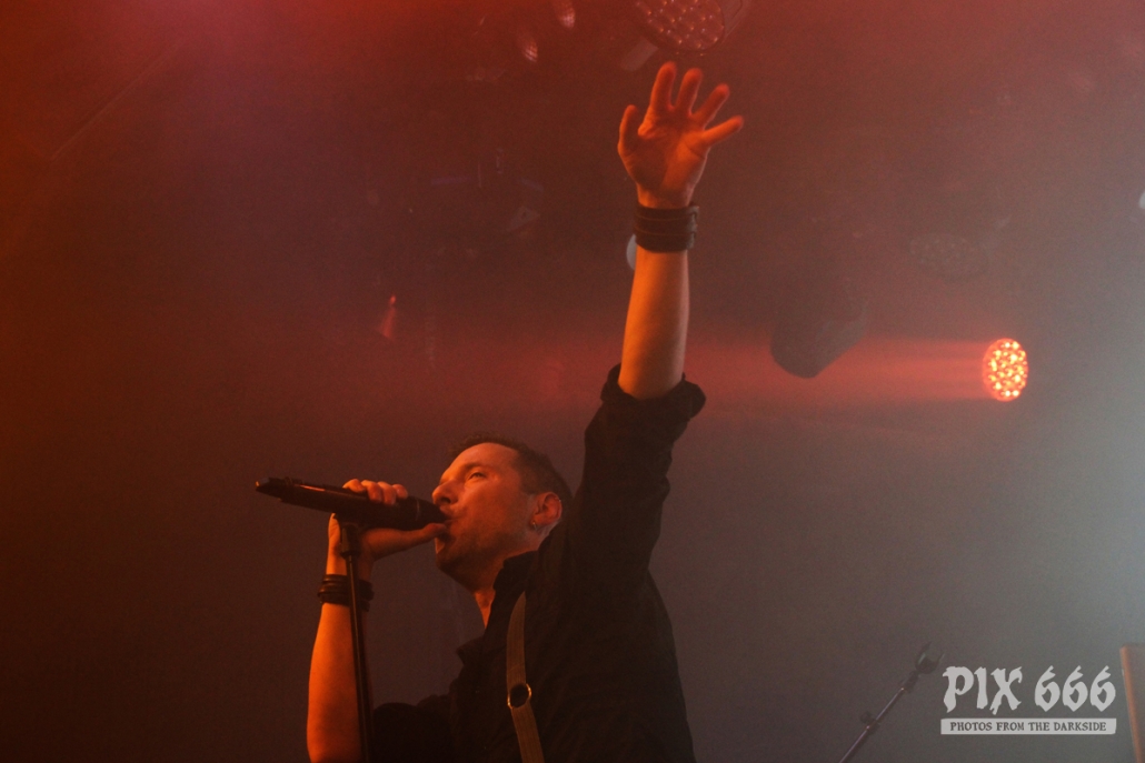 Als zweite Band war die deutsche Aggrotech Formation [:SITD:] an der Reihe. Die Band aus dem Ruhrgebiet wurde bereits vor über 20 Jahren gegründet und hat schon zahlreiche CD’s veröffentlicht. Das aktuelle Werk ‚Stunde X‘ stammt aus dem Mai dieses Jahres. Nun war es 21.00 Uhr und es ging schon weiter – der Changeover ging sehr zügig. „Wir sind [:SITD:] aus Deutschland“ so begrüßte Sänger Carsten die Fans, die nun zahlreich vor der Bühne standen. Das Publikum stand nicht lange still und machte ordentlich Stimmung. Zwischendurch hat Carsten bei den Ansagen immer mal zwischen deutscher und englischer Sprache geswitcht – er hat bestimmt bei der tollen Stimmung gedacht, er sei in Deutschland. Aber hey auch die Finnen mögen harten Electro und können Party machen – in den ersten Reihen hüpften und sprangen die Leute jetzt sogar richtig. Die Stimmung war jetzt richtig gut und Carsten sagte mehrmals „Danke Helsinki – ihr seid die Größten“ Der Tisch, auf dem das Keyboard aufgebaut war, sah fast aus wie in einem Kinderzimmer – der Laptop war umzingelt von zahlreichen Getränkeflaschen. Dann gab es reichlich Körperkontakt – die Fans in der ersten Reihe wurden fast alle abgeklatscht. Die Band wurde stürmisch gefeiert – „Es ist noch nicht zu Ende“ sagte Carsten nach etwa 50 Minuten – er wünschte aber schon Mal vorab viel Spaß mit In Strict Confidence, die im Anschluss als Headliner des ersten Tages dran waren. Aber vorher ging die Party mit [:SITD:] noch weiter. Bei der Zugabe gab es stampfende Bässe zum Song ‚Snuff Machinery‘. „Zeigt mir eure Hände, Helsinki – Leute, ihr seid verrückt. Danke!“