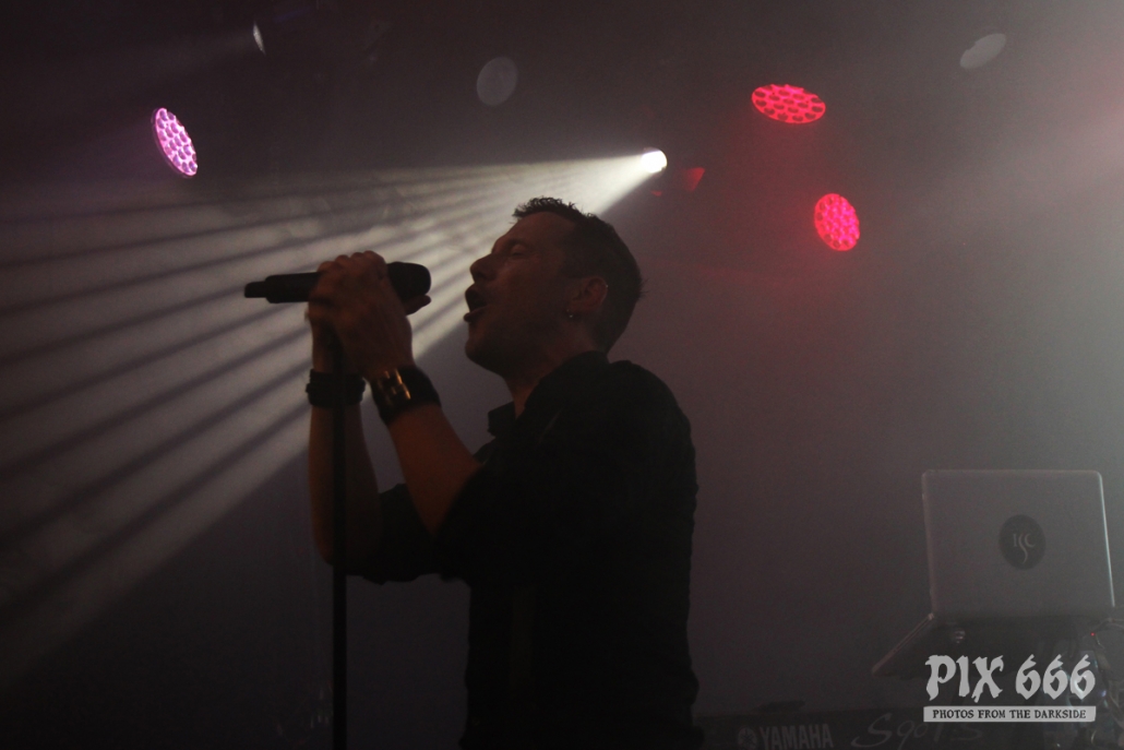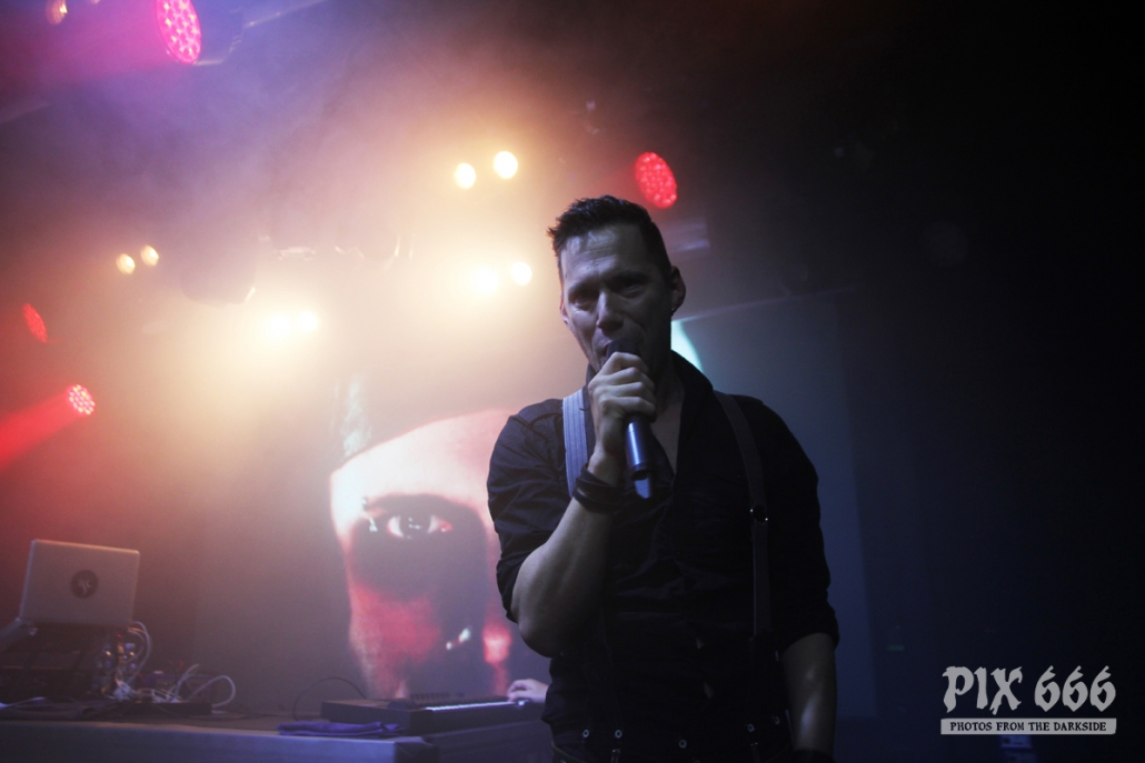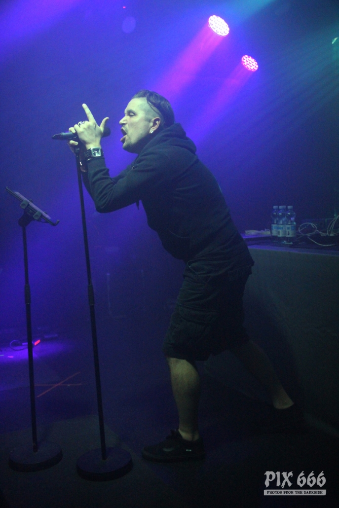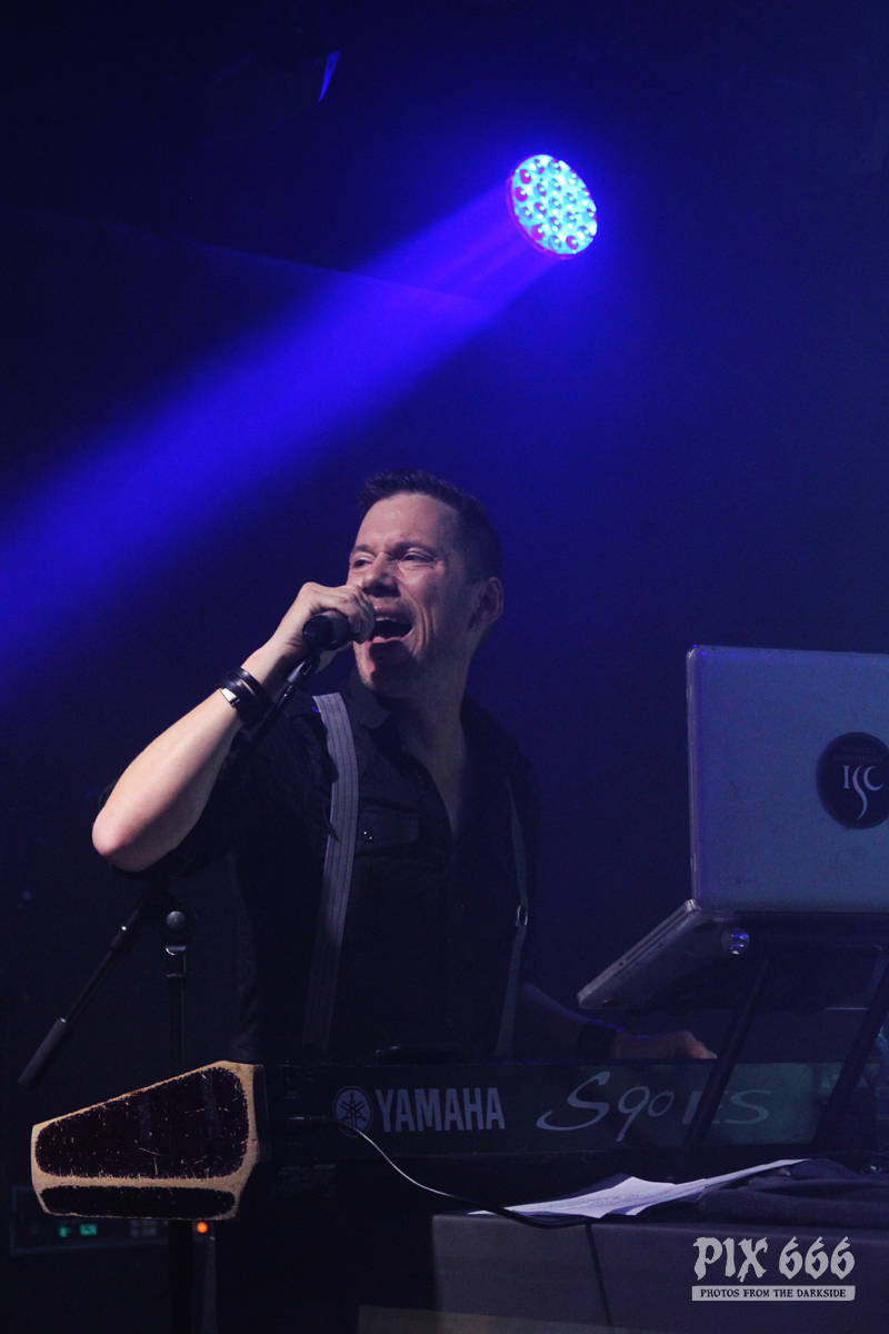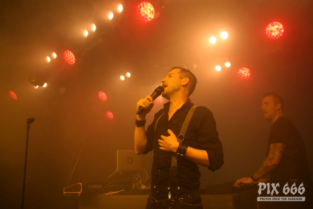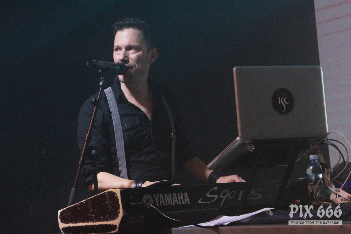 Der zweite Festivaltag wurde von der einheimischen Band Ten After Dawn eröffnet. Als die Band zu spielen begann, war der Club halbvoll. Bis zum Ende des Auftrittes war es dann richtig gut gefüllt. Ein würdiger Rahmen für die Dark Electro Formation aus Helsinki. Ten After Dawn sorgten für gute Stimmung und begeisterten die Anwesenden mit ihrem tollen, eingängigen Electropop. Neben Sänger Teemu, der zu Beginn mit einer coolen Lederjacke auf der Bühne stand, gehören zu der finnischen Band noch ein Keyboarder und ein Bassist. Die ersten Songs waren gleich relativ flott, als der Sound dann immer flotter wurde, und die Melodien eingängiger, tanzten nun nicht nur die Fans in den ersten Reihen. Teemu zog dann auch bald seine Jacke aus und spielte im schwarzen Hemd weiter – das war besser so, denn es wurde immer wärmer im Club. Ten After Dawn spielten natürlich auch ihre neue Single ‚Club‘, die vor ein paar Wochen erschienen ist. Die Ansagen von Teemu waren gemischt, teils Finnisch, teils Englisch.