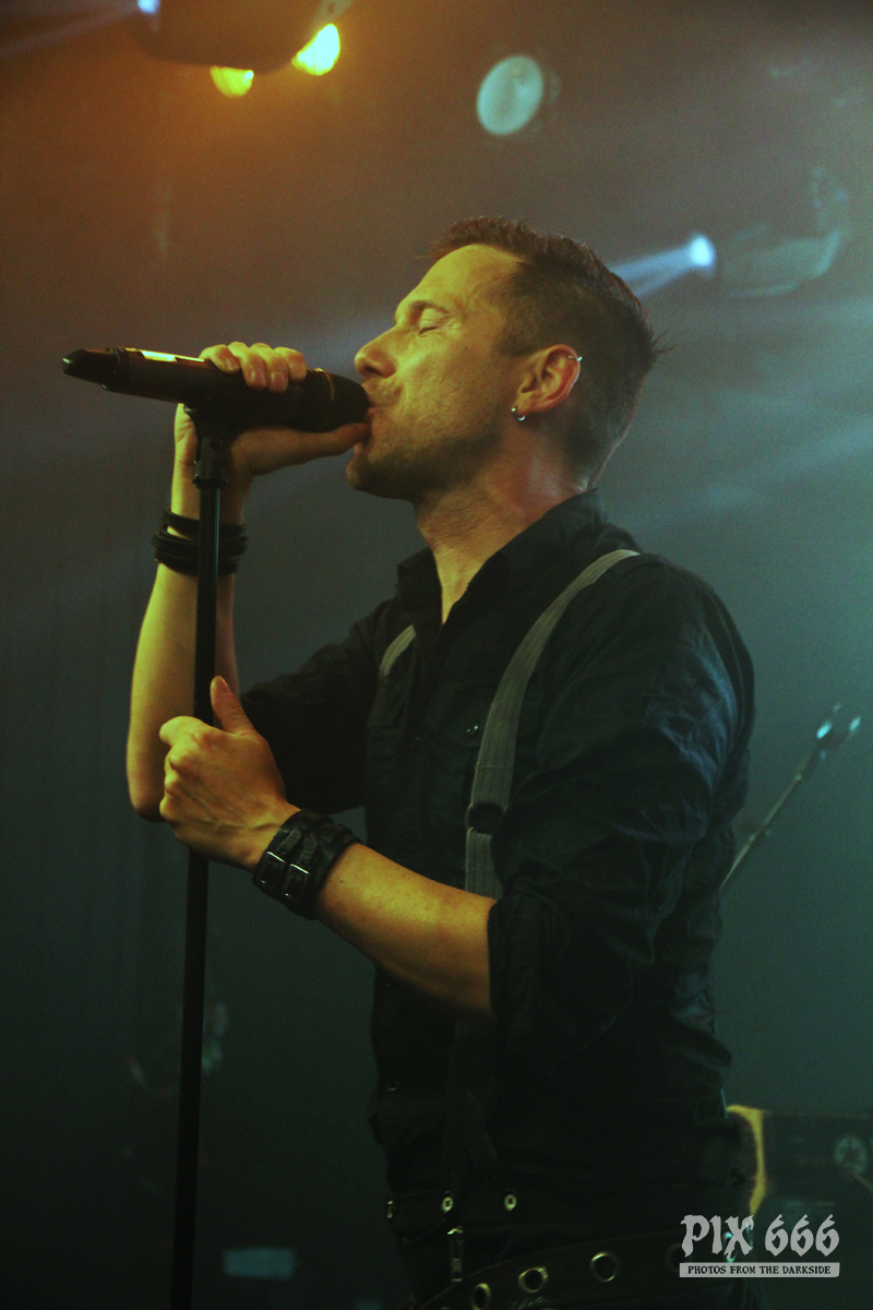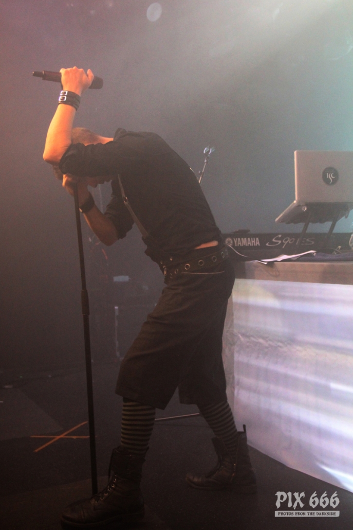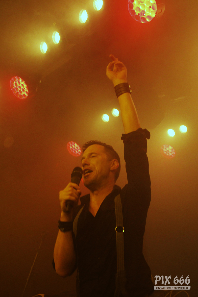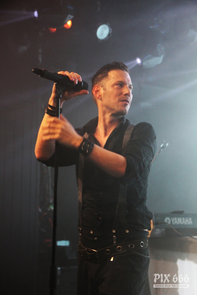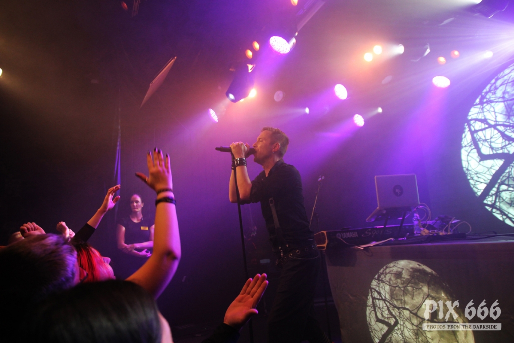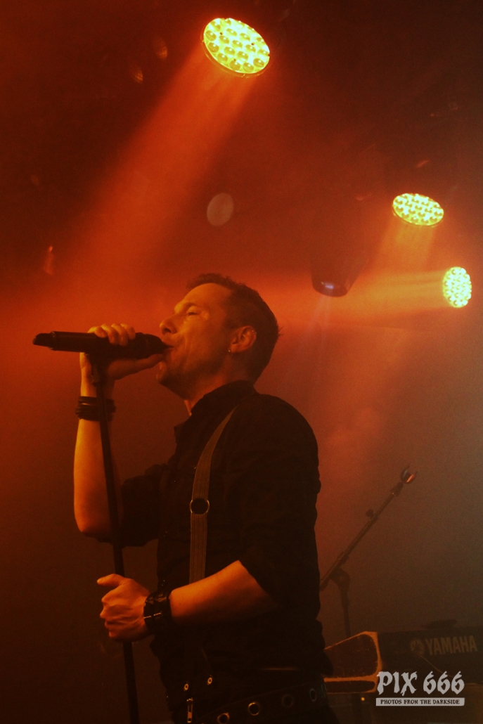 Der zweite Festivaltag wurde von der einheimischen Band Ten After Dawn eröffnet. Als die Band zu spielen begann, war der Club halbvoll. Bis zum Ende des Auftrittes war es dann richtig gut gefüllt. Ein würdiger Rahmen für die Dark Electro Formation aus Helsinki. Ten After Dawn sorgten für gute Stimmung und begeisterten die Anwesenden mit ihrem tollen, eingängigen Electropop. Neben Sänger Teemu, der zu Beginn mit einer coolen Lederjacke auf der Bühne stand, gehören zu der finnischen Band noch ein Keyboarder und ein Bassist. Die ersten Songs waren gleich relativ flott, als der Sound dann immer flotter wurde, und die Melodien eingängiger, tanzten nun nicht nur die Fans in den ersten Reihen. Teemu zog dann auch bald seine Jacke aus und spielte im schwarzen Hemd weiter – das war besser so, denn es wurde immer wärmer im Club. Ten After Dawn spielten natürlich auch ihre neue Single ‚Club‘, die vor ein paar Wochen erschienen ist. Die Ansagen von Teemu waren gemischt, teils Finnisch, teils Englisch.
