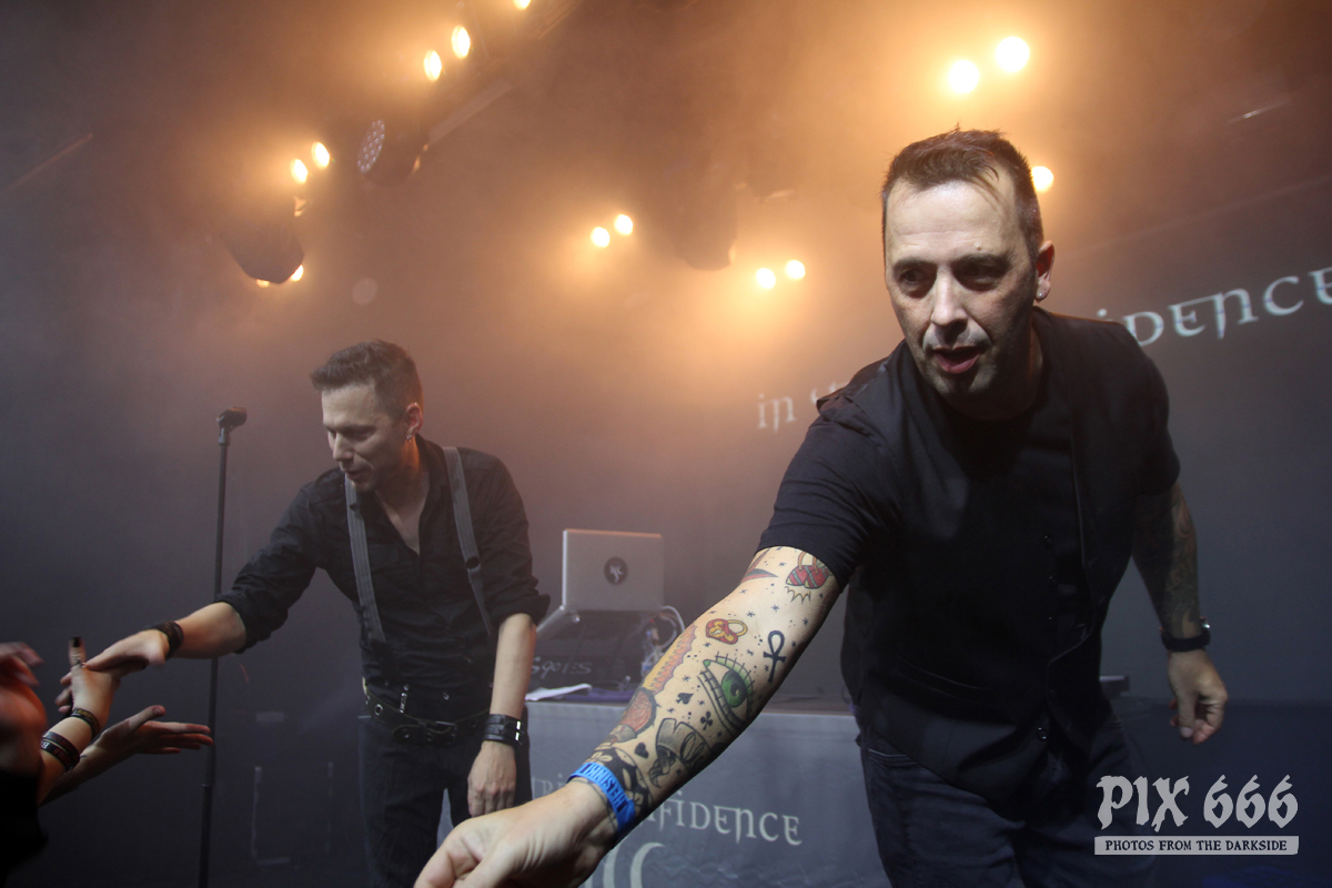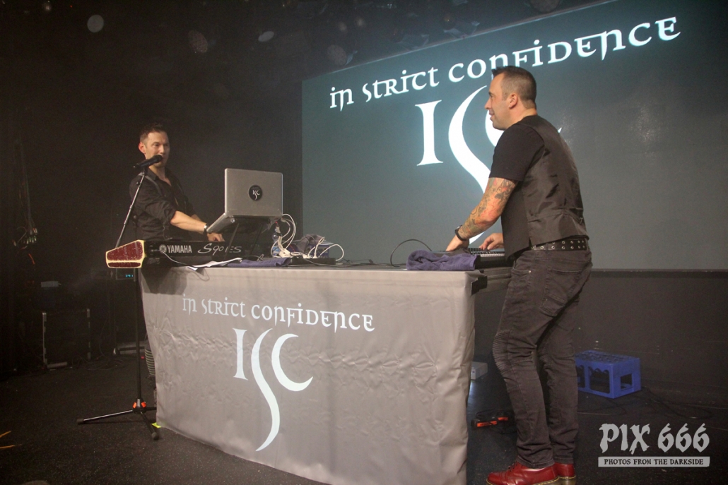 Als krönender Abschluss des ersten Tages waren nun In Strict Confidence an der Reihe. Auch In Strict Confidence waren, wie auch die beiden Bands zuvor, als Duo auf der Bühne. Gitarristin Haydee Sparks hat leider die Reise nach Helsinki nicht mit angetreten. Auch die berühmte Mütze von Sänger Dennis war heute nicht mit dabei, aber das lag an den inzwischen hohen Temperaturen im On The Rocks – Publikum und Stimmung hatten den Club im Laufe des Abends ordentlich aufgeheizt.