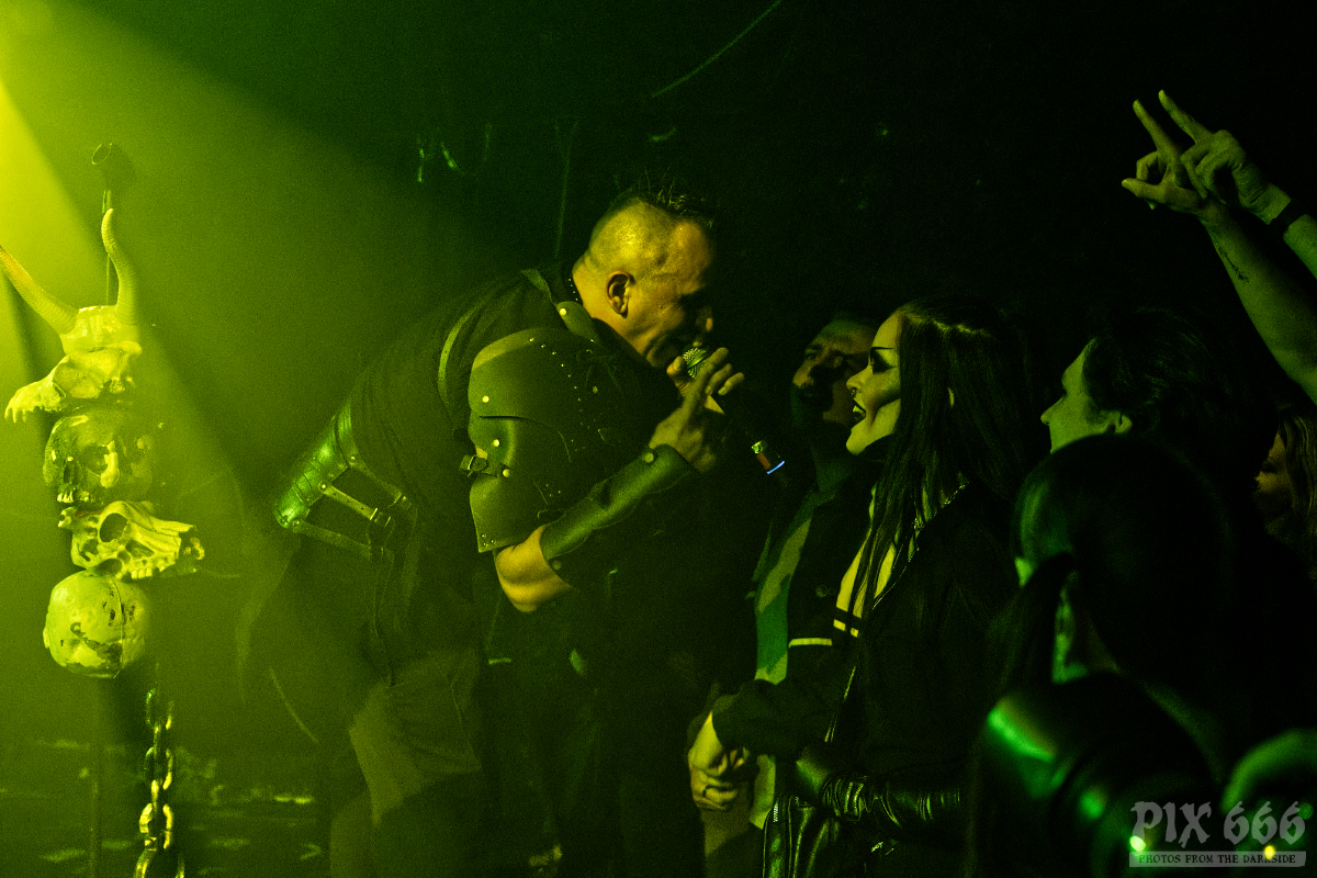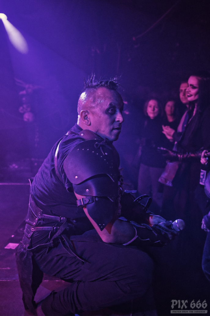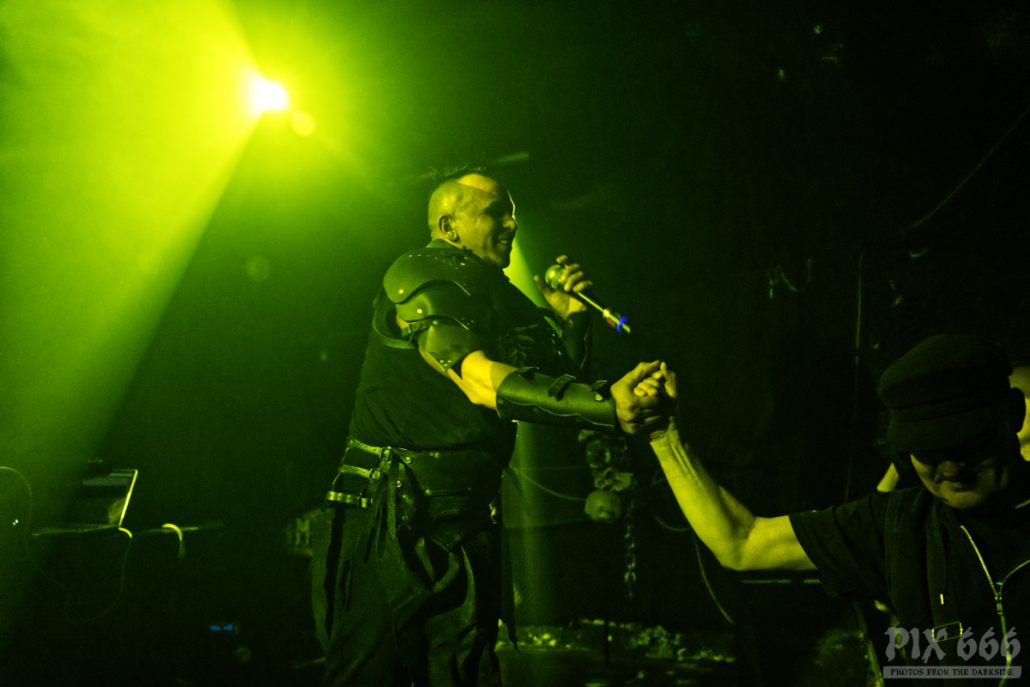 Aber nun wieder zurück in den Viper Room. Es war dunkel, es war äußerst spartanisch dekoriert – es gab nur die pure Show mit der Energie von Sänger Erk Aicrag. … und Energie hatte er auch nach drei Jahrzehnten Hocico noch reichlich – er hopste und sprang wie ein kleiner mexikanischer Teufel über die Bühne – er sprang so wild, dass sich nach einer Weile sogar eine relativ große Platte der Bühnenbretter leicht verschoben hatte. Nun kamen die Jungs von Ǝ.N.D nochmal ins Spiel. Sie packten kurz an und schoben die Bretter wieder zusammen. Sogar der schicke Mikrofonständer mit den Totenköpfen überstand die wilde Party nicht unbeschadet – da ist wohl scheinbar ein Stück vom Horn abgeplatzt. „Seid ihr gut drauf, Wien?“ fragte Erk mehrmals in die Runde. Das Publikum im richtig gut gefüllten, aber nicht ganz ausverkauften Viper Room tanzte sich in Ekstase und war mehr als gut drauf. Auch die Band hatte enorm Spaß und immer wieder kam Erk ganz nah zu den Fans und schüttelte sogar hin und wieder die Hände in der ersten Reihe.