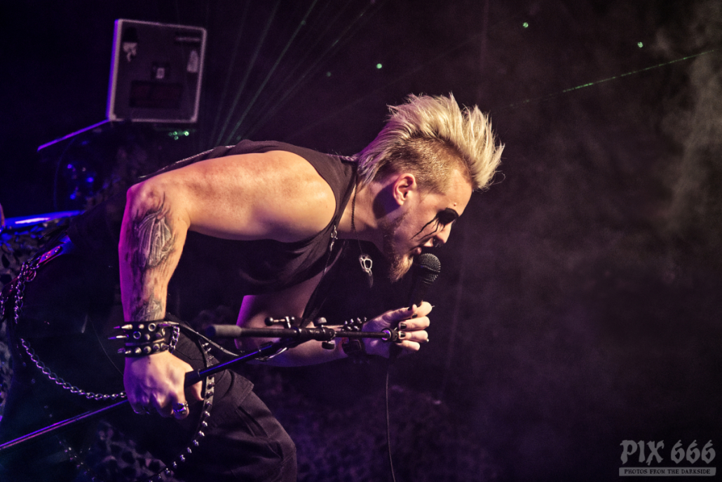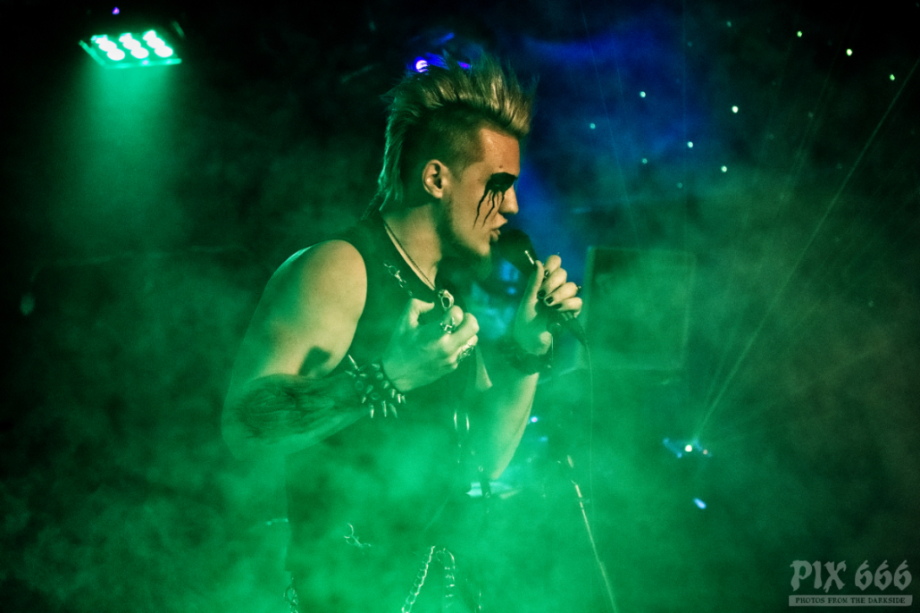 Die Nebelmaschine, schönes Licht und ein grüner Laserstrahl sorgten auch optisch für eine tolle Konzertatmosphäre. Sänger misantropX filmte dann auch die Fans – aber nicht nur von der Bühne aus, er drehte auch gleich eine Runde durchs Publikum. Und weil es so schön war, ging es später nochmal eine Runde durch die tanzende Menge, dieses Mal wurden Bandaufkleber verteilt – eine coole Idee. Nach 45 Minuten und 11 Songs war es das dann mit Ǝ.N.D. Ein Nachteil ist uns noch aufgefallen. Wegen der extravaganten Schreibweise des Bandnamens, findet man Ǝ.N.D nur mühsam im Internet – aber dafür hatte ja jetzt zumindest jeder im Publikum einen Aufkleber, auf dem auch ein QR-Code zu finden ist.