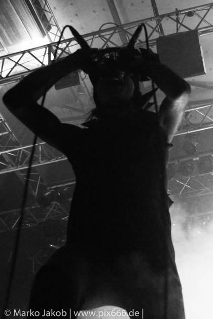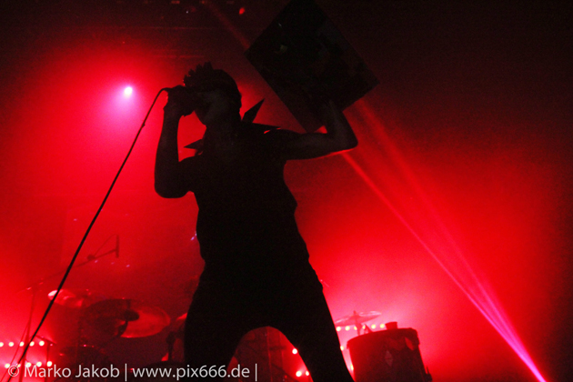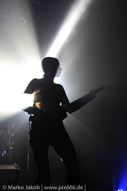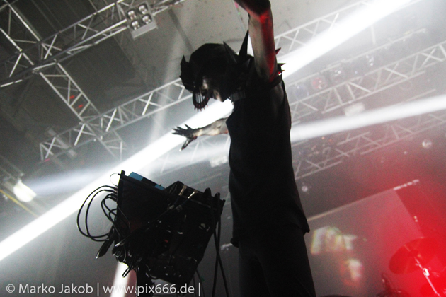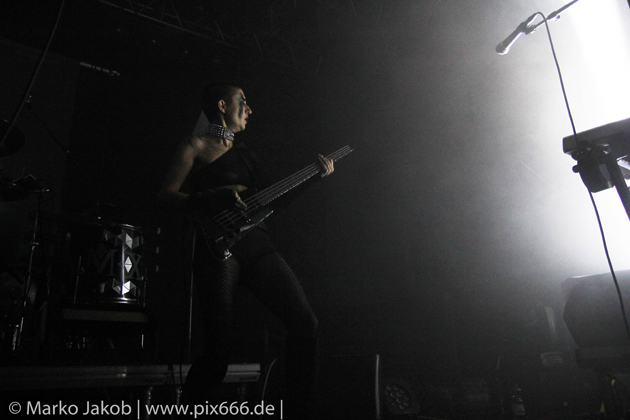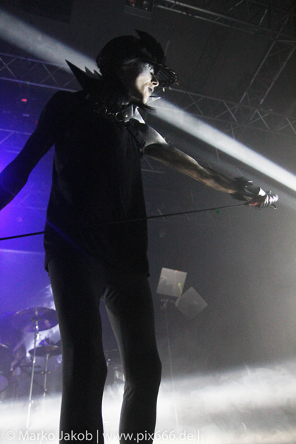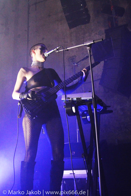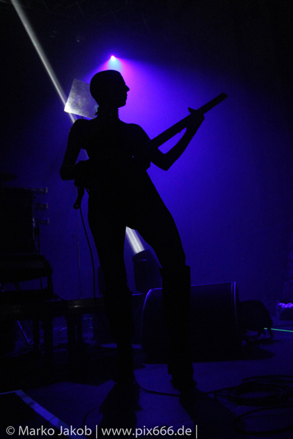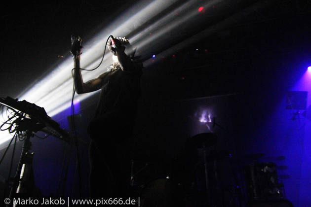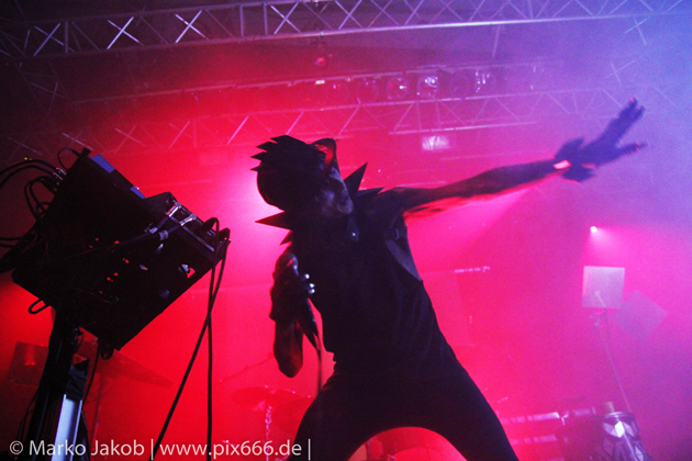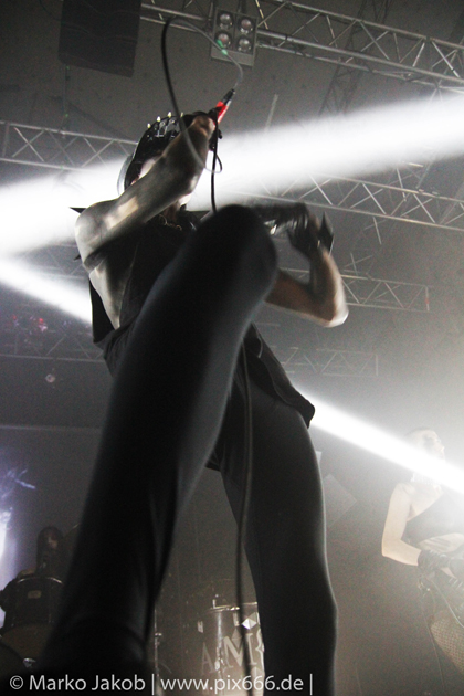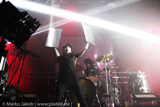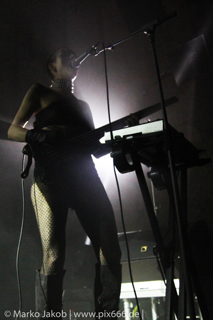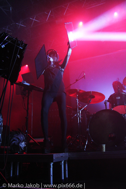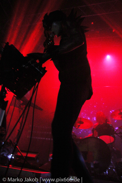 Due to problems with the admissions, the concert began 30 minutes later than originally planned. The Berlin Kesselhaus was filled up right back to the entrance, and there was also a packed crowd up on the gallery. The crowd was mixed – Goths, “normal-looking” people, and also some Chris Corner lookalikes were among the audience. With no support band the show began immediately with IAMX. At the beginning, Chris Corner was using two microphones simultaneously, which looked a bit strange, but also fitting with his cool style. The second song – my favourite song from the current album – was ‘Break the Chain’, and was so good it was hard to focus on taking pictures. The colourful mix of hits from the old albums framed beautifully the great new songs. Did anyone actually see his face tonight? For the most part, Corner and his three colleagues were barely recognizable, as the light on the stage was extremely sparse. This was a shame, as the interesting costumes and accessories of the band were therefore not visible to many in the audience. Chris repeatedly held a mirror in his hand, wielding it like a warrior’s shield, and diverting the glare of the spotlight into the audience.