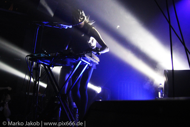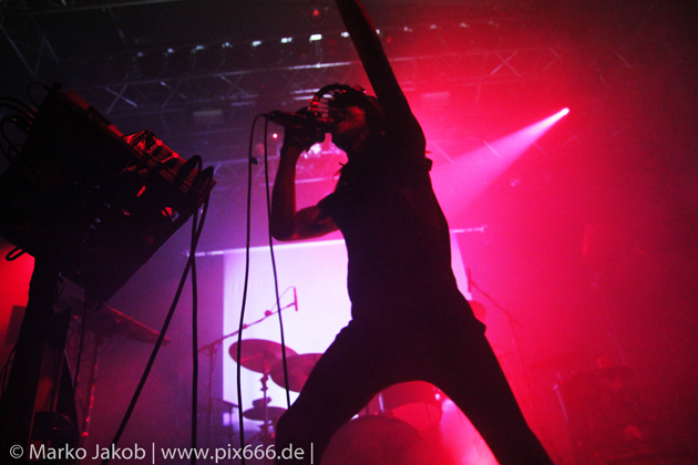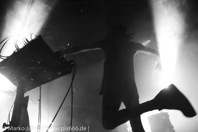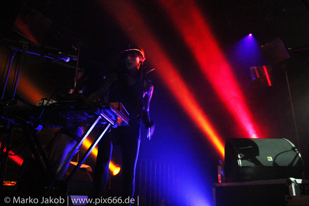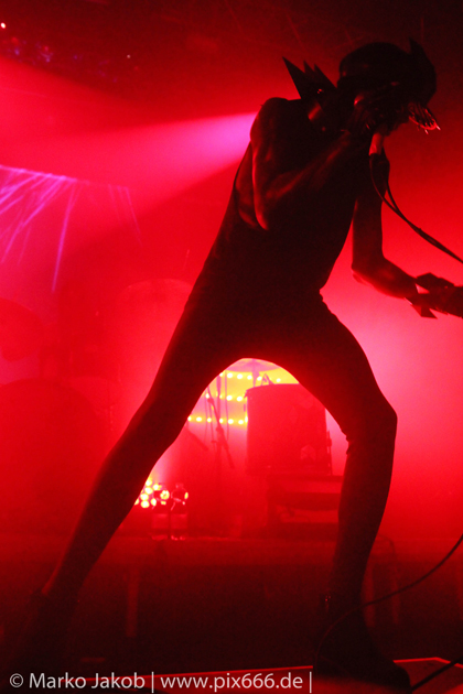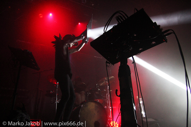 The song ‘Stardust’ was met with huge applause and cheers. ‘North Star’ began with cool beats. The changing of red lights, white illuminated spotlights and absolute darkness began – changing the stage again and again in time to rhythmic clapping throughout the club. The band was obviously having fun on stage, and the delighted audience got exactly what they expected. At the end of ‘Spit It Out’ Chris was flailing his body manically in front of the drums and the two female keyboardists, in their hot pants and fishnet stockings, were also going berserk. The band was now in ecstasy and completely lost in their music. Those on stage had a better view of the audience than the other way round – “I can see you beautiful fuckers” said Corner playfully to the Berlin audience. As a comfort for the fact that one could see so little, at least the sound was breathtakingly clear and mostly the songs sounded better than on the albums. There was also a visual background, with a video wall on stage.