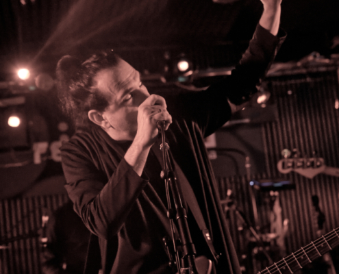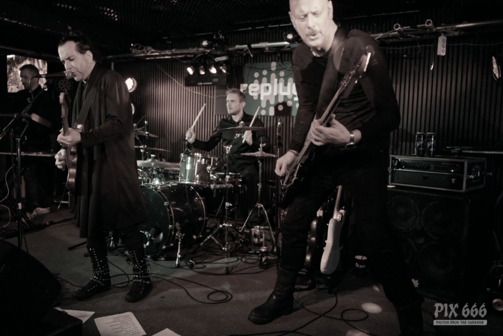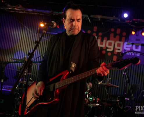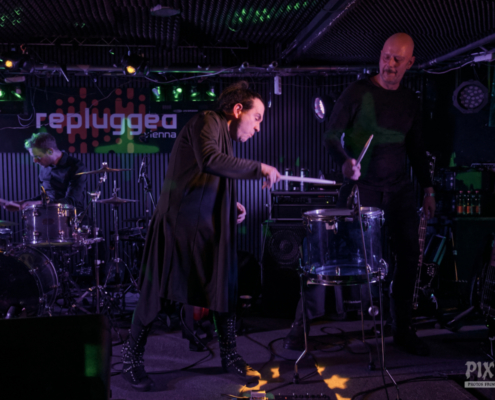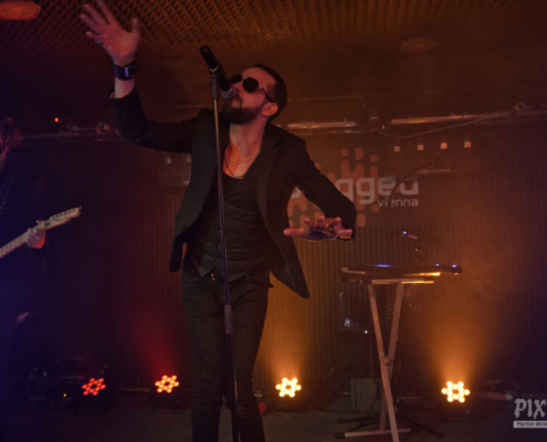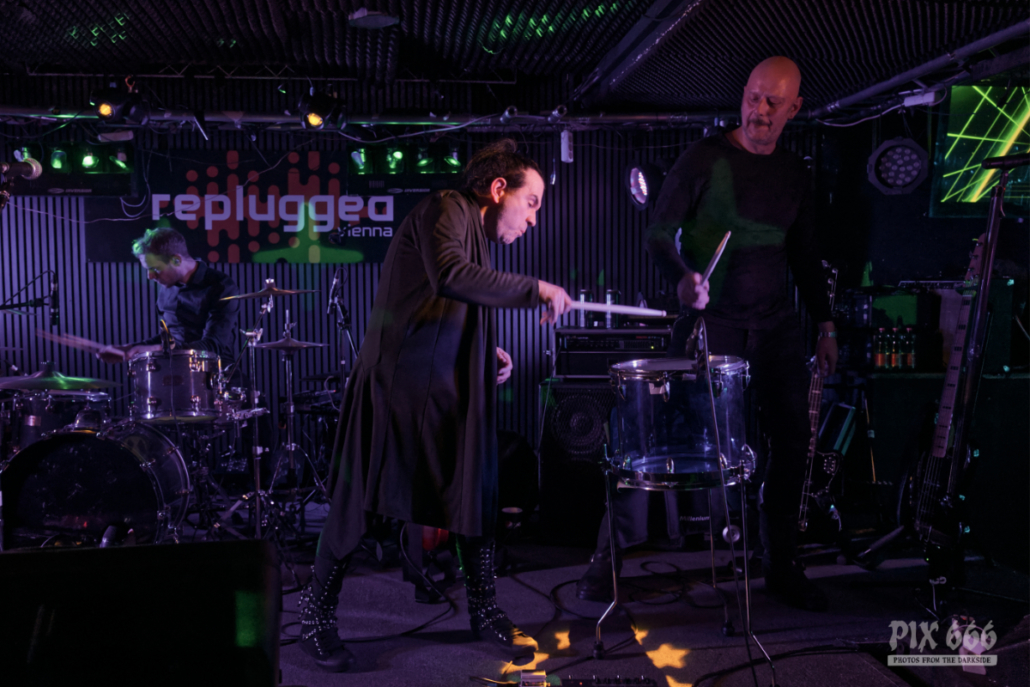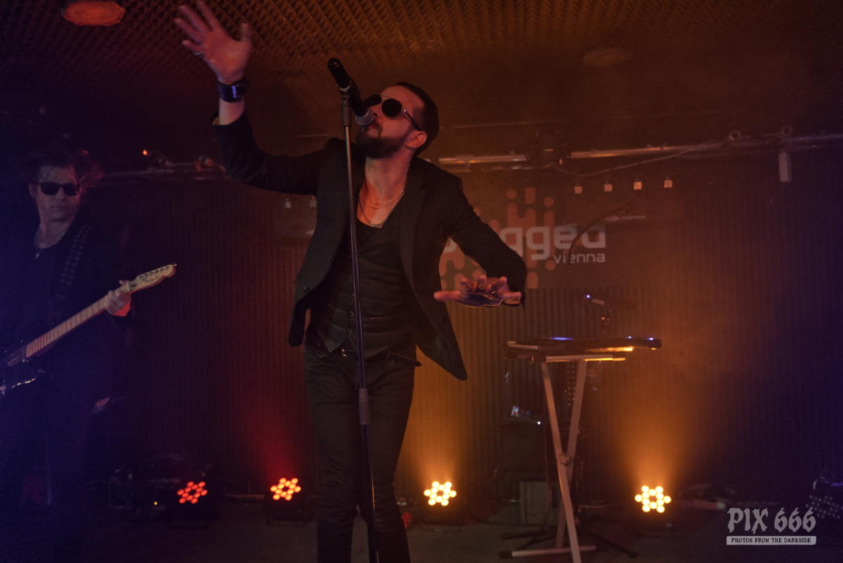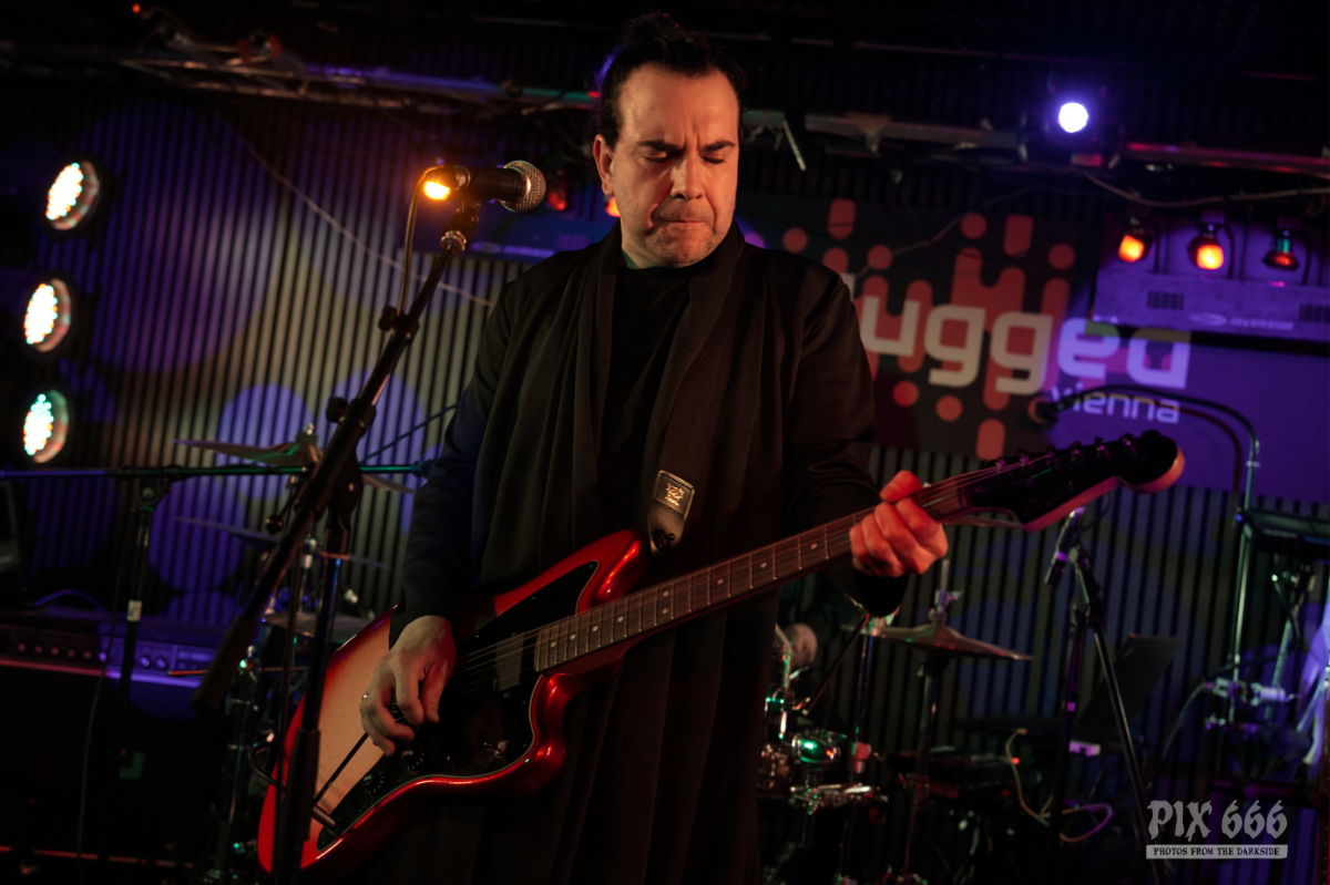 Die Dauerbrenner des Darkwave und Gothicrock standen zuletzt im Herbst des vergangenen Jahres in Wien auf der Bühne und bescherten den Fans im Viper Room mit ihrem hypnotischen Gitarrensound und der markanten Stimme von Sänger Ashley Dayour einen unvergesslichen Abend. Und genau so und nicht anders war es auch im Replugged etwa ein halbes Jahr später. Im Sommer 2023 erschien das bereits elfte Album ‚Ghost‘ von Whispers In The Shadow und die Jungs werden kein bisschen müde, denn die Arbeit am Nachfolger ‚Rapture‘ ist bereits in der finalen Phase. Die Band spielte heute Abend im Replugged neben den bekannten und live bewährten Songs auch schon zwei Stücke vom kommenden Album. Eines dieser beiden Songs war ‚Endure‘, mit dem Whispers In The Shadow ihre Show begannen um kurz vor 20 Uhr begannen. Die begeisterten Fans spendeten reichlich Applaus. Bei ‚Back To The Wound‘ rückte dann eine Standtrommel in den Mittelpunkt des Geschehens und bei ‚Lightbringer‘ wurde die Bühne zum ersten Mal so richtig eingenebelt. „Danke fürs zeitige Kommen – ist ja fast wie eine Frühstücksshow“ sagte Sänger Ashley etwa zur Mitte der Show. Mit ‚Illusions Of Grandeur‘ gab es dann noch einen brandneuen Song zu hören. Weiter ging es dann mit ‚Damned Nation‘ – das Tempo wurde nun wieder ein Bisschen erhöht und die Fans wackelten und tanzten mit. Dann wurde der letzte Song des Abends angesagt. Mit ‚Babylon Rising 1 & 2‘ aus dem Jahr 2008 beendeten Whispers In The Shadow ihren tollen Auftritt und sie waren mit ihrer Klasse und über sechzig minütigen Show definitiv mehr als nur ein ‚normaler‘ Support Act bzw. Special Guest.