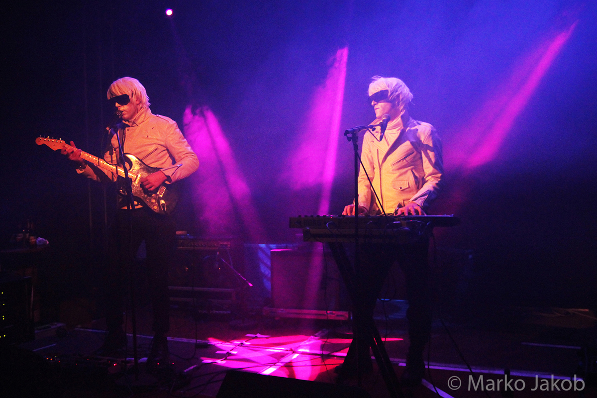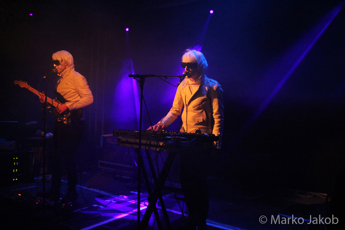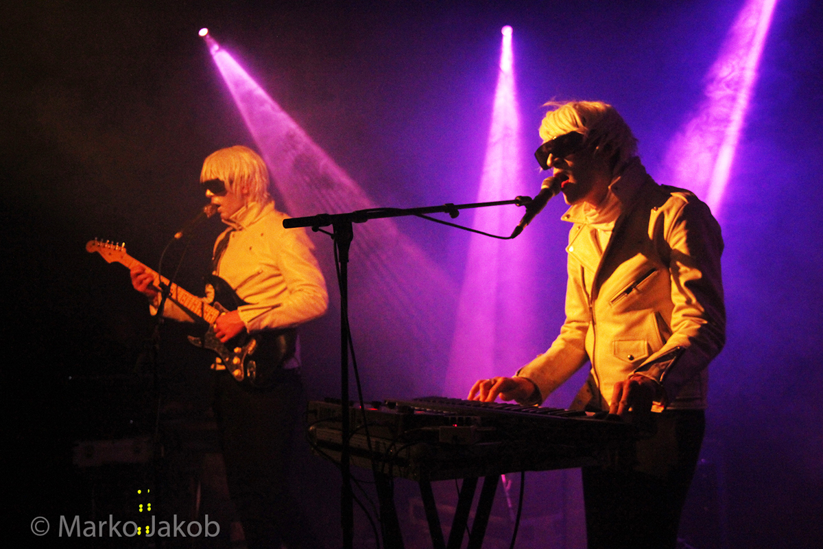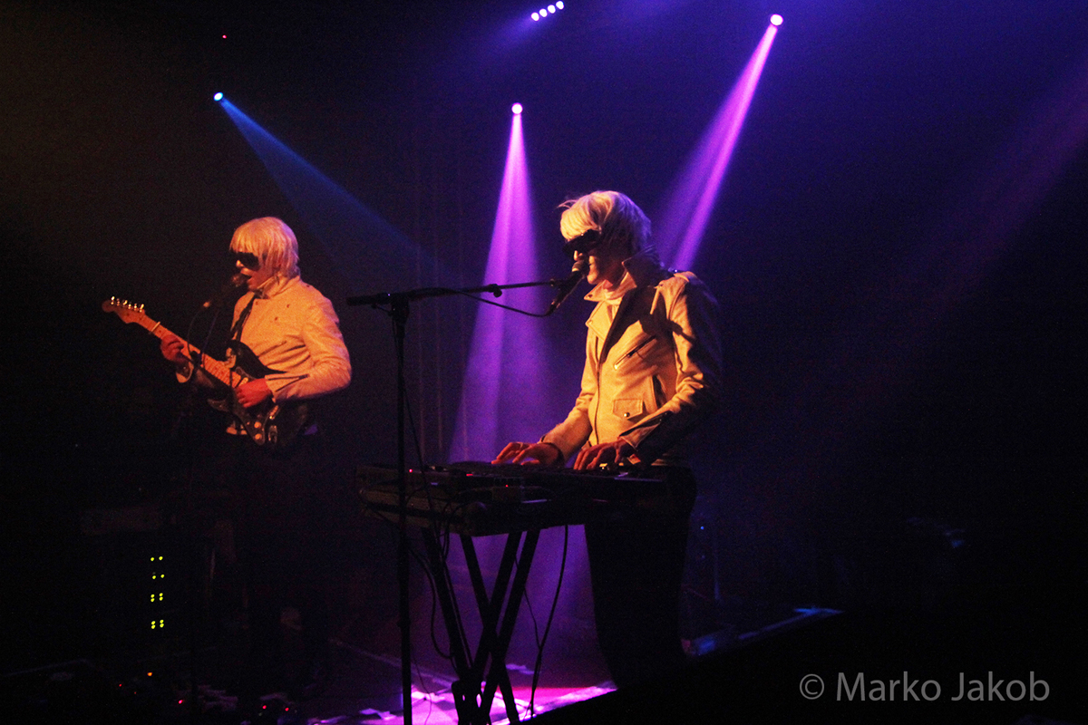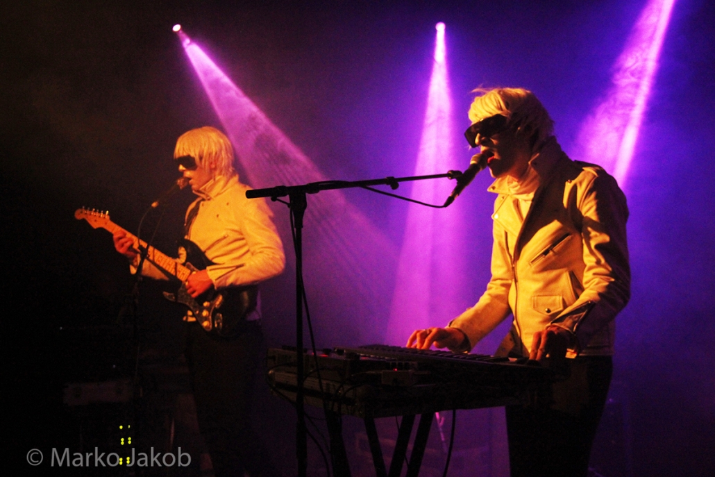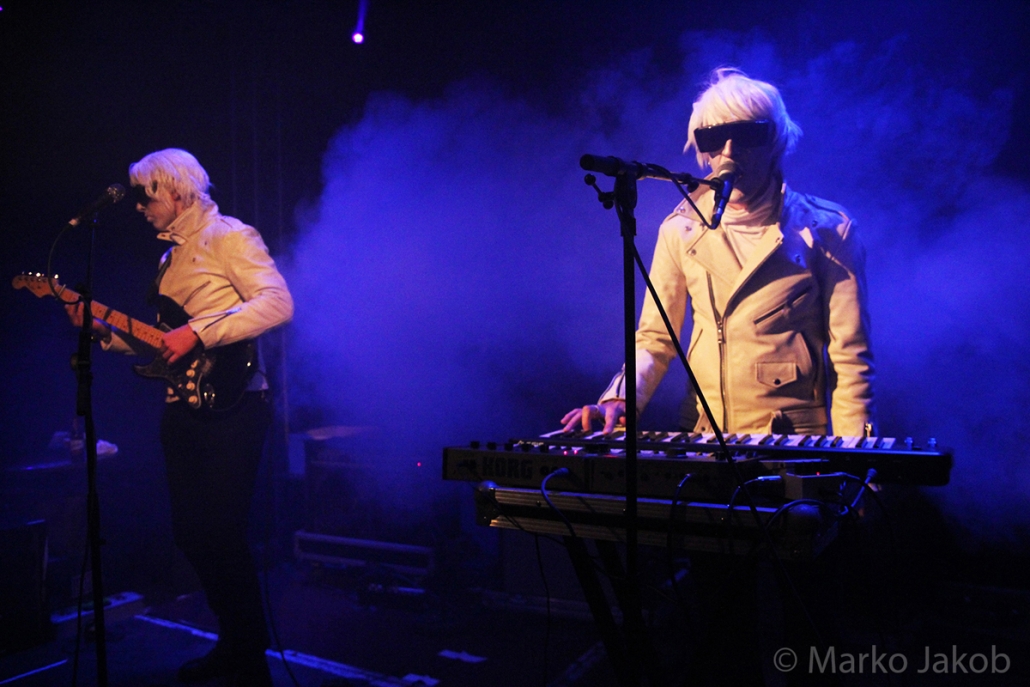 Genau um 22 Uhr war es, als sich die Bühne in Nebel tauchte. Kurz darauf wurden die beiden Musiker allmählich sichtbar. Bereits optisch zeigt sich, was das Publikum erwarten wird: Silbern geschminkt, mit weißen Lederjacken und mit hellen Perücken ausgestattet, wird das Outfit von überdimensionalen schwarzen Sonnenbrillen, die wie aus einem Science Fiction Film aussahen, komplettiert. Durch diese markante Optik sahen Deb DeMure (voc/Gitarre) und Mona D (back voc/Synth) von weitem fast wie Zwillinge aus dem nächsten Jahrtausend aus.