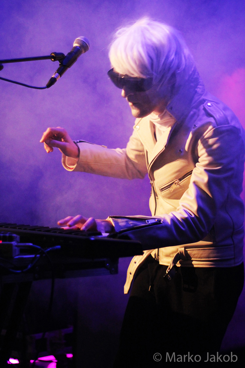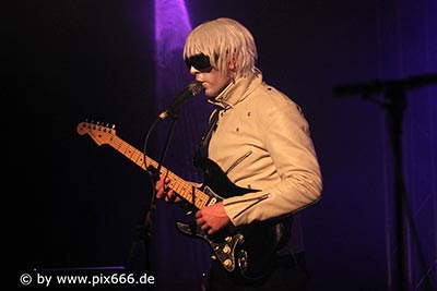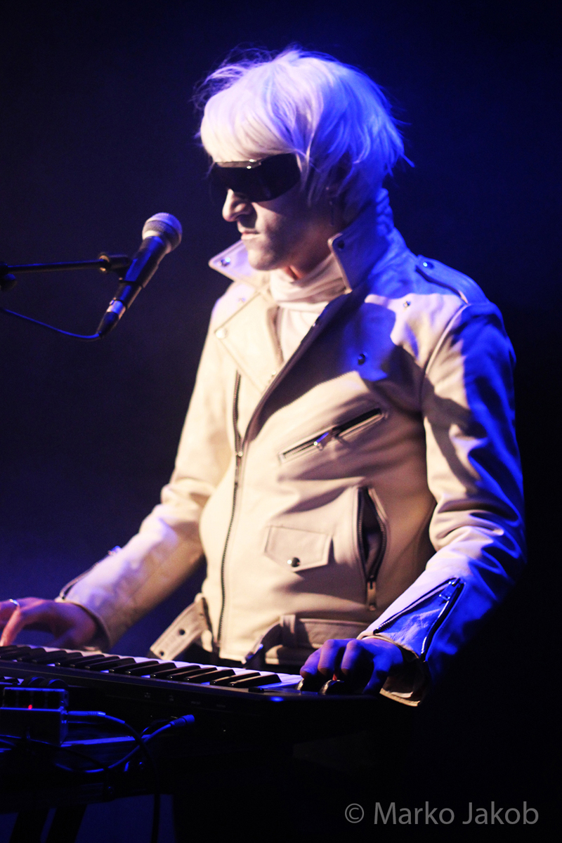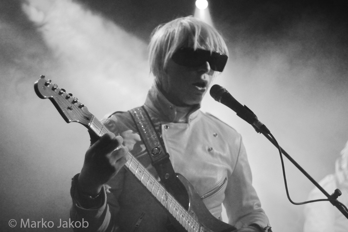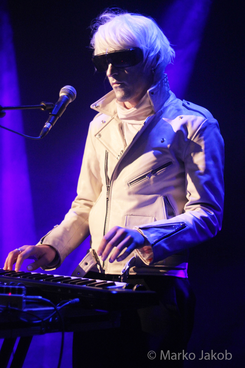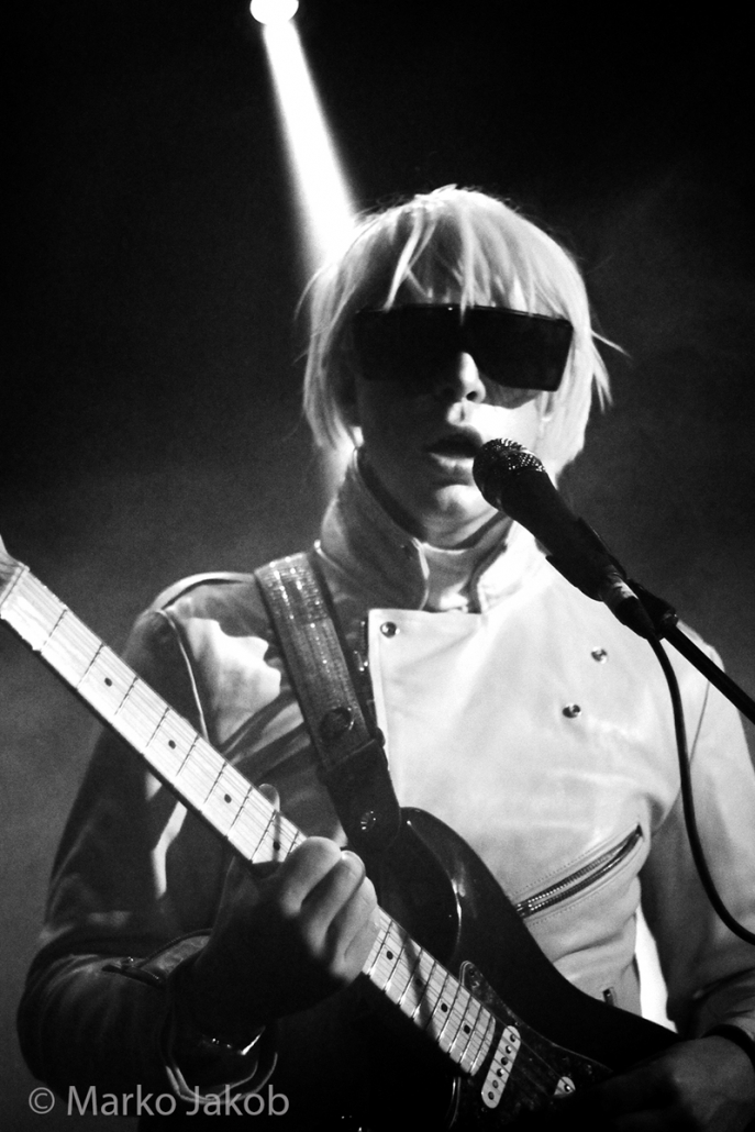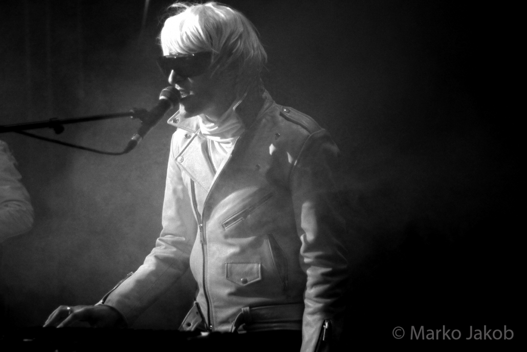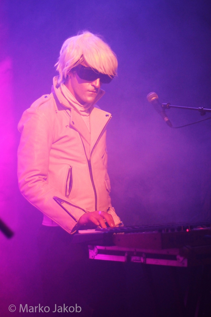 Genau um 22 Uhr war es, als sich die Bühne in Nebel tauchte. Kurz darauf wurden die beiden Musiker allmählich sichtbar. Bereits optisch zeigt sich, was das Publikum erwarten wird: Silbern geschminkt, mit weißen Lederjacken und mit hellen Perücken ausgestattet, wird das Outfit von überdimensionalen schwarzen Sonnenbrillen, die wie aus einem Science Fiction Film aussahen, komplettiert. Durch diese markante Optik sahen Deb DeMure (voc/Gitarre) und Mona D (back voc/Synth) von weitem fast wie Zwillinge aus dem nächsten Jahrtausend aus.