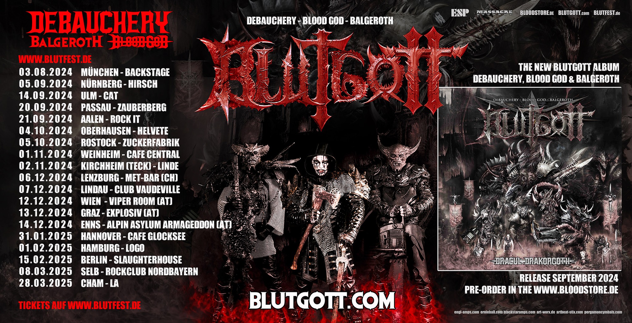 Die Blutfest Shows Tour 2024/25 ist bereits gestartet und macht Mitte Dezember 2024 Station bei uns in Wien. Das Bluttgott Metal Universum, erschaffen von Sänger und Gitarrist Thomas Gurrath, umfasst seine drei Bands Debauchery, Blood God und Balgeroth. Bei dieser geballten Ladung Metal wird am 12.12.2024 der Viper Room Vienna zu beben beginnen. Der Hauptfokus der Tour liegt auf dem Jubiläum 20 Jahre Debauchery und natürlich dem neuen Blutgott Album ‚Dracul Drakorgoth‘. Auf der Digipack 3CD erscheinen je 10 Titel im Gewand der drei genannten Bands.