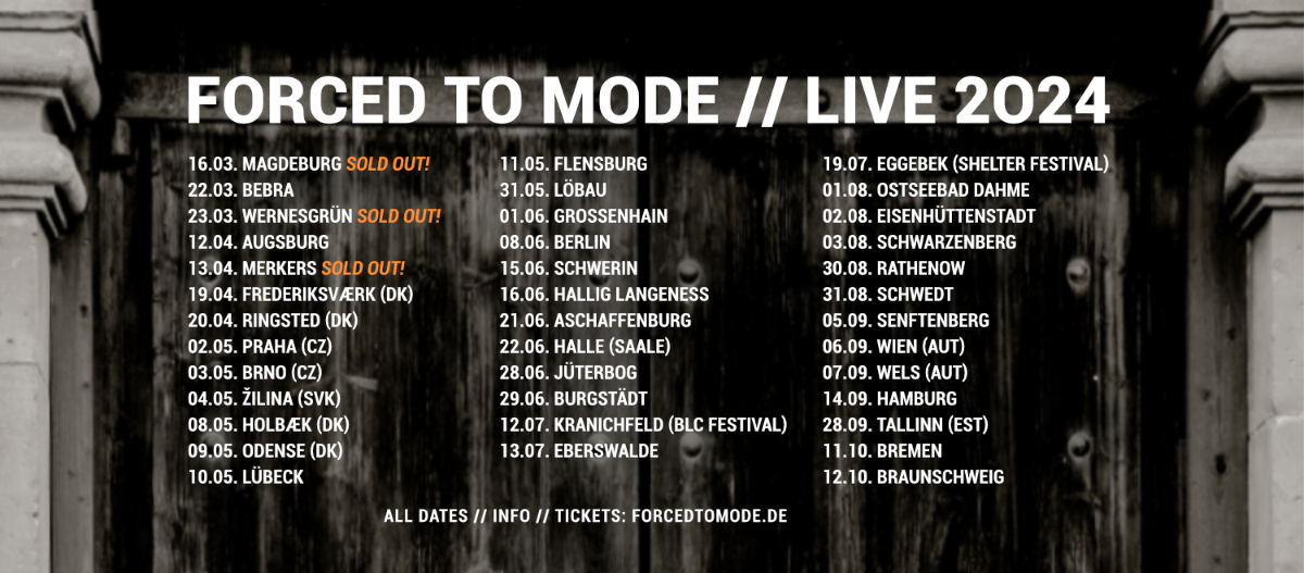 Wir hatten die Möglichkeit, Forced To Mode bereits in Locations und bei Events zu erleben, die unterschiedlicher nicht sein konnten. Da war zum Beispiel der Auftritt beim legendären Gothic Meets Klassik gemeinsam mit Symphonieorchster, oder die ergreifende Show im Babylon Berlin, einem fast 100 Jahre altem Kino. Aber auch beim Open Air Auftritt in Schwedt oder beim klassischen Clubauftritt im Columbia Theater wussten Forced To Mode genau, wie man das Publikum elektrisiert.
