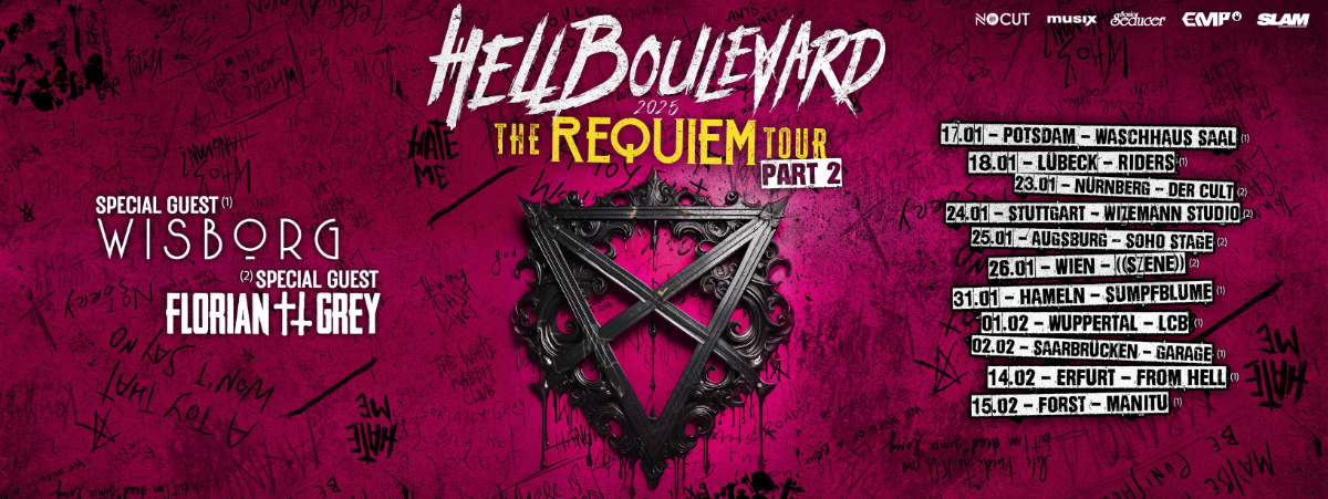 Ende des Jahres 2024 gibt es einen Grund zu feiern für Hell Boulevard. ‚A Decade in Hell‘ ist der Titel ihrer beiden Shows anlässlich des 10-jährigen Bandjubiläums. Einige Wochen später stehen die Jungs um Sänger Matteo Fabbiani dann bei uns in der ((Szene)) Wien auf der Bühne. Mit dabei werden sie ihr aktuelles Album ‚Requiem‘ haben, mit dem sie bereits im Frühjahr 2024 den ersten Teil der Tour absolvierten. Die Shows der Band sind jedes Mal ein unvergleichliches Erlebnis. Die Mischung aus Hell Boulevard Klassikern und neuen Stücken wird das Publikum mit Sicherheit in Ekstase versetzen. Als Support bringen Hell Boulevard ihre Freunde von Florian Grey mit nach Wien. Die Band aus Deutschland hat im letzten Jahr ihr aktuelles Album ‚Destroying Kingdoms‘ veröffentlicht. Die Wege der beiden Bands haben sich in den vergangenen zehn Jahren schon des Öfteren gekreuzt. Legendär sind zum Beispiel die Duette von Matteo und Florian, unter anderem bei der ‚A night in Hell‘ Tour 2017 oder beim Wave Gotik Treffen, sowie natürlich gemeinsame Shows als Grey Boulevard.