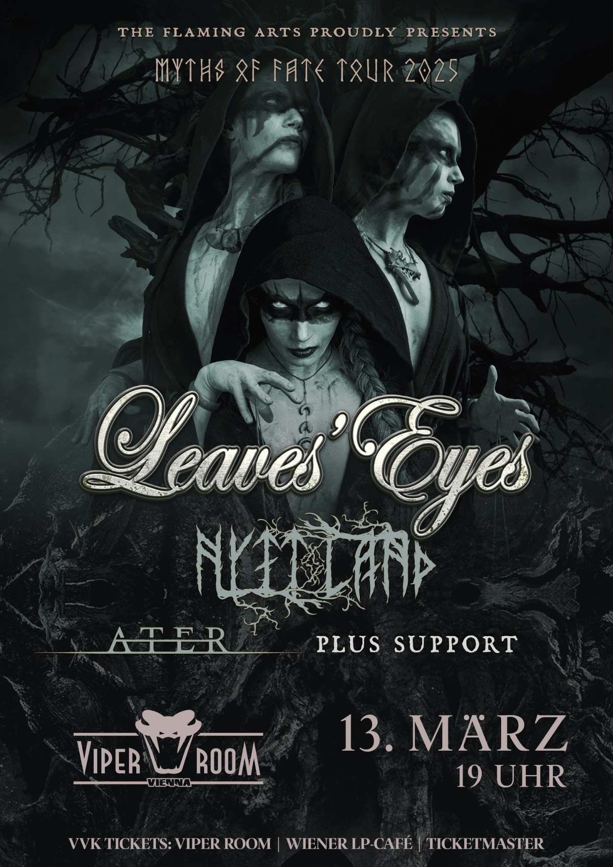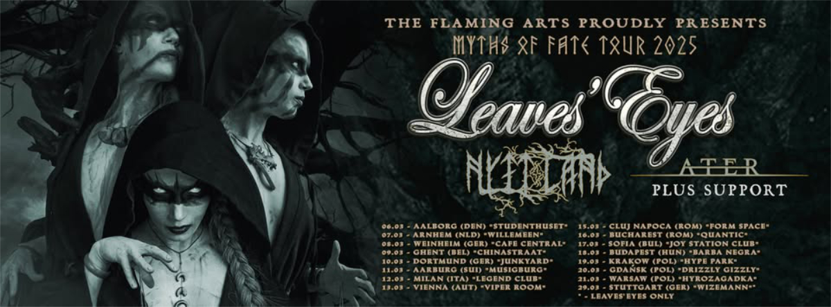 Die ursprünglich für März/ April 2024 geplante Leaves‘ Eyes Tour wurde auf 2025 verschoben, dann auch wieder abgesagt und nun doch neu terminiert und finalisiert. Der für Wien geplante Termin bleibt bestehen, aber die Show wandert von der ((Szene)) in den Viper Room Vienna. Die beliebte Band feierte unlängst das 20. Jahr ihres Bestehens und hat mit ihren bisherigen Alben beachtliche Charterfolge – bis hin zum Sprung in die deutschen Top20 – gefeiert. Auch das aktuelle Werk ‚Myths of Fate‘ stieg bis auf Platz 17 in Deutschland. Während der dreiwöchigen Tour (06.03. – 29.03.2025) mit 16 Stationen werden Leaves‘ Eyes Songs aus dem neuen Album, sowie die Klassiker aus den letzten gut zwanzig Jahren präsentieren.