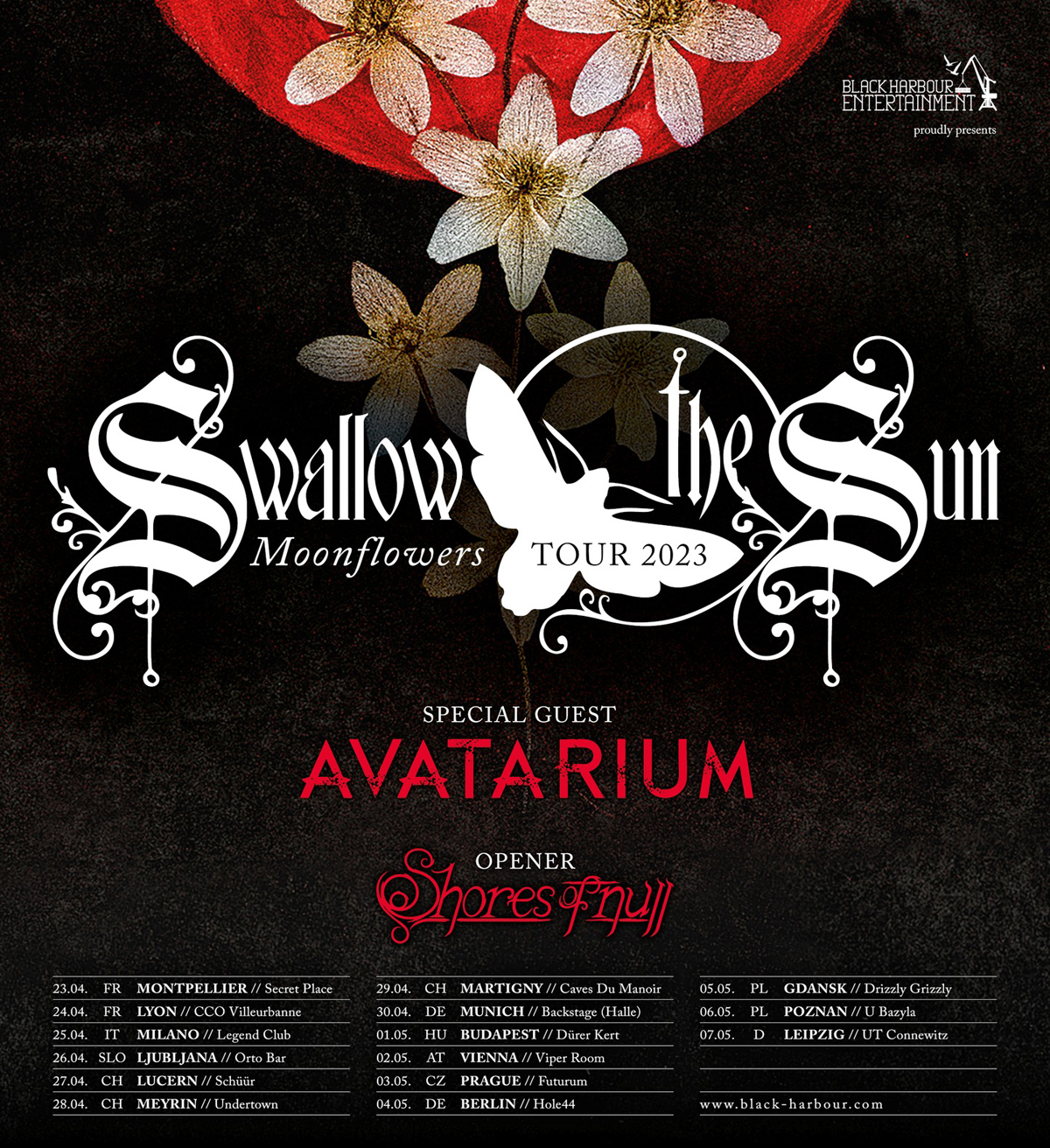 Auf ihrer ‚Moonflowers‘ Tour werden Swallow The Sun im April und Mai 2023 insgesamt 15 Shows in neun verschiedenen Ländern spielen. Das Konzert in Wien wird am 2. Mai im Viper Room stattfinden.