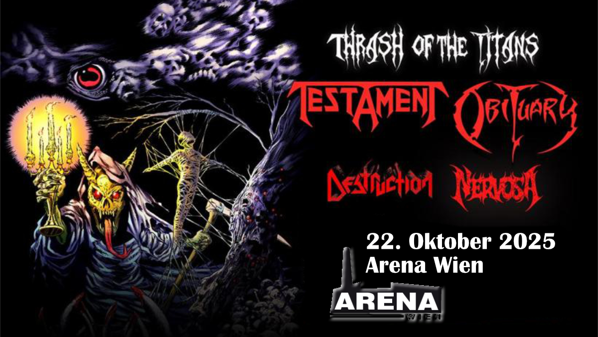 Die Thrash-Metal-Legenden Testament kehren im Herbst 2025 endlich nach Europa zurück und präsentieren sich gemeinsam mit den Death-Metal-Pionieren Obituary auf einer großen Co-Headliner-Tour. Nach einer intensiven Festivalsaison 2024 und der erfolgreichen Tour mit Kreator und Anthrax im vergangenen Jahr führt die Band nun ihre „Thrash of the Titans“ Kampagne in einige der renommiertesten Konzerthallen Europas. Bei uns in Wien findet das Event in der Arena Wien statt.