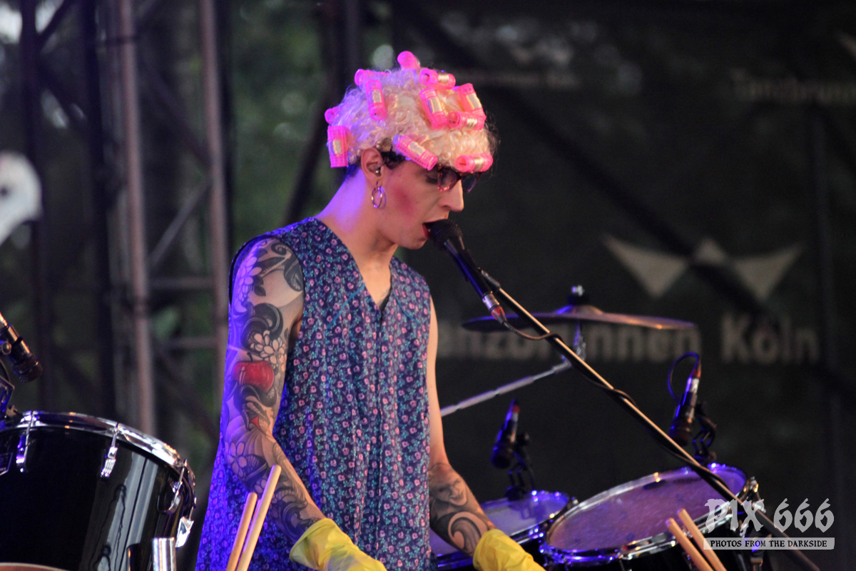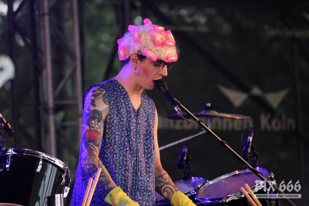 Kurz darauf sagte Sänger Chris Harms: „Das sieht nicht gut aus da hinten, aber wir ziehen durch“. Beängstigend aussehende, dunkle Wolken waren am Himmel über dem Rhein zu sehen. Beim Song ‚Doomsday Disco‘ öffnete der Himmel dann seine Pforten. Nun wissen wir auch, warum im Jahr 1971 diese großen Faltschirme auf das Gelände gebaut worden sind – sie sollten das Publikum vor Wind und Wetter schützen – und genau das war jetzt nötig. Fast alle versteckten sich unter den riesigen Schirmen oder suchten an den zahlreichen Ständen nach Schutz vor den Wassermassen. Nur einige, wenige tanzten ohne den ‚Regenschutz‘ zu den Klängen von ‚Die Tomorrow‘.