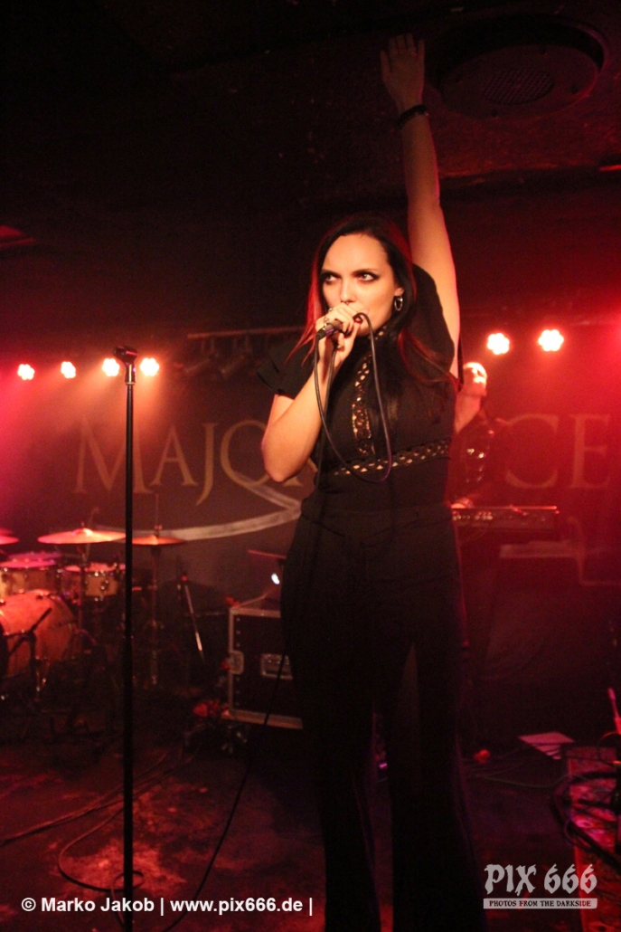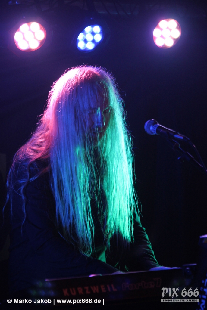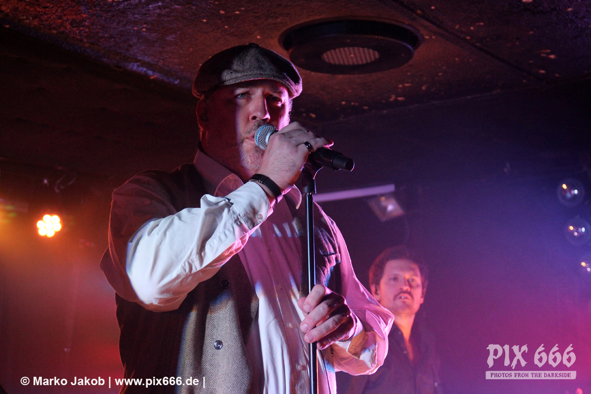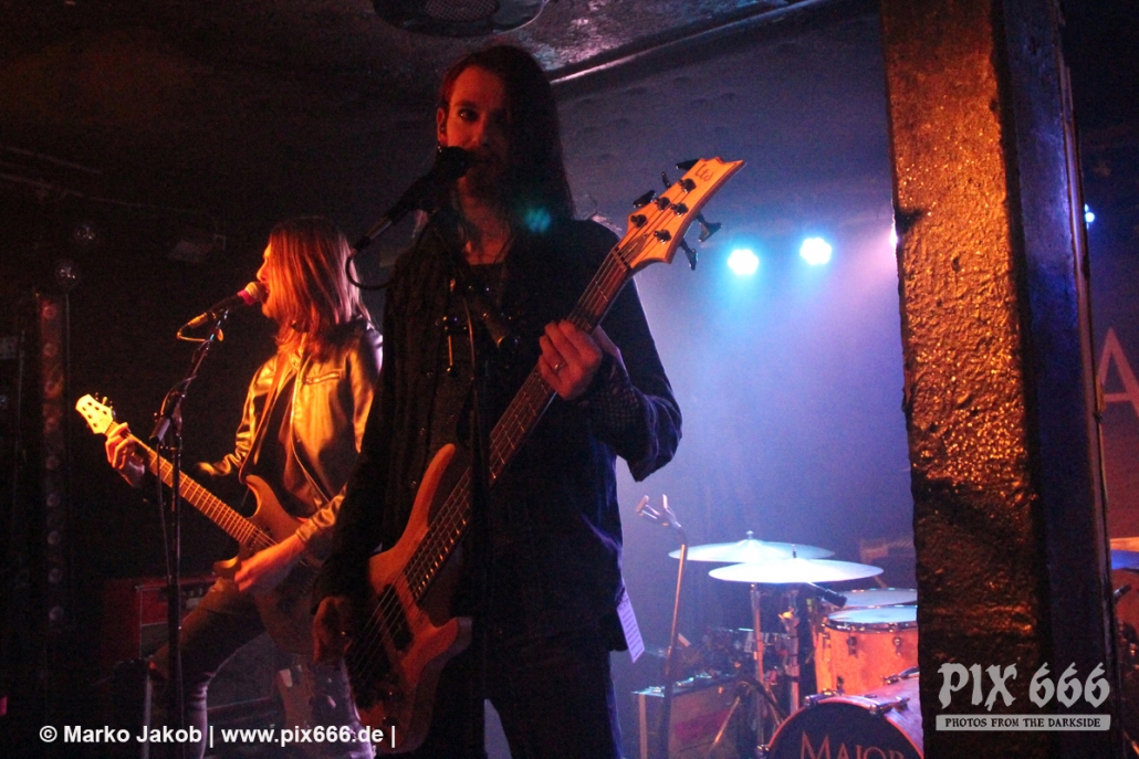 Nach einem kurzen Umbau auf der Bühne ging es pünktlich 21.00 Uhr los. Das Konzert begann mit ‚Butterflies In Dawn‘ vom brandneuen Album ‚This Lonely Ark‘. … und es funktionierte wirklich perfekt, die großartige, tiefe Opernstimme im Zusammenspiel mit Rockinstrumenten. Major Voice hatte sich hinter dem berühmten Pfeiler seine Flasche Bier hingestellt, aber nach nur wenigen Songs hatte er das gute Bier verschüttet und musste erstmal den nassen Fleck wegwischen. Später hatte die Nebelmaschine einen Defekt und die Männer spielten fast 3 Songs lang für die Fans fast unsichtbar – so zum Beispiel auch beim Chris Isaak Cover ‚Wicked Game‘. Rechtzeitig für das Duett mit Celine Hakelberg verzog sich der Nebel wieder etwas. Danach hatte Celine sogar die Chance, dem Publikum ihren eigenen Song ‚Looking For A Lighthouse‘ zu präsentieren. Major Voice sagte: „bevor ich jetzt hier vier Minuten blöd rumstehe, gehe ich mal kurz hinter die Bühne“. Und so hatte Celine die Aufmerksamkeit ganz für sich alleine – und ihr Auftritt wurde mit viel Beifall belohnt.