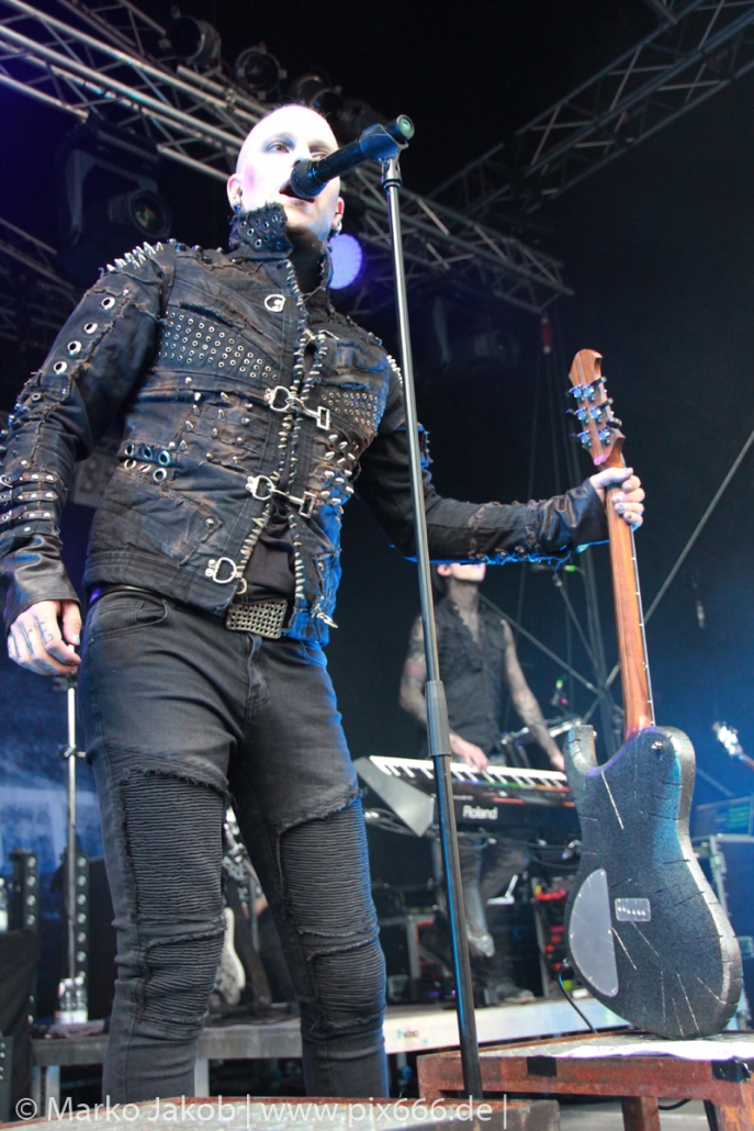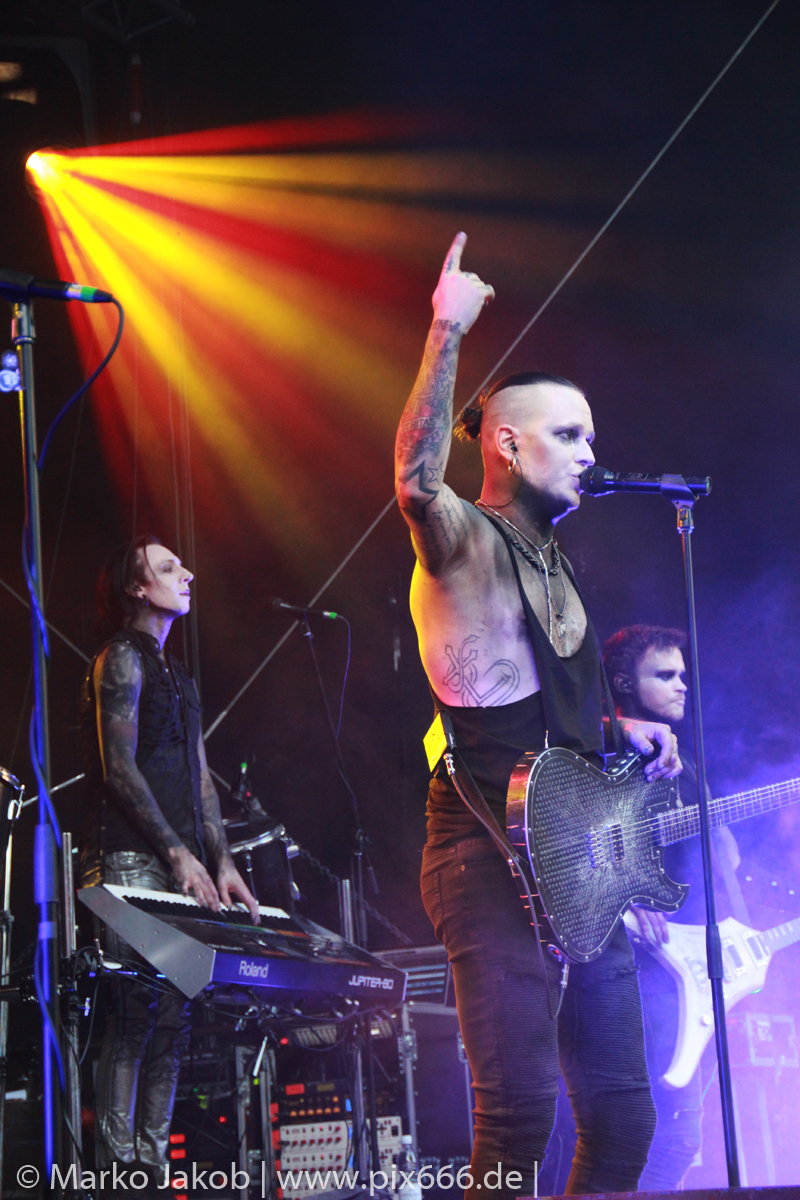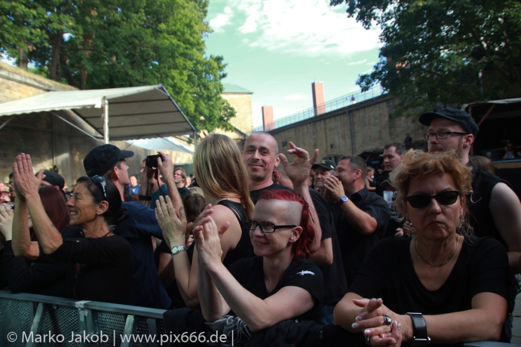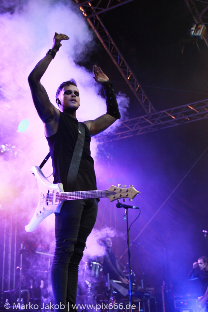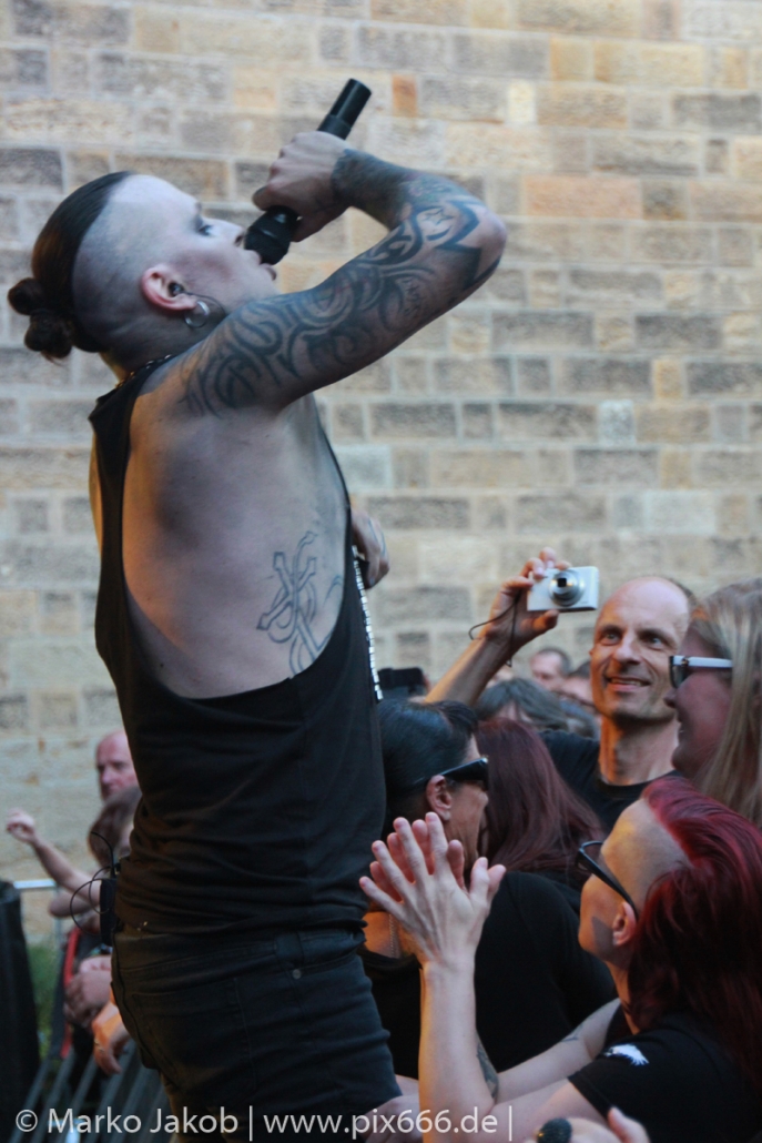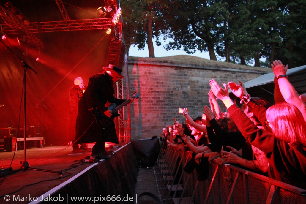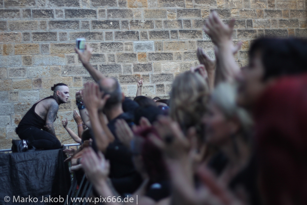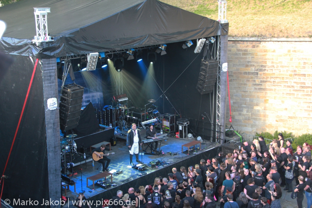 Lord Of The Lost sprühten an diesem Abend nur so vor Spielfreude. Die Jungs legten mit ‚Drag Me To Hell‘ und ‚Miss Machine‘ los wie die Feuerwehr und die Stimmung übertrug sich von Beginn an auf die Fans. Selbst der neue Song ‚Morgana‘ wurde schon von vielen Fans mitgesungen. Bei den Songs ‚Prison‘ und ‚Blood For Blood‘ taten das dann fast alle. Wow – was für eine tolle Konzert Atmosphäre. Open Air, aber doch intim. Etwa 1000 Besucher passen auf das Gelände zwischen den Mauern der Festung.