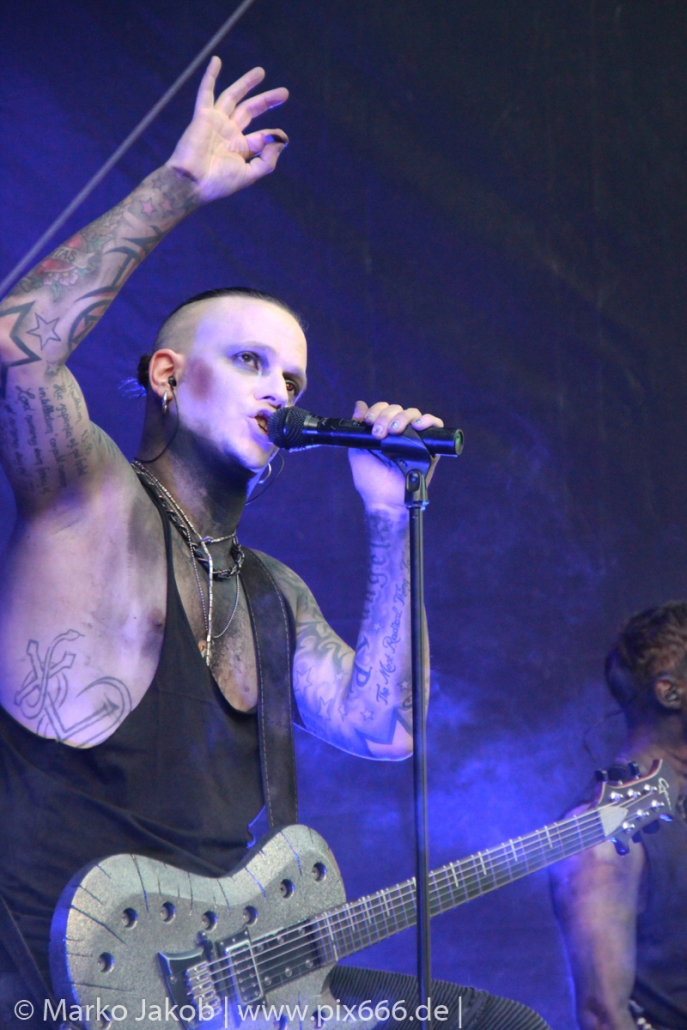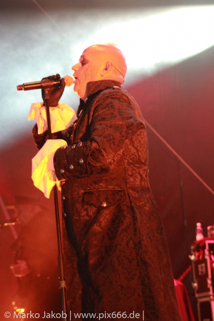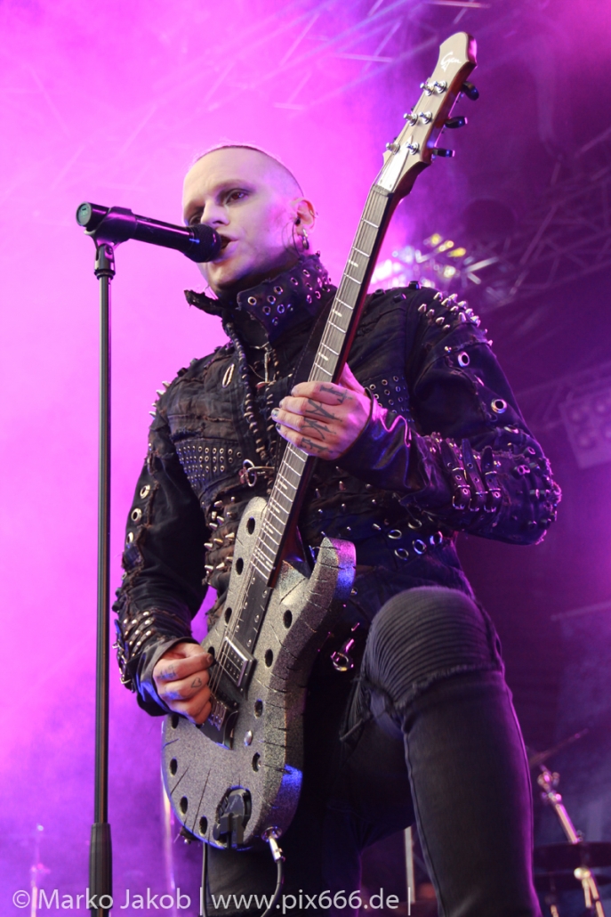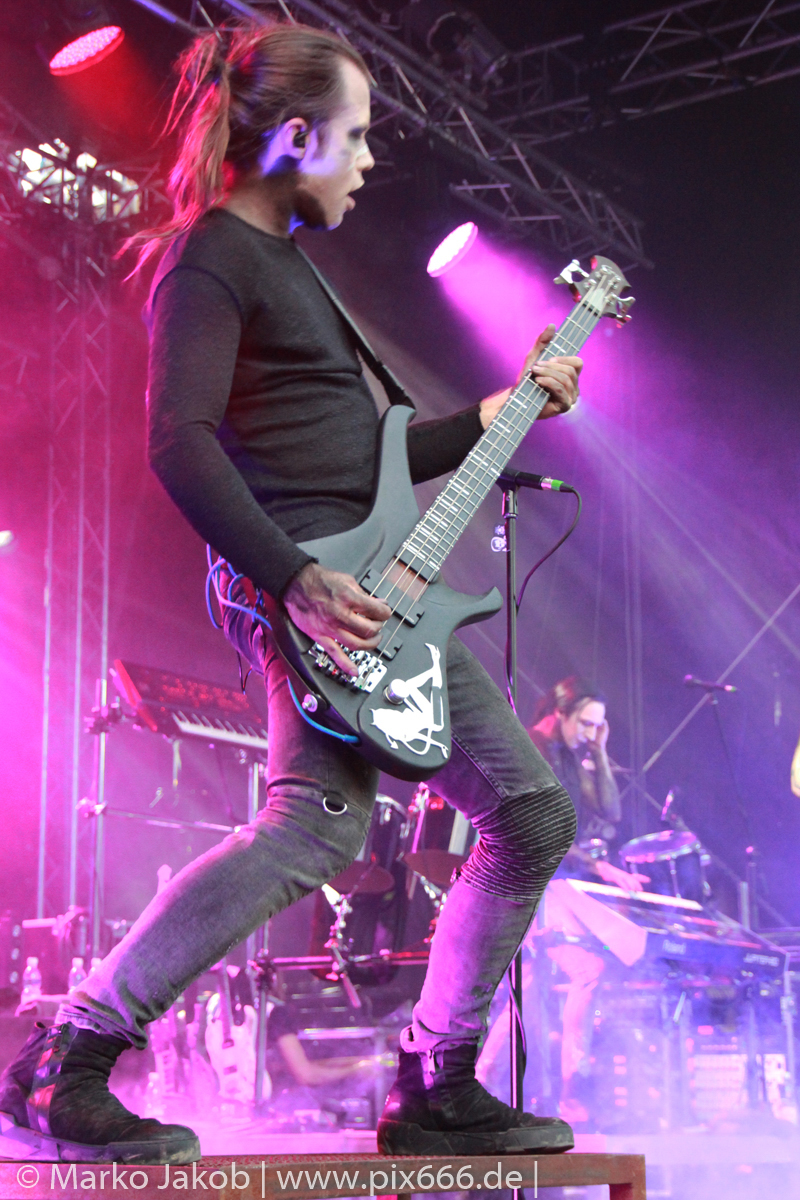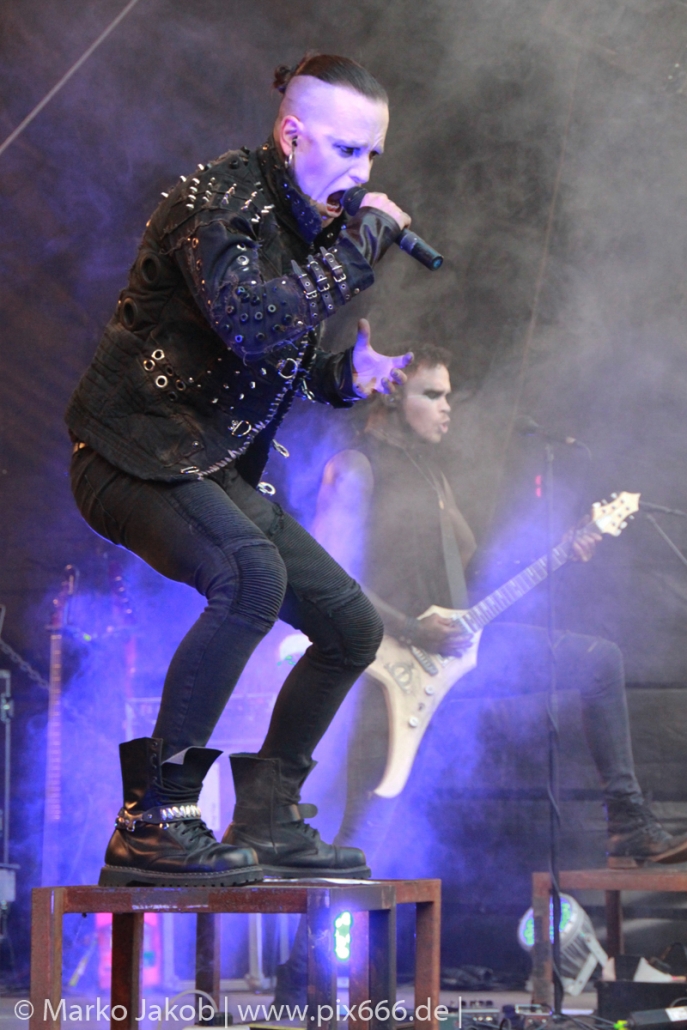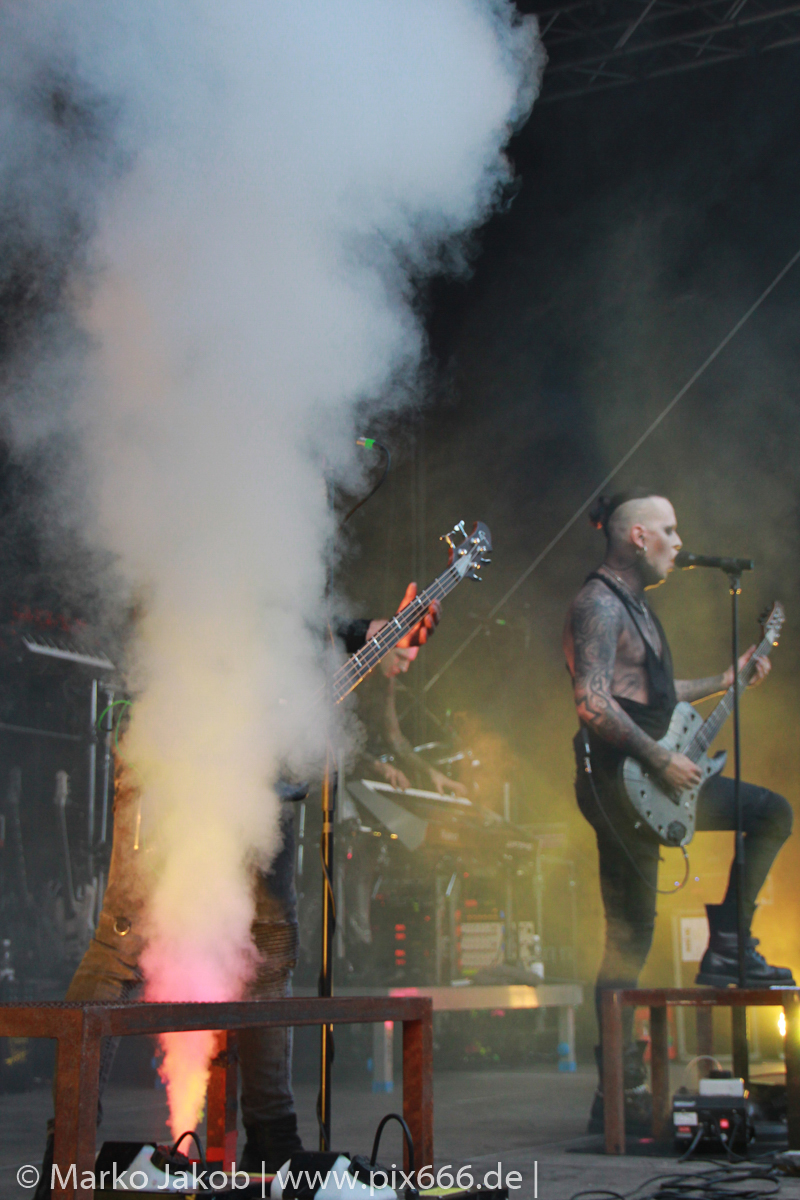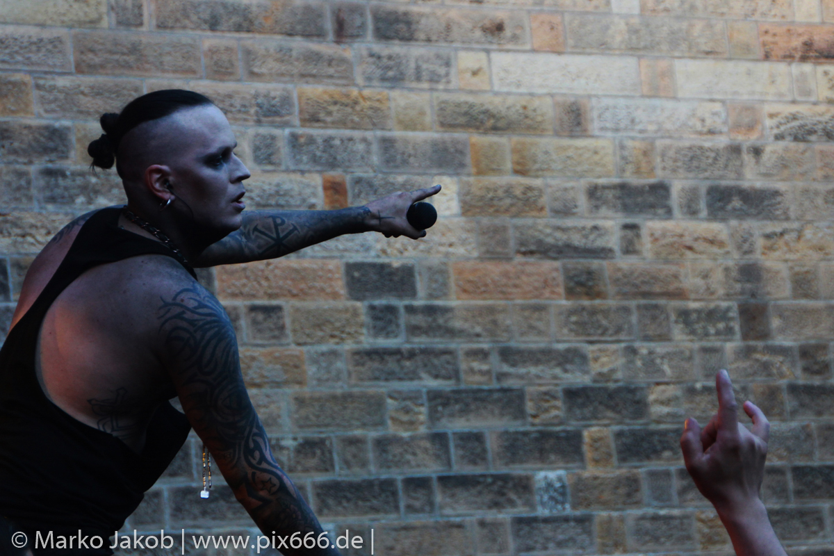 Lord Of The Lost sprühten an diesem Abend nur so vor Spielfreude. Die Jungs legten mit ‚Drag Me To Hell‘ und ‚Miss Machine‘ los wie die Feuerwehr und die Stimmung übertrug sich von Beginn an auf die Fans. Selbst der neue Song ‚Morgana‘ wurde schon von vielen Fans mitgesungen. Bei den Songs ‚Prison‘ und ‚Blood For Blood‘ taten das dann fast alle. Wow – was für eine tolle Konzert Atmosphäre. Open Air, aber doch intim. Etwa 1000 Besucher passen auf das Gelände zwischen den Mauern der Festung.
