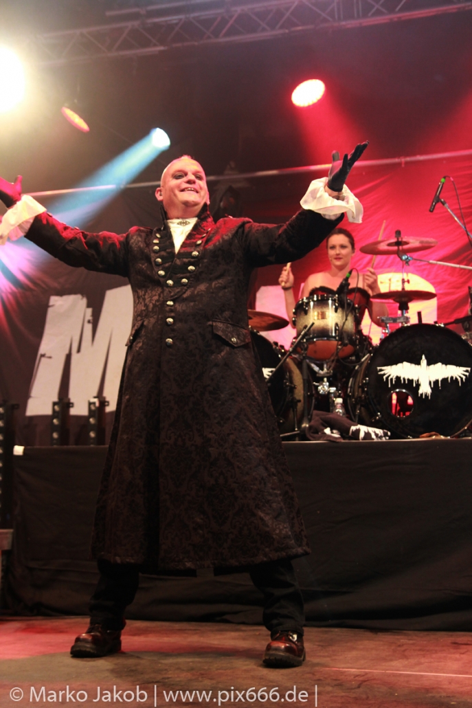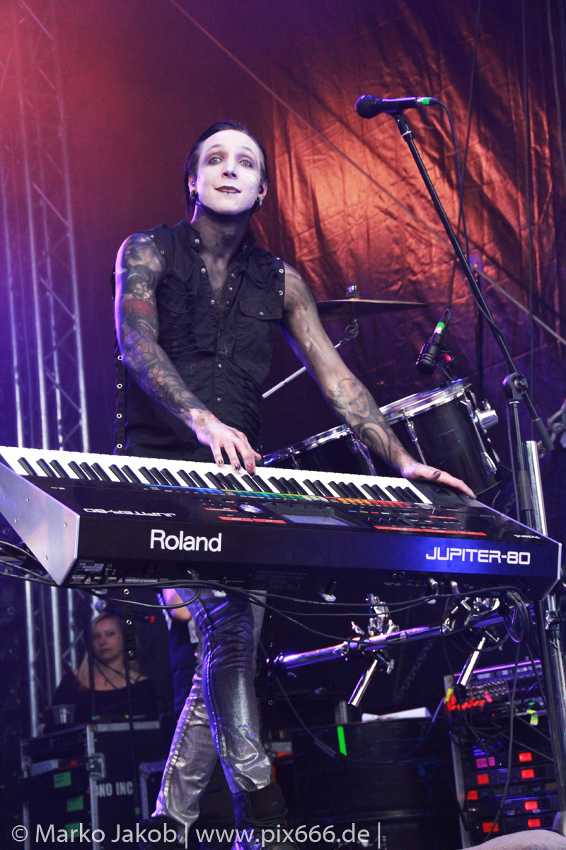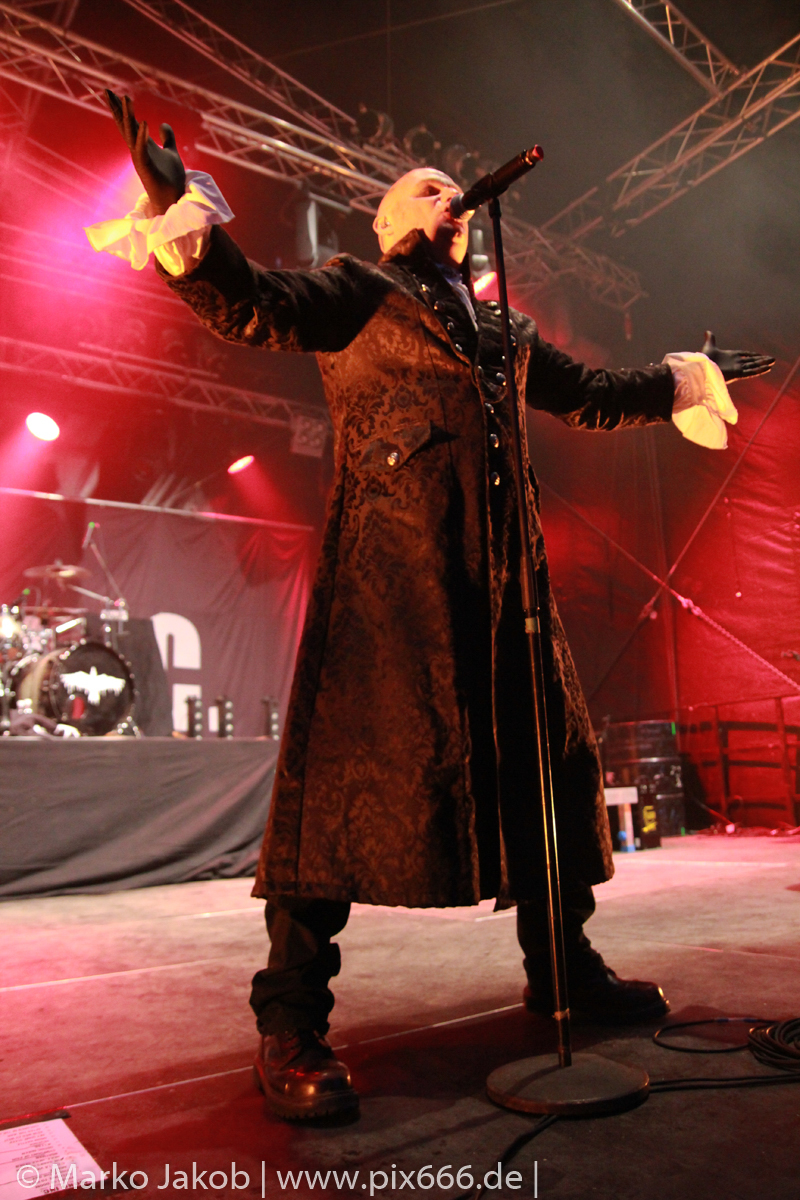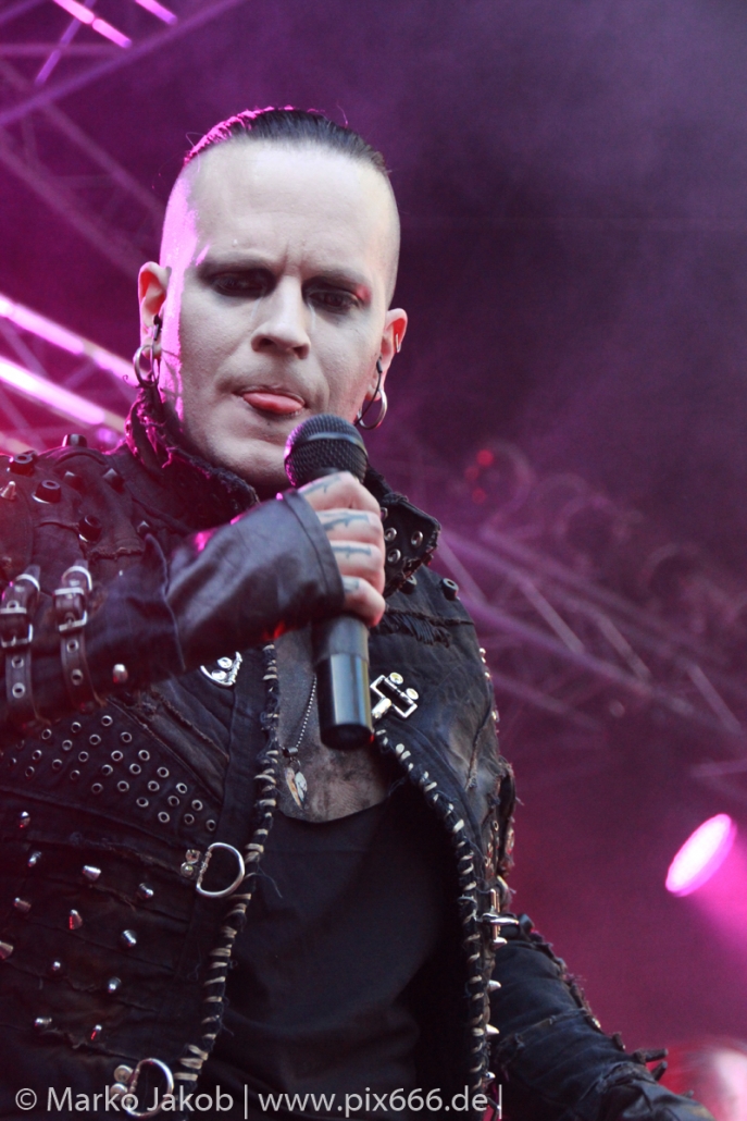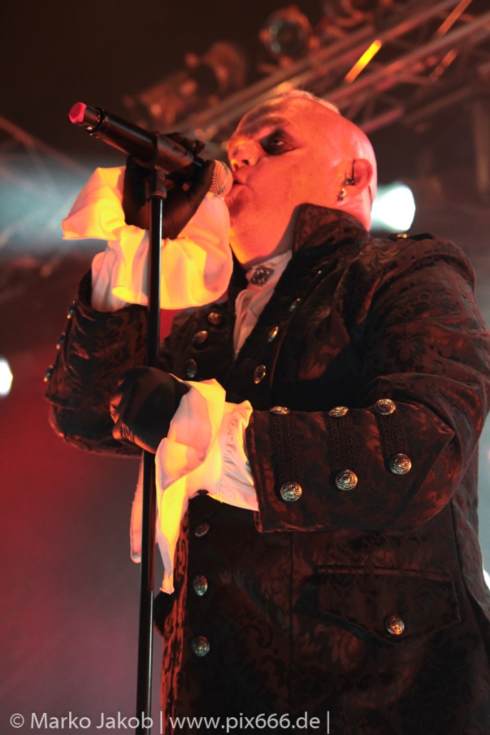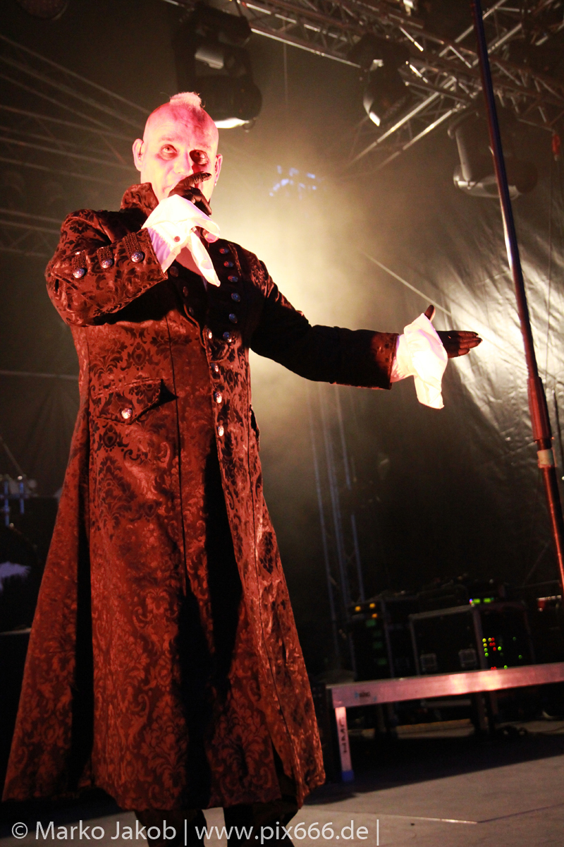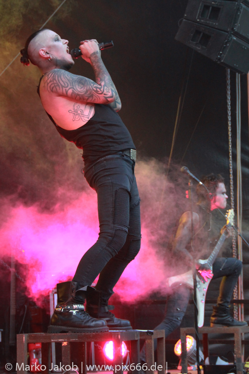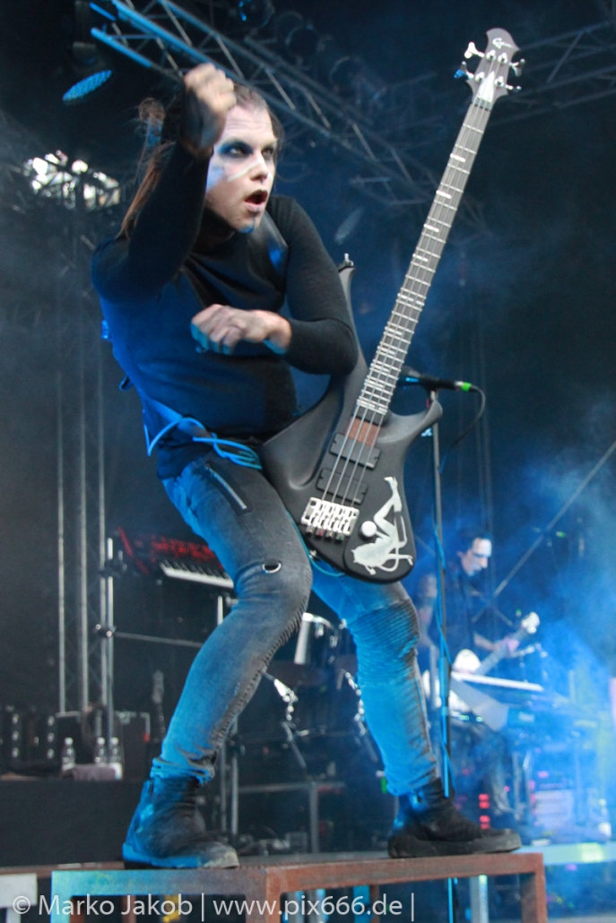 Lord Of The Lost sprühten an diesem Abend nur so vor Spielfreude. Die Jungs legten mit ‚Drag Me To Hell‘ und ‚Miss Machine‘ los wie die Feuerwehr und die Stimmung übertrug sich von Beginn an auf die Fans. Selbst der neue Song ‚Morgana‘ wurde schon von vielen Fans mitgesungen. Bei den Songs ‚Prison‘ und ‚Blood For Blood‘ taten das dann fast alle. Wow – was für eine tolle Konzert Atmosphäre. Open Air, aber doch intim. Etwa 1000 Besucher passen auf das Gelände zwischen den Mauern der Festung.