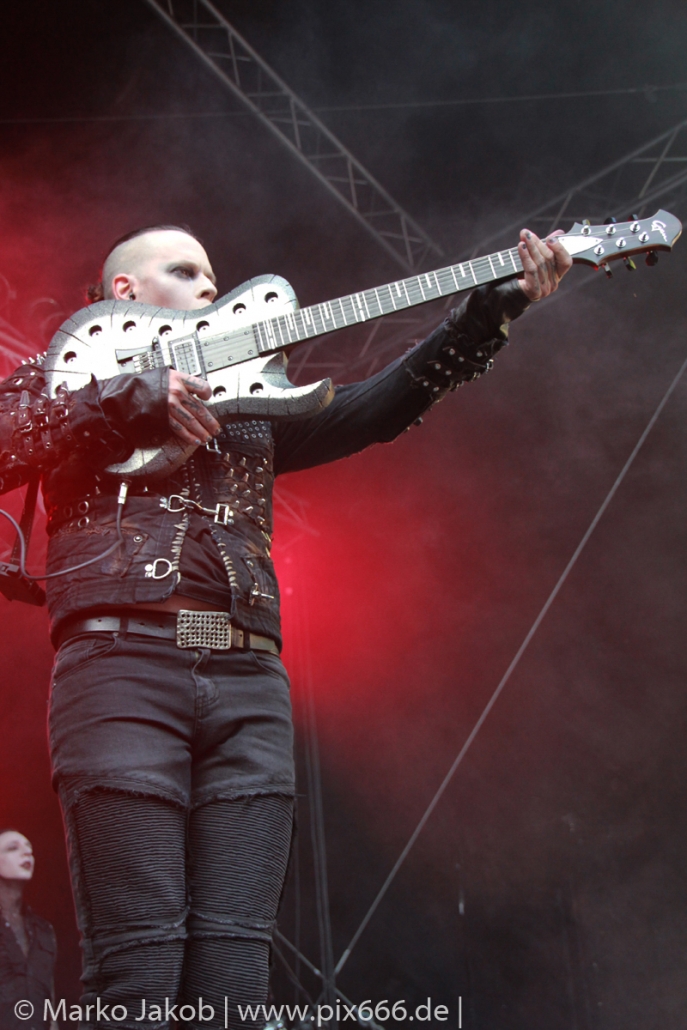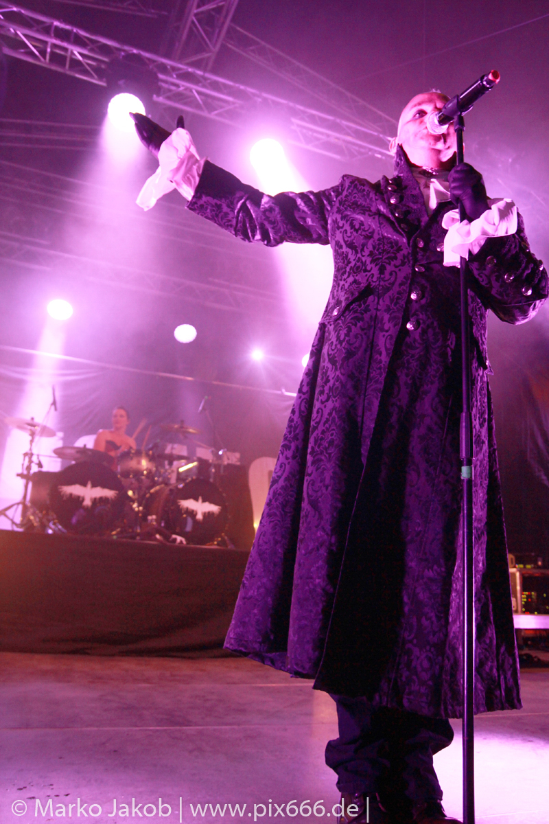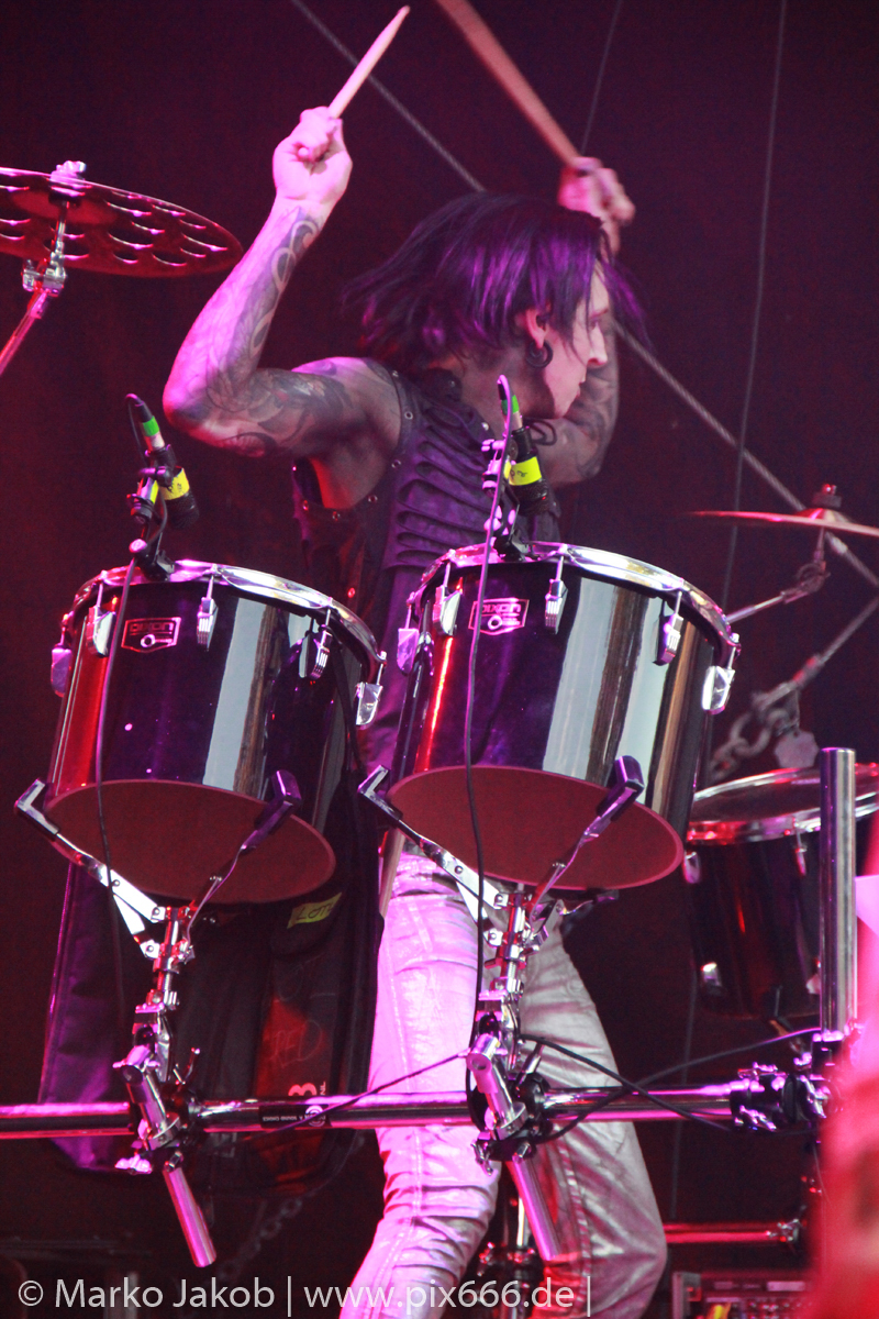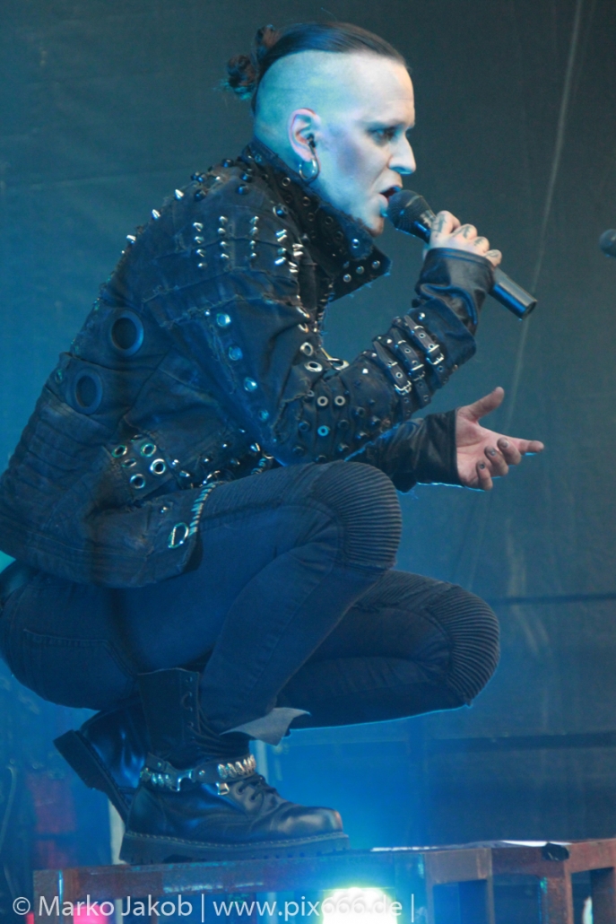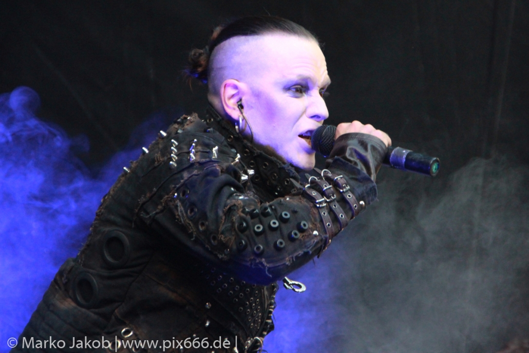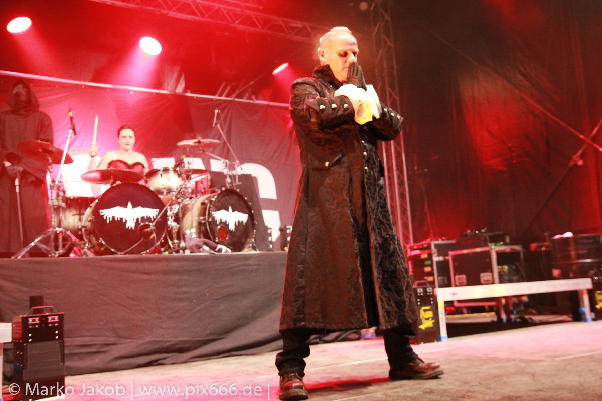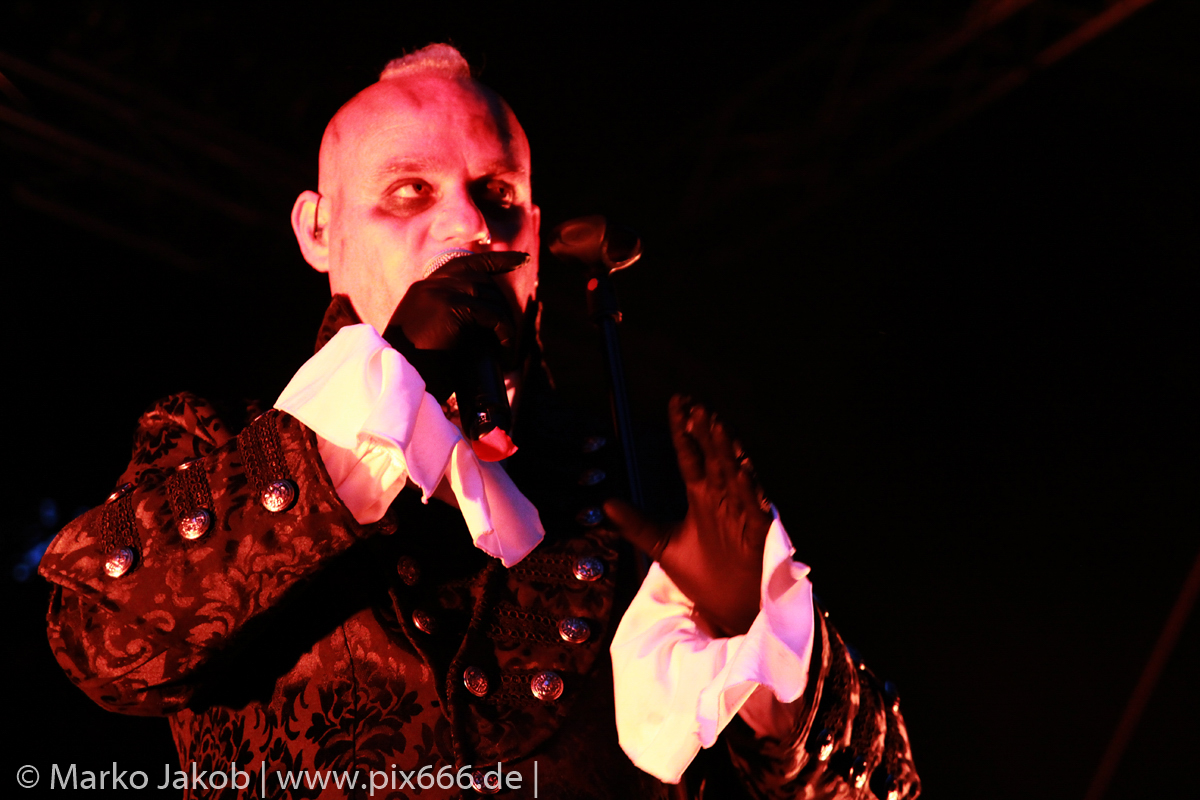 Lord Of The Lost sprühten an diesem Abend nur so vor Spielfreude. Die Jungs legten mit ‚Drag Me To Hell‘ und ‚Miss Machine‘ los wie die Feuerwehr und die Stimmung übertrug sich von Beginn an auf die Fans. Selbst der neue Song ‚Morgana‘ wurde schon von vielen Fans mitgesungen. Bei den Songs ‚Prison‘ und ‚Blood For Blood‘ taten das dann fast alle. Wow – was für eine tolle Konzert Atmosphäre. Open Air, aber doch intim. Etwa 1000 Besucher passen auf das Gelände zwischen den Mauern der Festung.