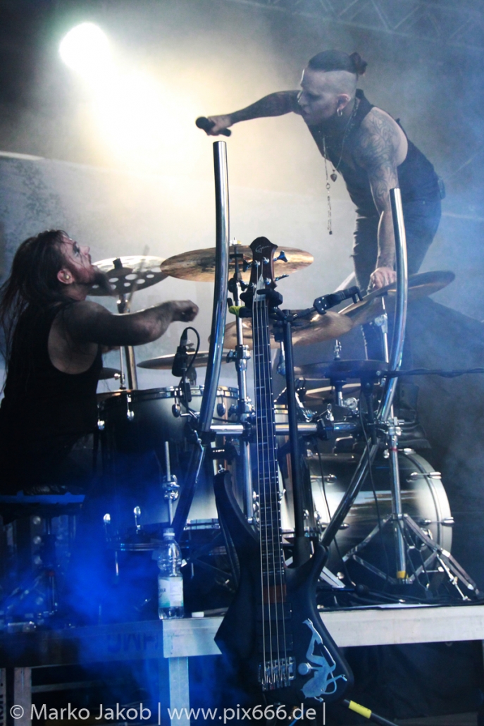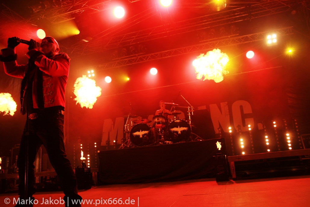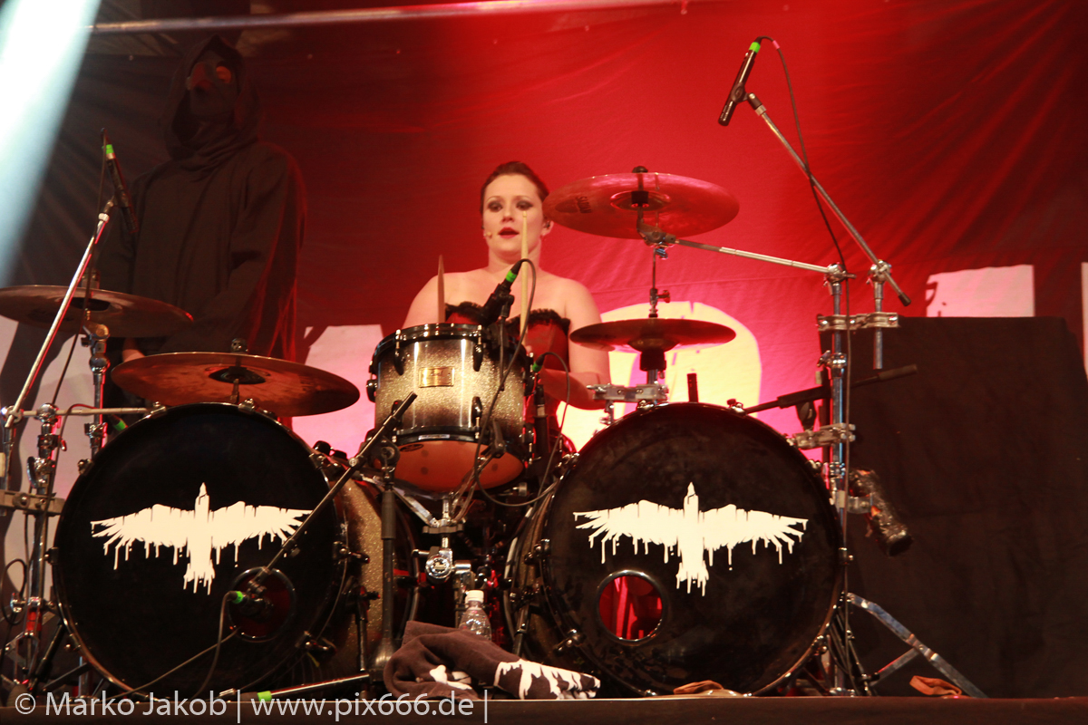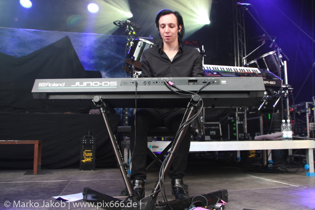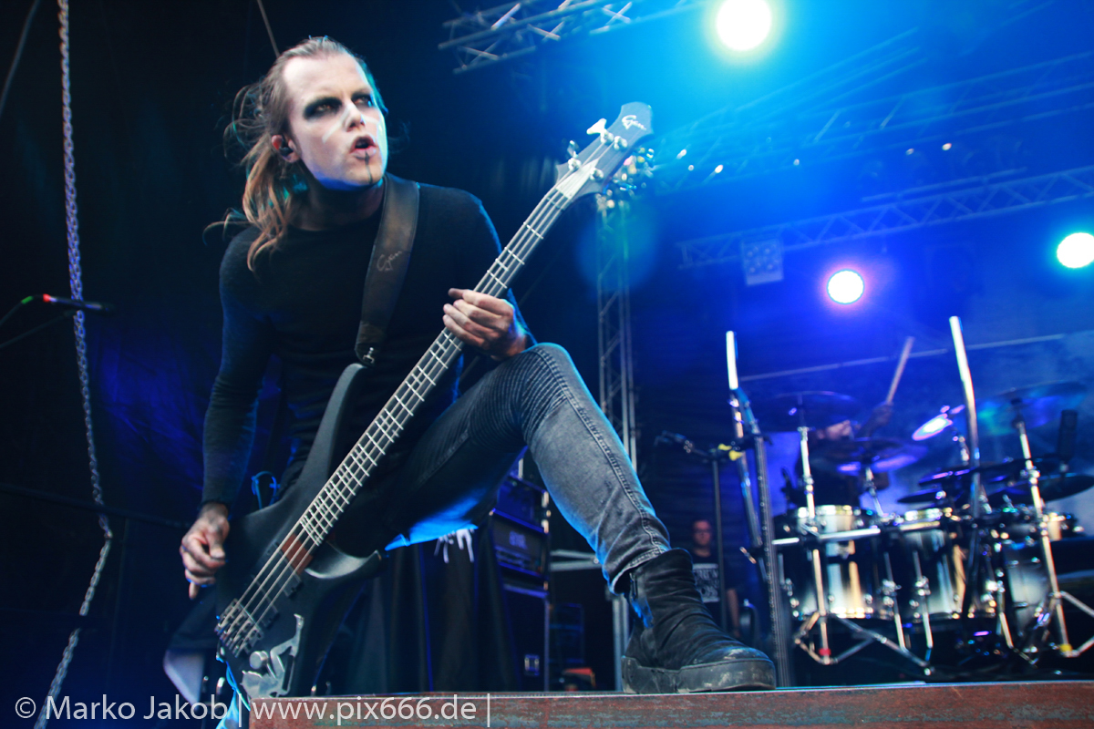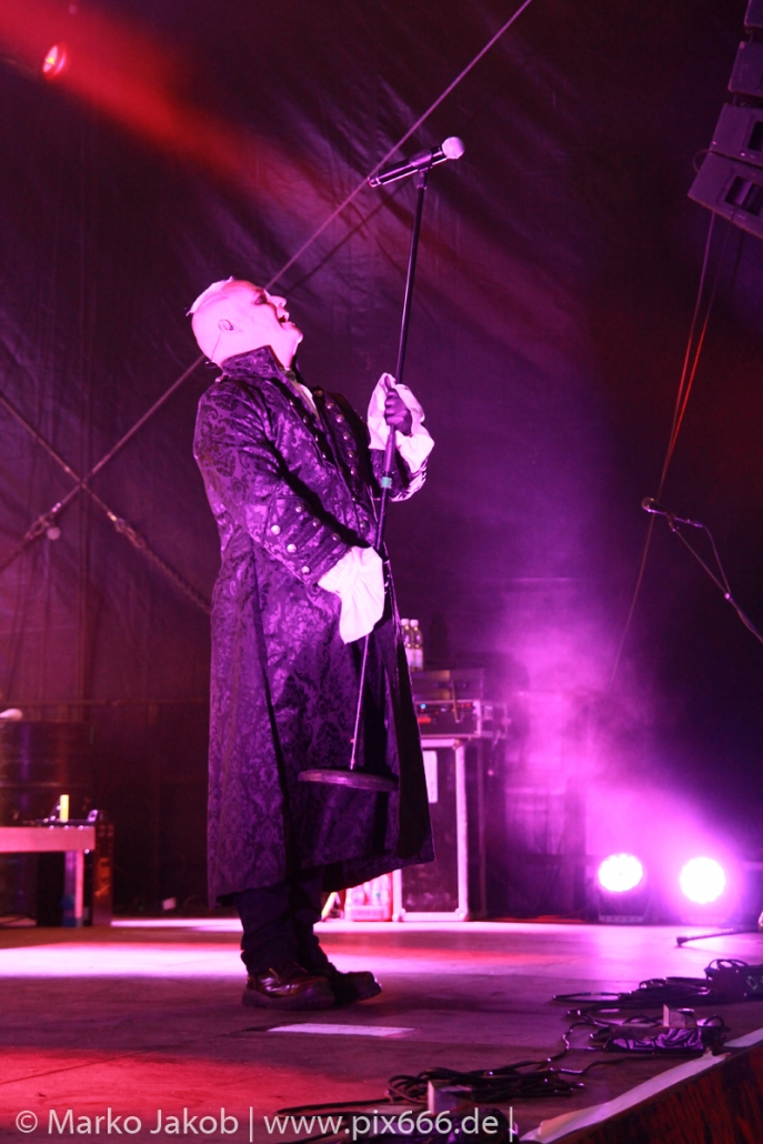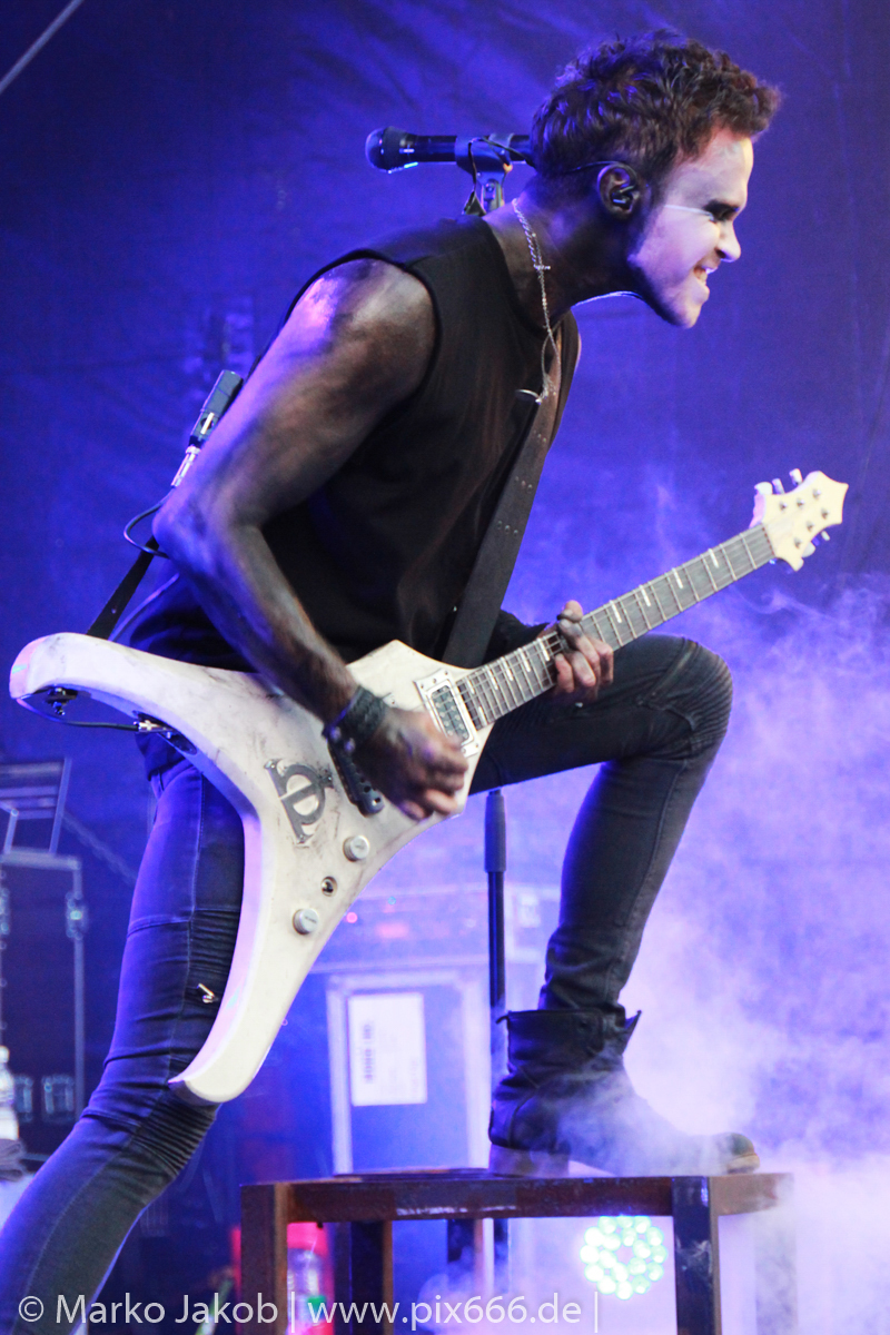 Lord Of The Lost sprühten an diesem Abend nur so vor Spielfreude. Die Jungs legten mit ‚Drag Me To Hell‘ und ‚Miss Machine‘ los wie die Feuerwehr und die Stimmung übertrug sich von Beginn an auf die Fans. Selbst der neue Song ‚Morgana‘ wurde schon von vielen Fans mitgesungen. Bei den Songs ‚Prison‘ und ‚Blood For Blood‘ taten das dann fast alle. Wow – was für eine tolle Konzert Atmosphäre. Open Air, aber doch intim. Etwa 1000 Besucher passen auf das Gelände zwischen den Mauern der Festung.