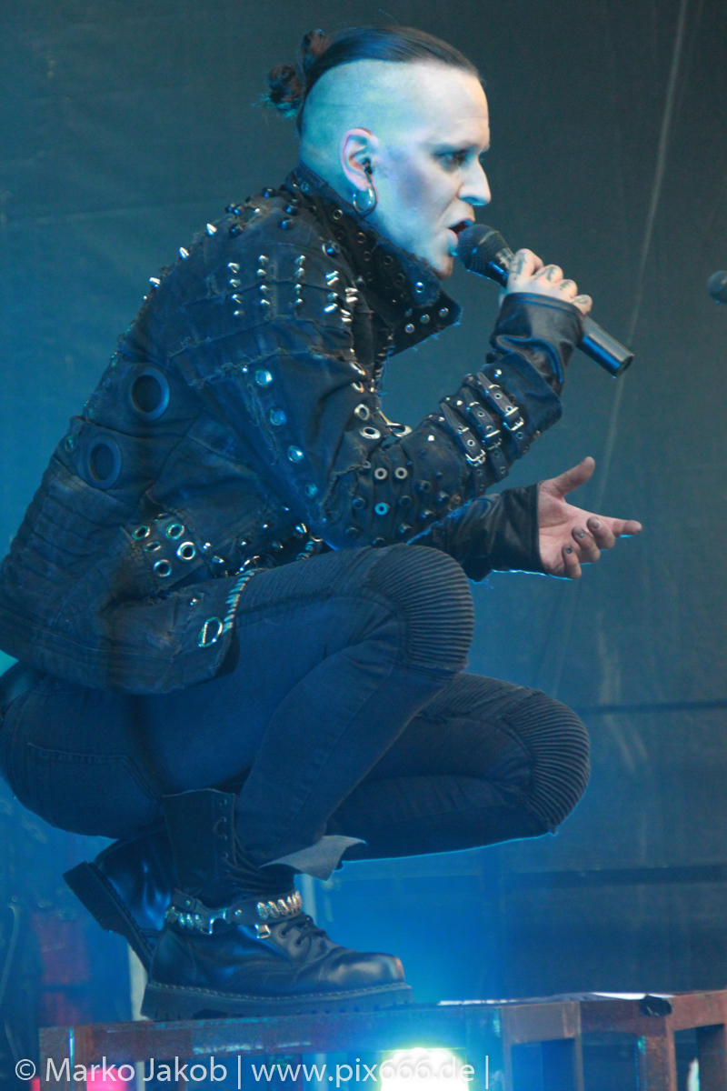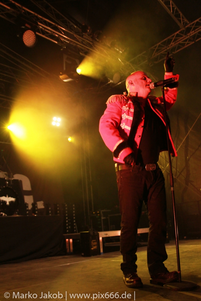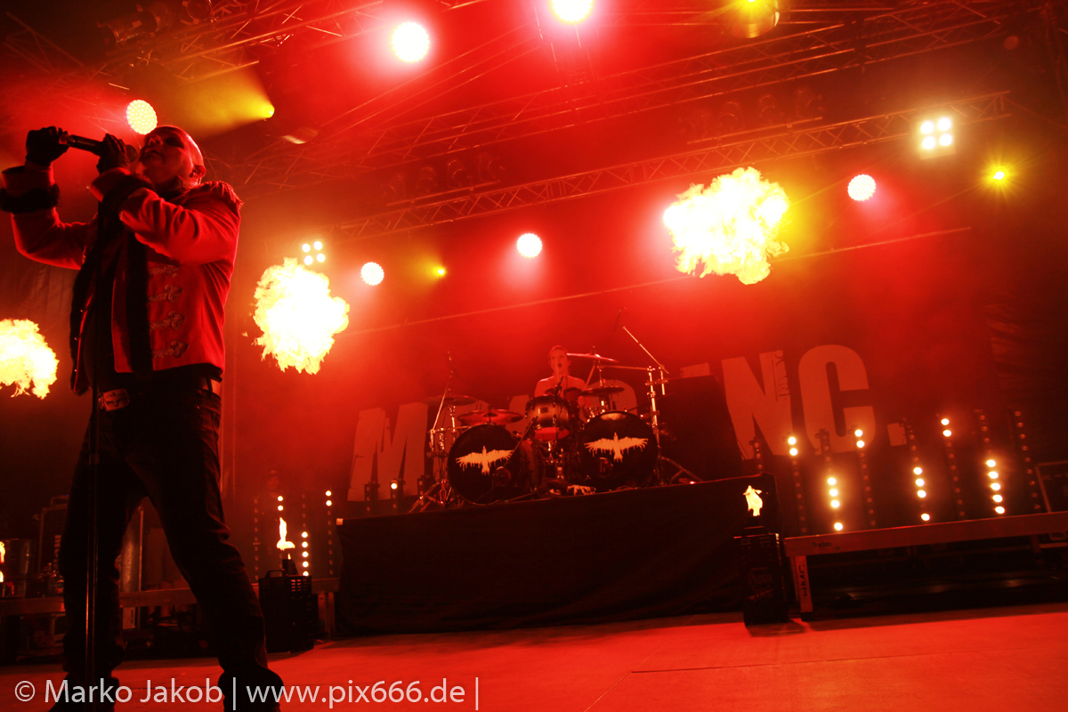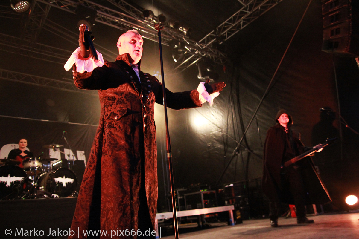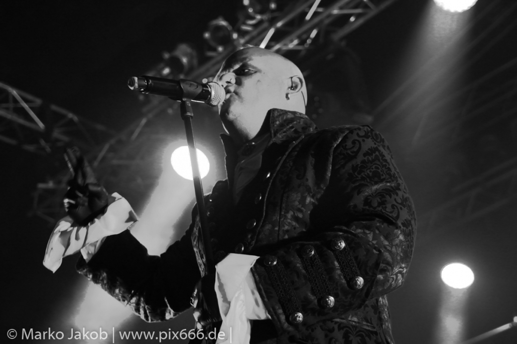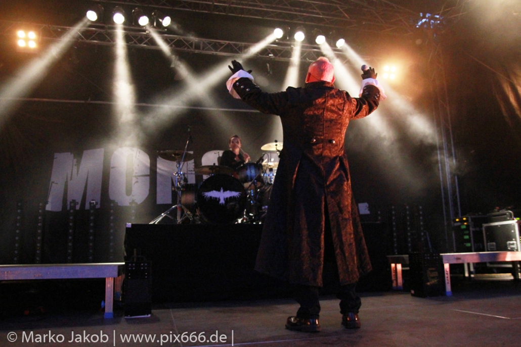 Als letzte Band des Festivalabends betrat der Headliner Mono Inc. gegen 21.30 Uhr die Bühne. Mono Inc. wurden im Jahr 2000 gegründet und sind seit vielen Jahren Stammgast auf den großen Gothic Festivals des Landes. Die Hamburger stehen kurz vor der Veröffentlich ihres 10. Studioalbums. Es trägt den Titel ‚Welcome To Hell‘. Auf dem Album ist Sänger Martin mit einer Pestmaske und einem Pesthut zu sehen. Das ist auch das Thema des Konzeptalbums – der letzte Pestausbruch in Hamburg vor etwa 300 Jahren.