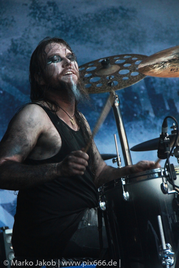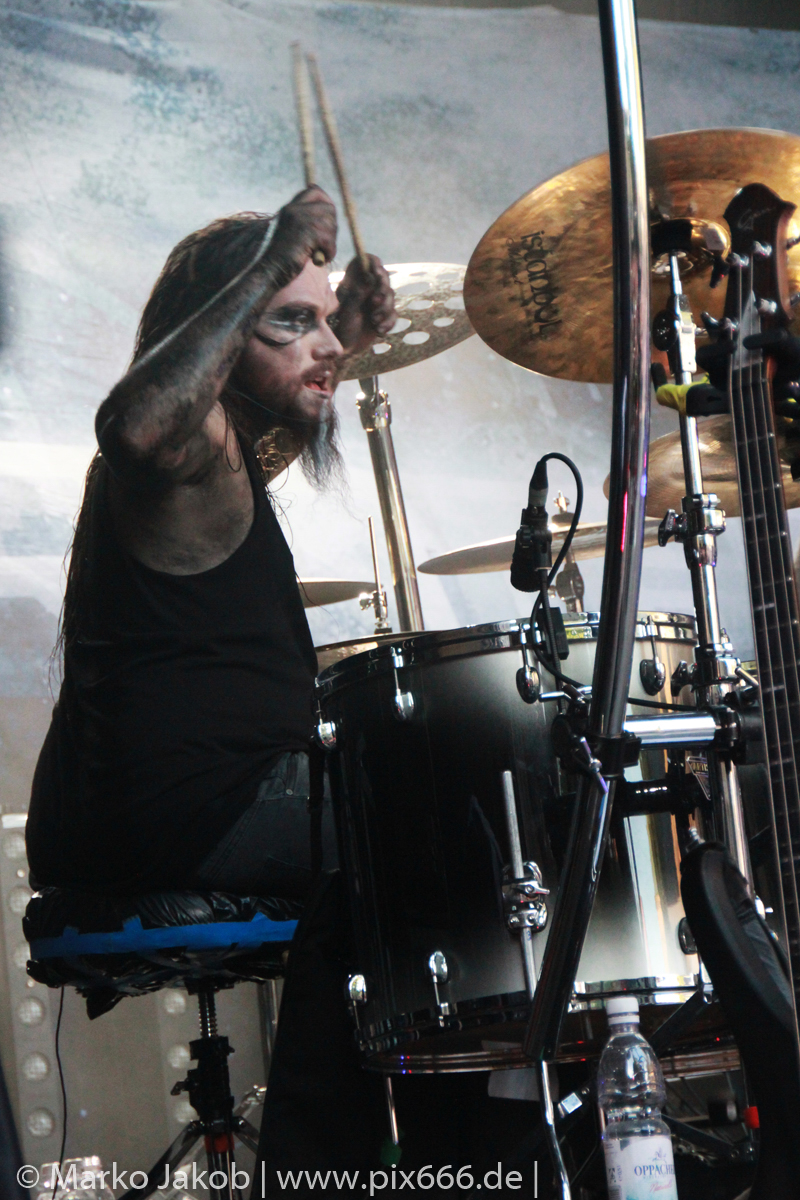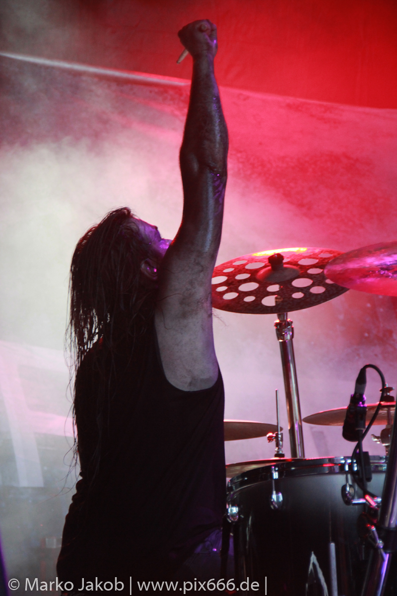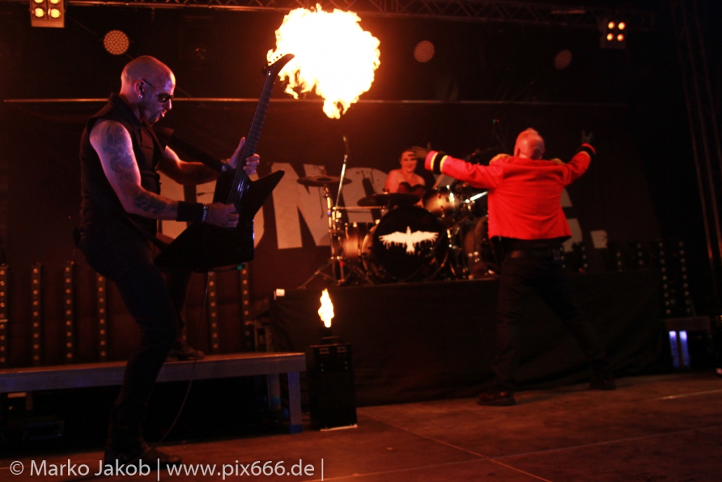 Es folgten nun in der Setlist unter anderem die Hits ‚Boatman‘ und ‚Gothic Queen‘. Die Band präsentierte aber mit ‚Heile, Heile Segen‘ und ‚Kein Weg Zu Weit‘ auch zwei Songs in deutscher Sprache. Teile des Konzertes wurden wieder für das bekannte Mono Inc. TV mitgefilmt und somit die grandiose Stimmung für immer festgehalten. Gitarrist Carl Fornia filmte dann auch die Fans. Das seit einigen Jahren als fester Bestandteil gehörende ‚Drumbattle‘ kam beim Publikum auf der Festung Königstein super an. Im Laufe des ‚Drumbattles‘ ertönten dazu die Gitarrenriffs des Metallica Klassikers ‚Enter Sandman‘.