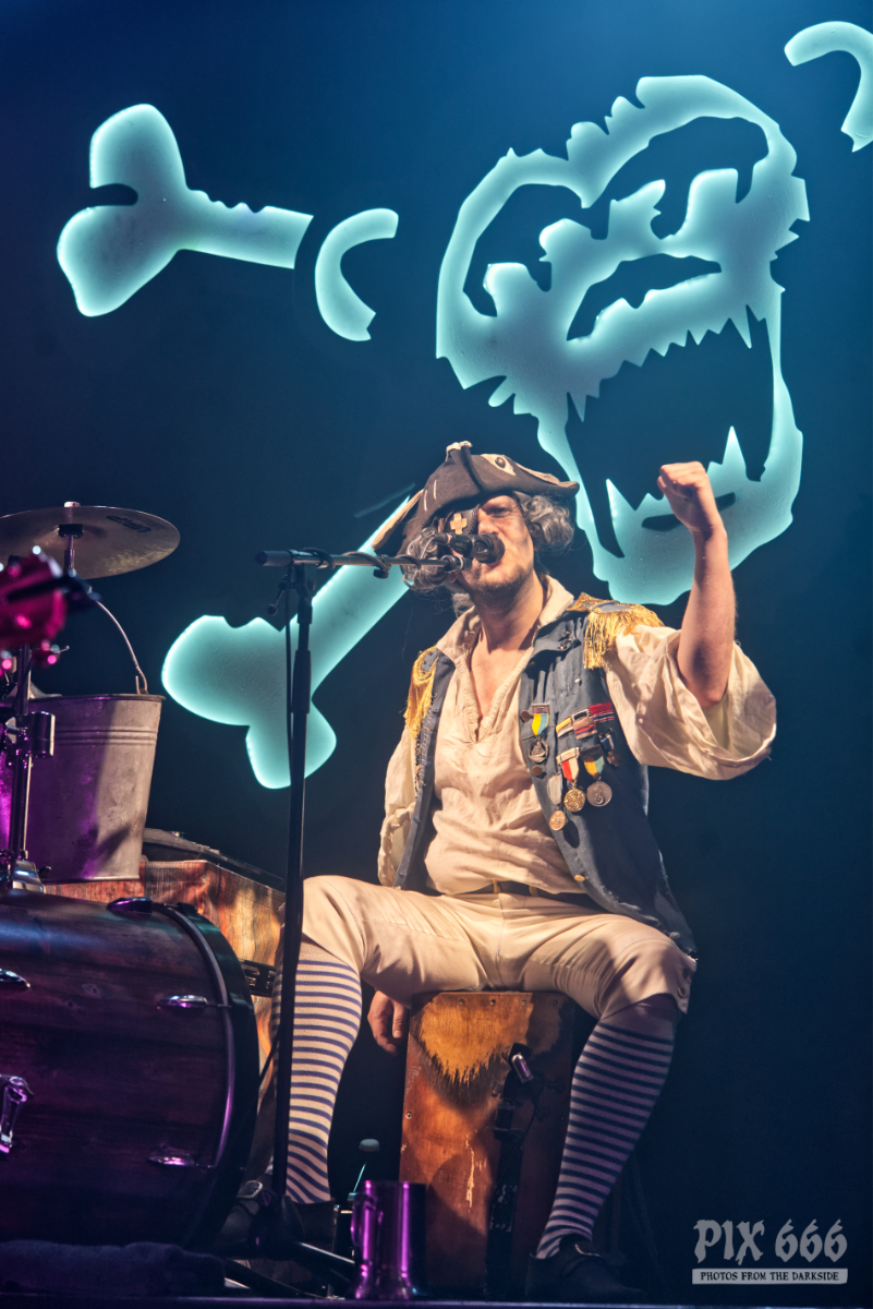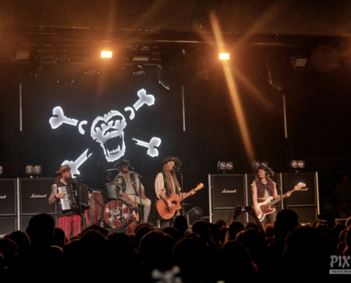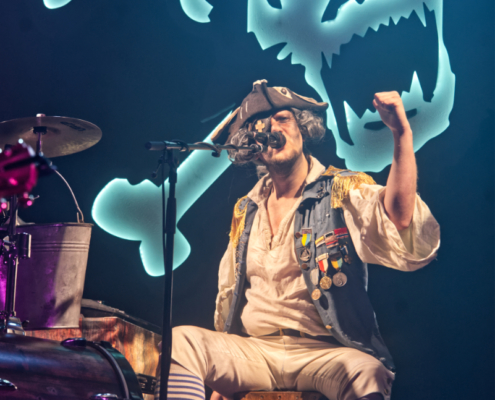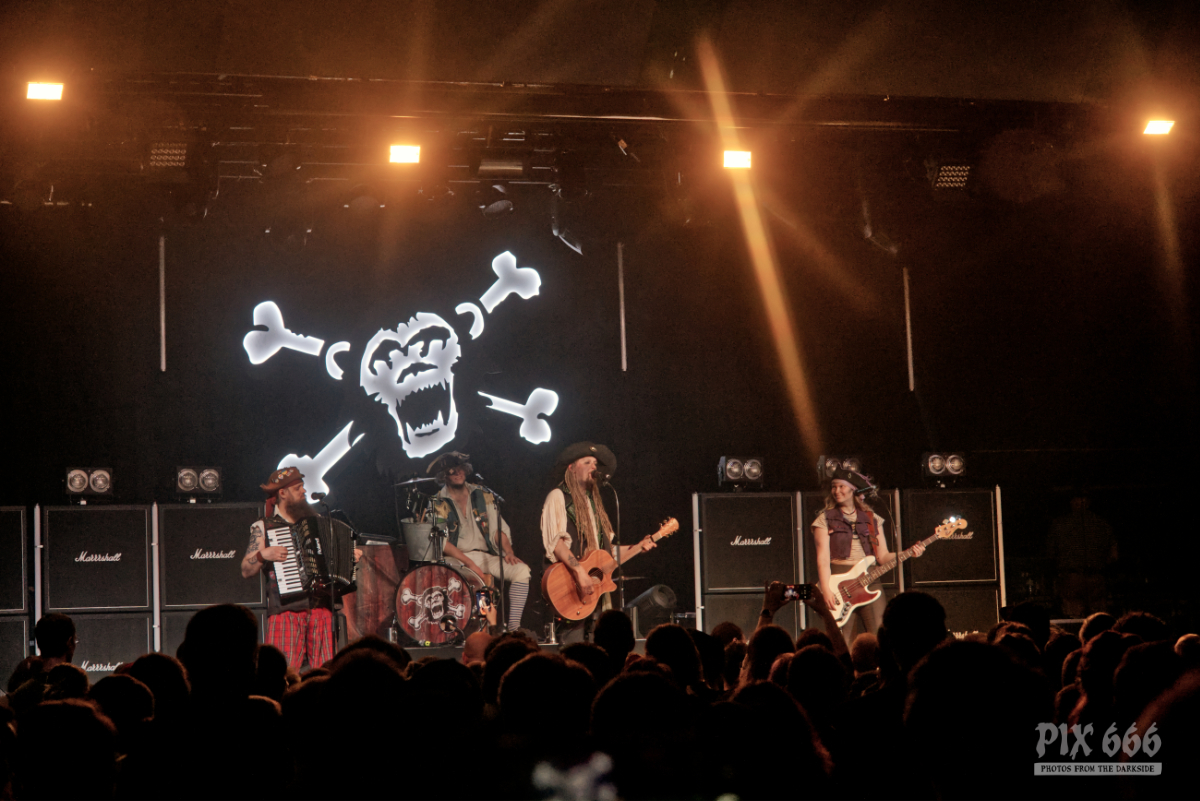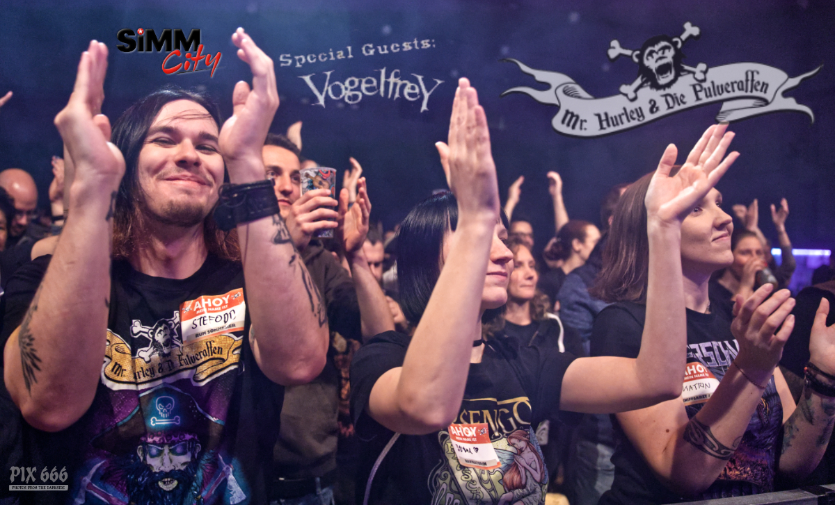 Mr. Hurley & die Pulveraffen waren zurück in der Stadt. Keine zwei Jahre hat es gedauert, da wurde der Anker wieder in Wien ausgeworfen – dieses Mal war das ‚Schiff‘, was sie einnehmen wollten, fast doppelt so groß, wie damals. Der auf der Bühne thronende ‚Affentotenkopp‘ wurde dann auch gleich mal im ersten Titel besungen. Auch wenn die Band etwas traurig war, weil sie hier in Wien zu weit vom Meer weg war, hatten sie doch genug Andenken aus der Heimat mitgebracht. Und so ging es beim Titeltrack des neuen Top5 Albums ‚S.O.S.‘ dann auch gleich mal im Rettungsring durch und über das Publikum. Passagiere in den Rettungsringen waren übrigens die Jungs von Vogelfrey. Die Band aus Osnabrück wurde hier tatsächlich problemlos auch mit der doppelten Menge Fanpiraten fertig und involvierte diese immer wieder in Trinkspiele – und so flossen während der Show so einige Pfefferminzliköre die Kehlen hinunter. Die Stimmung war während der gesamten Show phänomenal. Die Fans bauten dann menschliche Leuchttürme und Mr. Hurley sagte: „Ja, setzt euch aufeinander und macht die Taschenlampen an.“ Zum Song ‚Leuchtturm‘ wurde dann wieder laut mitgesungen, untermalt von einer wunderschönen Lichtshow. Dann gab es einen Circle Pit ohne Männer. Die Frauen folgten zum Song ‚Zu Fuß‘ der ‚Peggys Pit‘ Flagge mit dem Affentotenkopp. Bei ‚Mann über Bord‘ gab es dann Verstärkung auf der Bühne – Johanna von Vogelfrey mischte ordentlich mit. Mr. Hurley & Die Pulveraffen ließen nicht locker und hielten die Fans pausenlos auf Trab. Bei ‚Meine Schnauze‘ war dann Dauerklatschen angesagt. „Wien könnt ihr noch?“ hieß es dann. Das tolle Konzert mit vielen lustigen Einlagen hatte dann tatsächlich seine erste kleine Verschnaufpause für die Fans parat – Buckteeth Bannock sang die Ballade ‚Mit’n Herz‘ am Klavier sitzend. Aber dann war es auch schnell wieder vorbei mit der Stille – Partystimmung herrschte dann bei der Saufhymne ‚Unser Untergang‘. Mr. Hurley hatte während des Songs seinen großen Auftritt inmitten der Fans – erst auf Schultern singend, dann mitten in der Wall of Death. Und beim nächsten Stück wurde es nicht weniger anstrengend. Bei ‚Tortuga, heute im Duett mit Jannick von Vogelfrey, war das Publikum nun in Dauerbewegung – und das Mitsingen wurde immer lauter. Da wirkte der Alkohol inzwischen perfekt, die Hemmungen waren komplett weggespült. Während des nächsten Songs ging das Publikum in die Hocke und wusste genau, was zu tun ist. Die Fans hatten einen Riesenspaß bei der tollen Show. Nach einer Stunde gab dann zwei gute Nachrichten zu vermelden: „Wir haben gleich Feierabend.“ Das taugte den Fans natürlich nicht so, aber mit der zweiten guten Nachricht war die gute Laune zurück – sie lautete „Pfefferminzlikör“ – und schon schwebte das Tablet auf die Bühne. Mit dem Stück ‚Die Nacht Ist Noch Jung‘ verabschiedeten sich die vier Geschwister vom tollen Wiener Publikum. Aber da die Nacht ja wirklich noch jung war, ging es natürlich noch weiter und ‚Auf In Die Schlacht‘. Mr. Hurley & Die Pulveraffen spielten eine extralange Zugabe mit Medleys und jeder Menge Spaß. Wow – die SimmCity und das Wiener Publikum erlebten eine klasse Show. Kommt gern bald wieder vorbei.