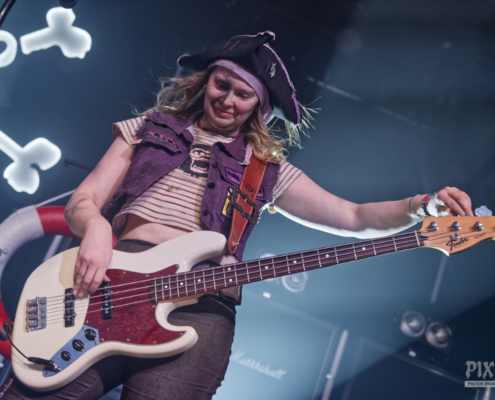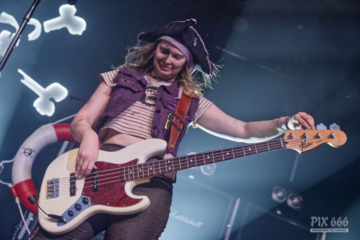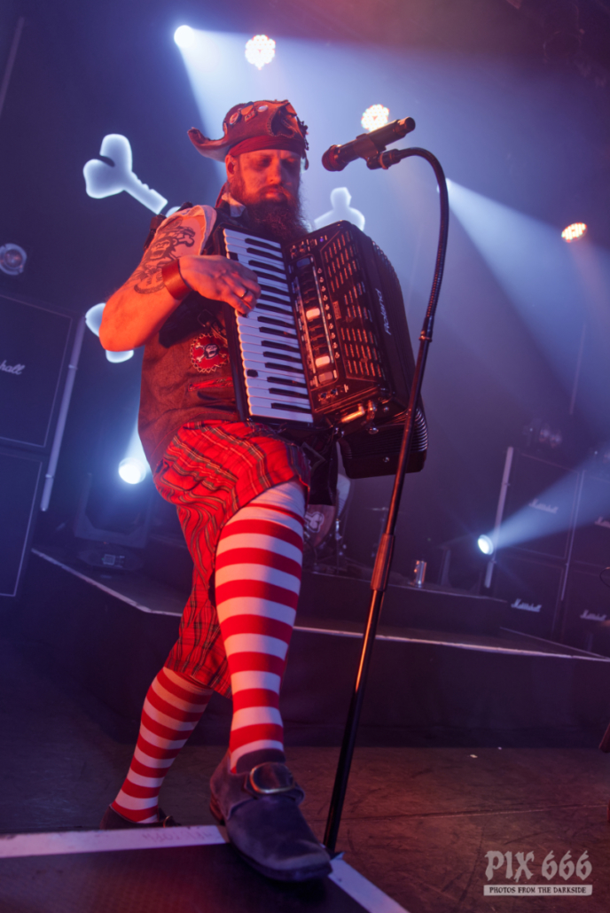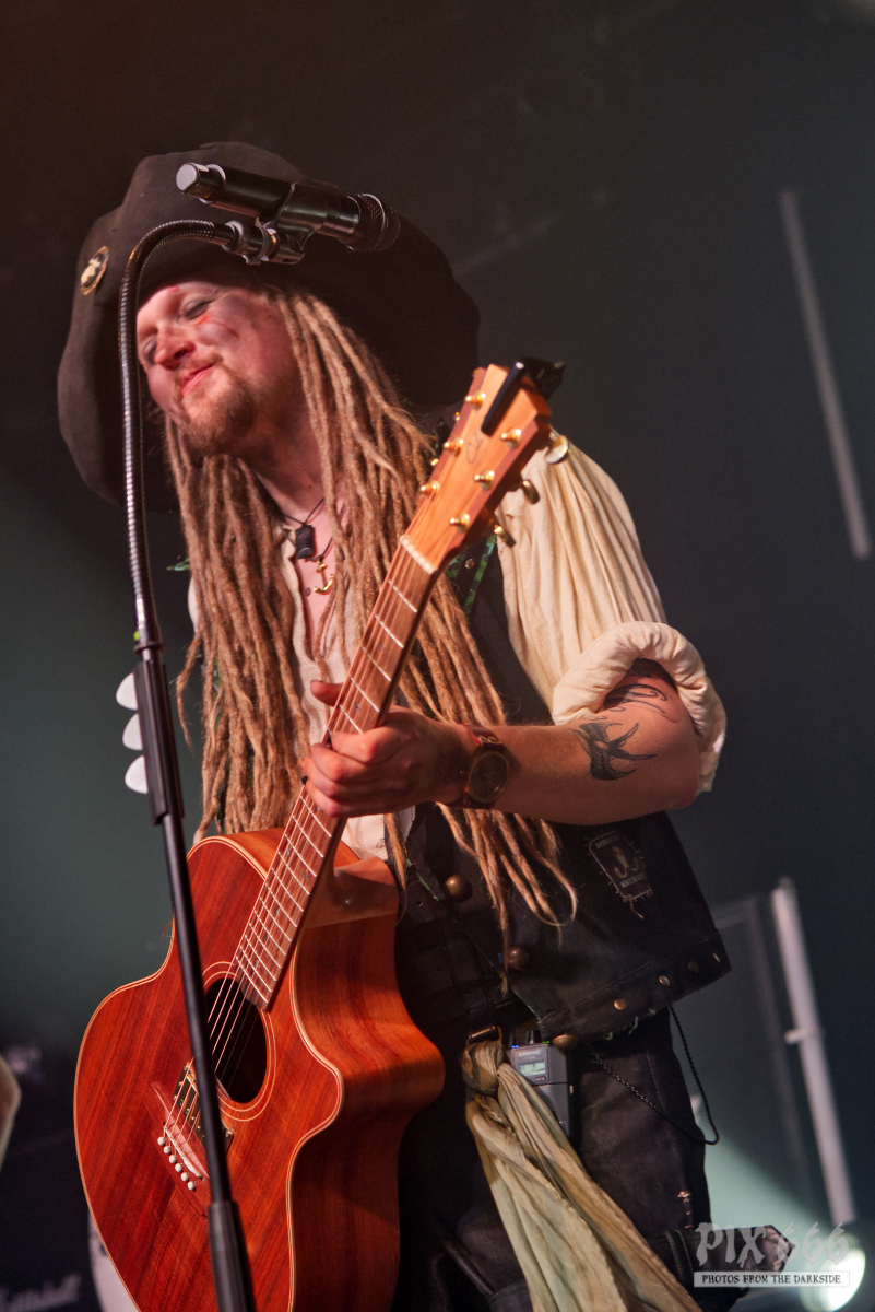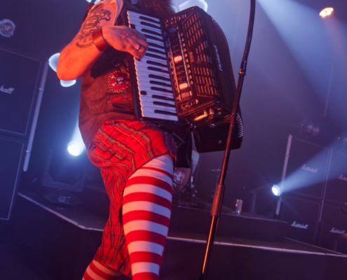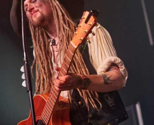 Mr. Hurley & die Pulveraffen waren zurück in der Stadt. Keine zwei Jahre hat es gedauert, da wurde der Anker wieder in Wien ausgeworfen – dieses Mal war das ‚Schiff‘, was sie einnehmen wollten, fast doppelt so groß, wie damals. Der auf der Bühne thronende ‚Affentotenkopp‘ wurde dann auch gleich mal im ersten Titel besungen. Auch wenn die Band etwas traurig war, weil sie hier in Wien zu weit vom Meer weg war, hatten sie doch genug Andenken aus der Heimat mitgebracht. Und so ging es beim Titeltrack des neuen Top5 Albums ‚S.O.S.‘ dann auch gleich mal im Rettungsring durch und über das Publikum. Passagiere in den Rettungsringen waren übrigens die Jungs von Vogelfrey. Die Band aus Osnabrück wurde hier tatsächlich problemlos auch mit der doppelten Menge Fanpiraten fertig und involvierte diese immer wieder in Trinkspiele – und so flossen während der Show so einige Pfefferminzliköre die Kehlen hinunter. Die Stimmung war während der gesamten Show phänomenal. Die Fans bauten dann menschliche Leuchttürme und Mr. Hurley sagte: „Ja, setzt euch aufeinander und macht die Taschenlampen an.“ Zum Song ‚Leuchtturm‘ wurde dann wieder laut mitgesungen, untermalt von einer wunderschönen Lichtshow. Dann gab es einen Circle Pit ohne Männer. Die Frauen folgten zum Song ‚Zu Fuß‘ der ‚Peggys Pit‘ Flagge mit dem Affentotenkopp. Bei ‚Mann über Bord‘ gab es dann Verstärkung auf der Bühne – Johanna von Vogelfrey mischte ordentlich mit. Mr. Hurley & Die Pulveraffen ließen nicht locker und hielten die Fans pausenlos auf Trab. Bei ‚Meine Schnauze‘ war dann Dauerklatschen angesagt. „Wien könnt ihr noch?“ hieß es dann. Das tolle Konzert mit vielen lustigen Einlagen hatte dann tatsächlich seine erste kleine Verschnaufpause für die Fans parat – Buckteeth Bannock sang die Ballade ‚Mit’n Herz‘ am Klavier sitzend. Aber dann war es auch schnell wieder vorbei mit der Stille – Partystimmung herrschte dann bei der Saufhymne ‚Unser Untergang‘. Mr. Hurley hatte während des Songs seinen großen Auftritt inmitten der Fans – erst auf Schultern singend, dann mitten in der Wall of Death. Und beim nächsten Stück wurde es nicht weniger anstrengend. Bei ‚Tortuga, heute im Duett mit Jannick von Vogelfrey, war das Publikum nun in Dauerbewegung – und das Mitsingen wurde immer lauter. Da wirkte der Alkohol inzwischen perfekt, die Hemmungen waren komplett weggespült. Während des nächsten Songs ging das Publikum in die Hocke und wusste genau, was zu tun ist. Die Fans hatten einen Riesenspaß bei der tollen Show. Nach einer Stunde gab dann zwei gute Nachrichten zu vermelden: „Wir haben gleich Feierabend.“ Das taugte den Fans natürlich nicht so, aber mit der zweiten guten Nachricht war die gute Laune zurück – sie lautete „Pfefferminzlikör“ – und schon schwebte das Tablet auf die Bühne. Mit dem Stück ‚Die Nacht Ist Noch Jung‘ verabschiedeten sich die vier Geschwister vom tollen Wiener Publikum. Aber da die Nacht ja wirklich noch jung war, ging es natürlich noch weiter und ‚Auf In Die Schlacht‘. Mr. Hurley & Die Pulveraffen spielten eine extralange Zugabe mit Medleys und jeder Menge Spaß. Wow – die SimmCity und das Wiener Publikum erlebten eine klasse Show. Kommt gern bald wieder vorbei.