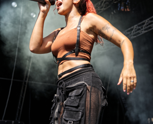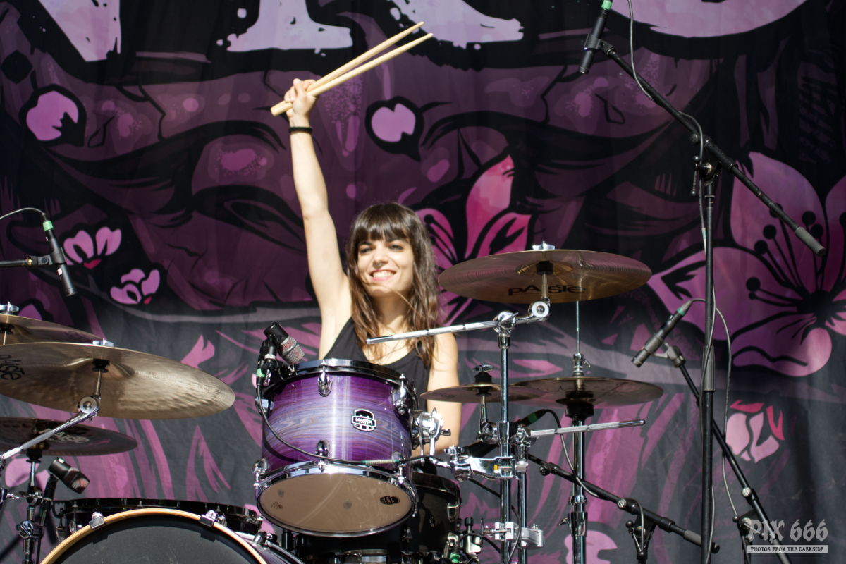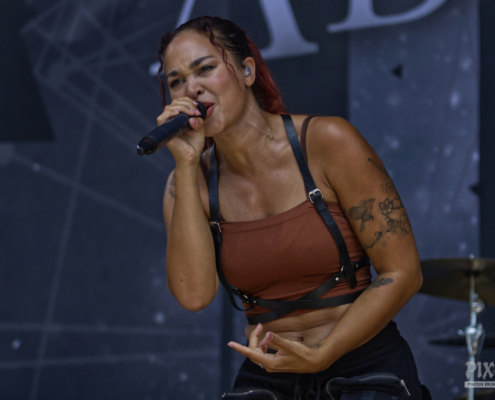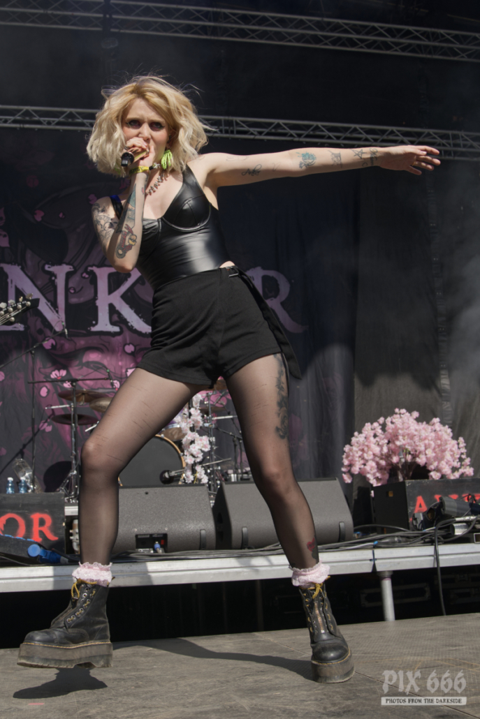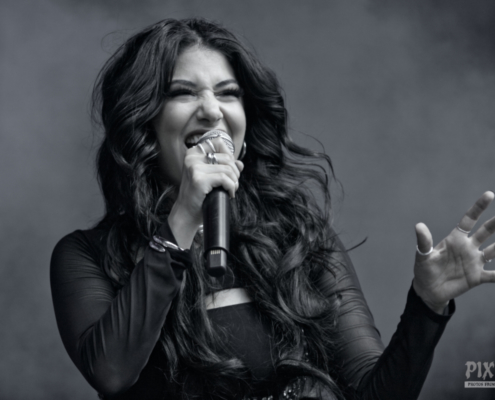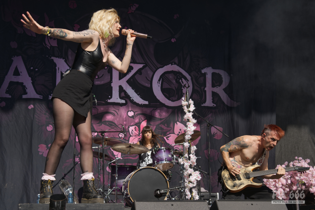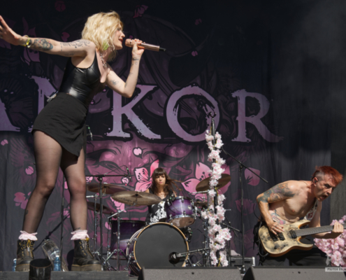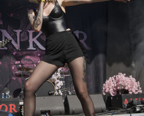 Mit zarten rosa Blumen hatten Ankor die Bühne dekoriert. Aber alles andere als zart begann die Show mit dem Kracher ‚Darkbeat‘. „Wir sind aus Spanien, Barcelona – und hier ist es derzeit heißer, als dort“ sagte Sängerin Jessie. Während der Show herrschte mega Action auf der Bühne, die Musiker standen kaum mal still. Und auch das Publikum wurde ordentlich in Bewegung gebracht – die Aufforderung zum Circlepit wurde ohne zu zögern angenommen. Ankor lieferten eine atemberaubende Show ab und beim nächsten Song sprang fast das gesamte Publikum in die Höhe. „Verdammt toll, Rock Castle – vielen Dank.“ Manchmal hat man das Gefühl, je besser die Stimmung, desto schneller vergeht die Zeit. „Rock Castle – das ist der letzte Song ‚Embers‘. Mit diesem klasse Song riss die Band das Publikum nochmal so richtig mit.
