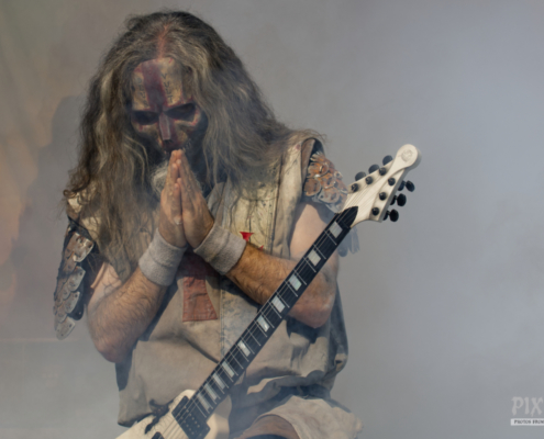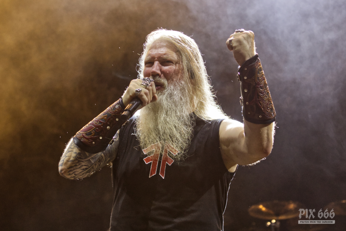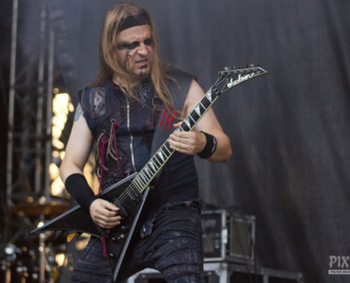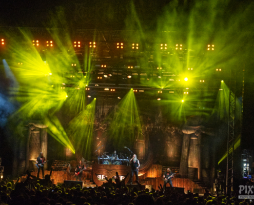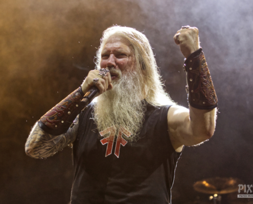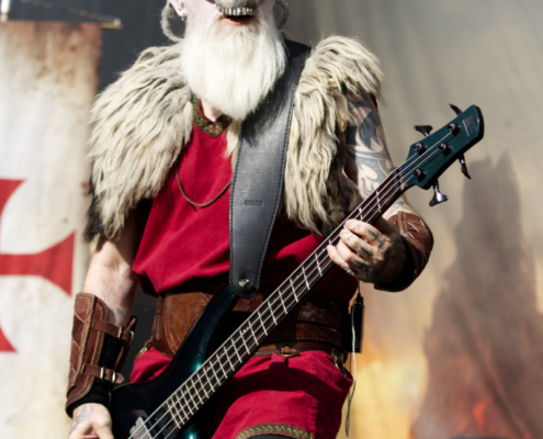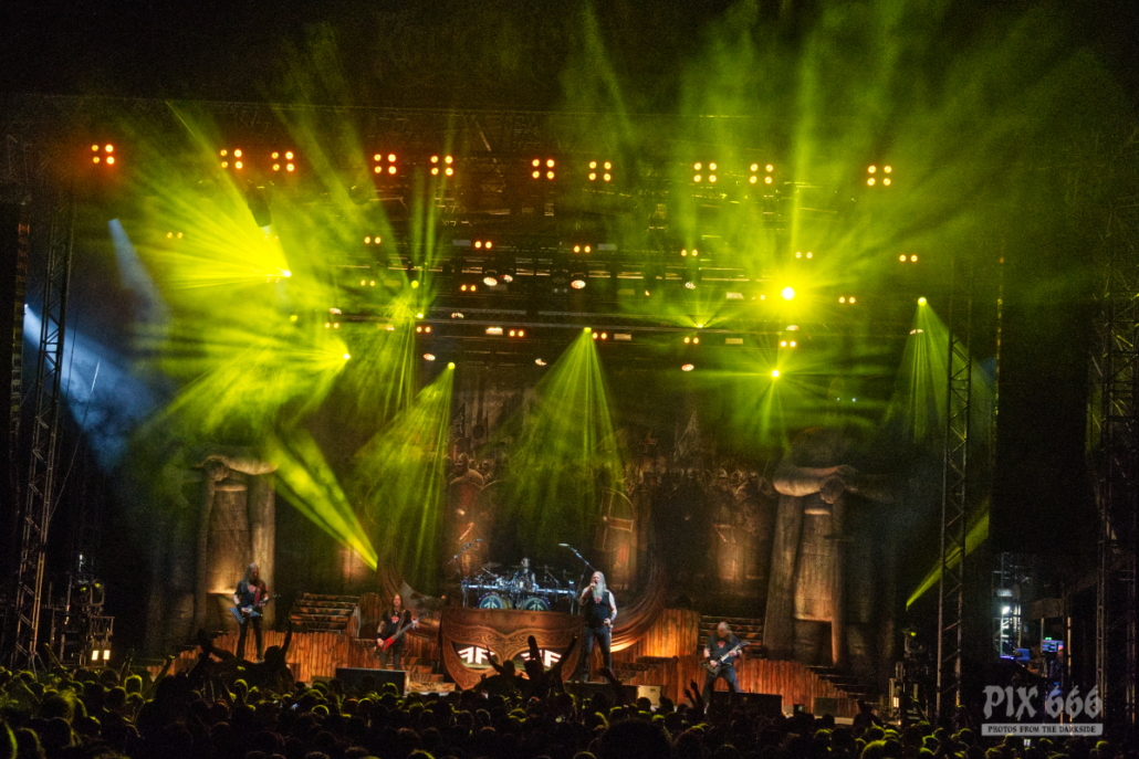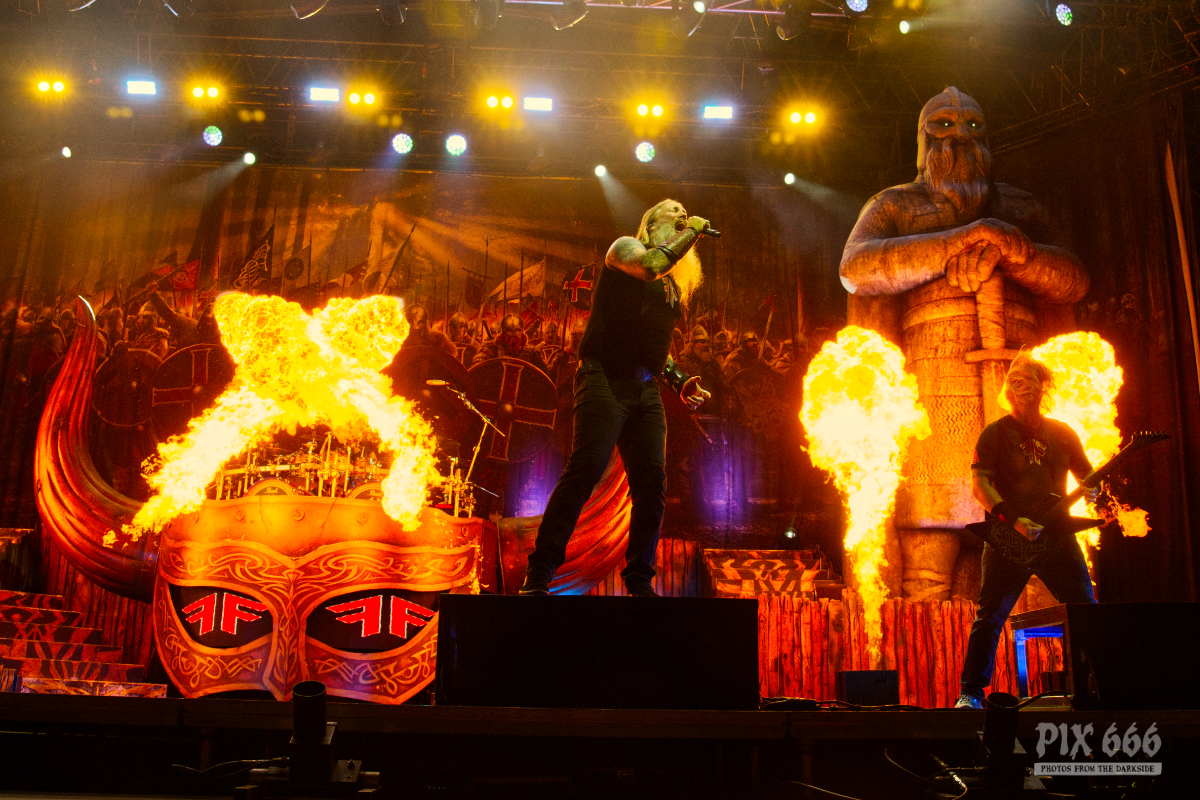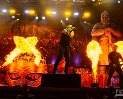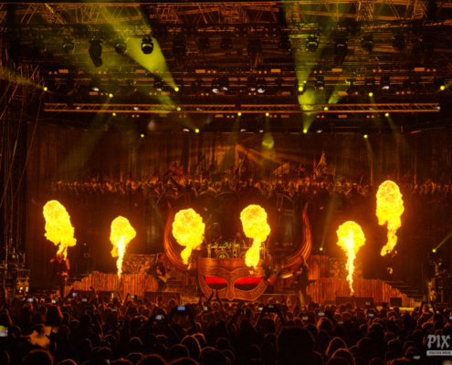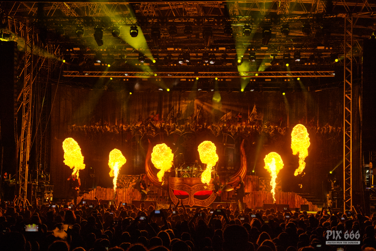 Nun war Headliner Zeit. Amaon Amarth waren für viele nicht nur der Donnerstags-Headliner, sondern das Festivalhighlight generell. Die legendäre Melodic Death Metal Band aus Schweden steuerte mit ihren letzten drei Alben bis auf die Spitze des Berges – dreimal Nummer 1 inklusive goldener Schallplatte für ‚Jomsviking‘ in Deutschland. Auch in anderen Ländern ist die Band um Sänger Johan nicht zu stoppen. Zu Beginn sagte er „Wir sind froh wieder hier zu sein in Tschechien, im Land des Pilsener“. Amon Amarth lieferten eine gigantische Show ab – da passt einfach alles. Heiße Pyros, phänomenale Lichter, Top Sound – das ließ alle Metalherzen höher und schneller schlagen. Wer dabei nicht begeistert war, war definitiv am falschen Ort. Nun hiess es „Hinsetzen und rudern wie die Vikinger“. Auch zahlreiche Crowdsurfer schwebten auf den Händen des Publikums Richtung der Flammen und der Band. Später gab es einen lauten Knall und eine Art Funkenvorhang – auch das sah spektakulär aus. Und immer wieder erhellten die Feuersäulen das Festivalgelände. Amon Amarth und ihre Show waren unglaublich toll und die Musiker gaben das Kompliment an die Fans zurück „Ihr wart toll danke. – Raise your horns – skål.“
