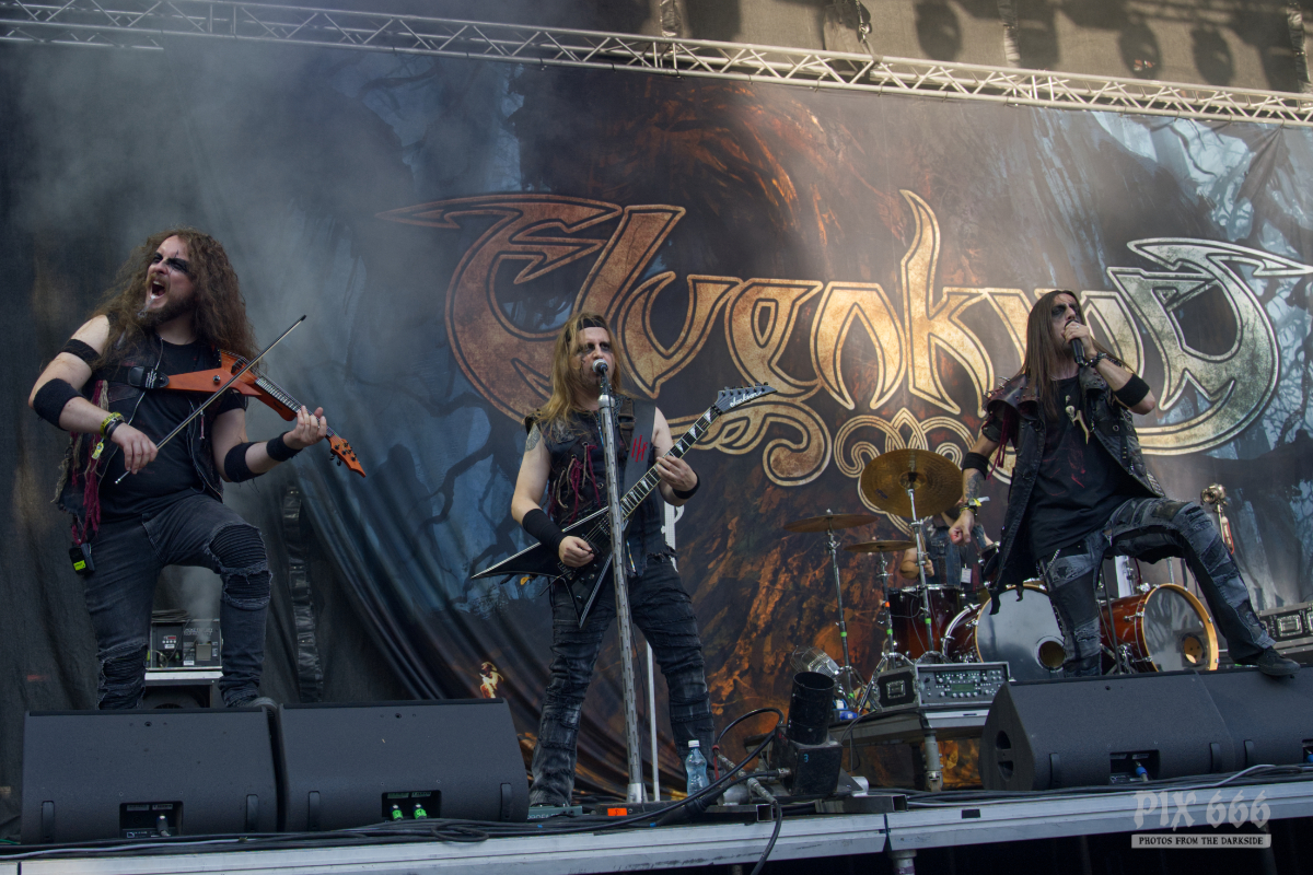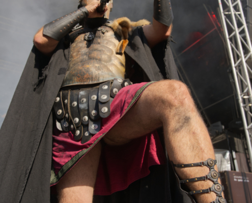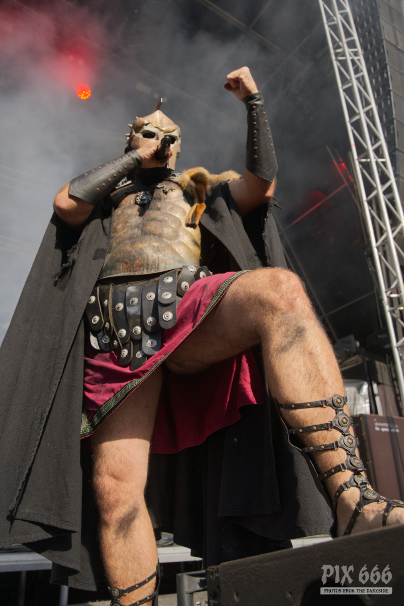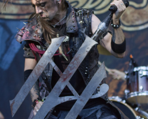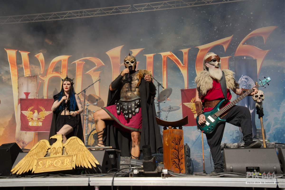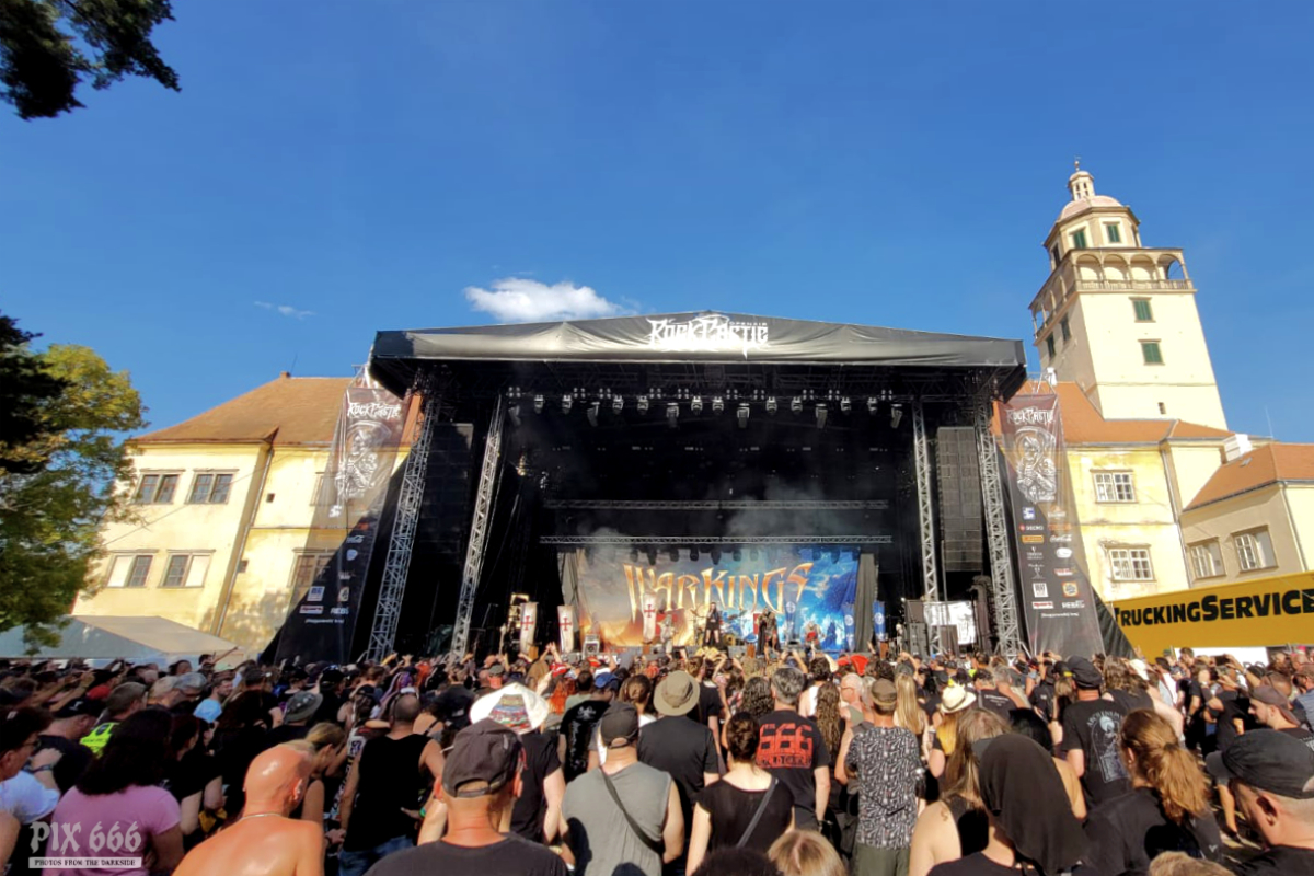 Als nächstes betraten die Warkings die Arena im Schlosspark. Der Auftrag ihrer etwa 50-minütigen Schlacht lautete: das Publikum zum Schwitzen zu bringen – und glaubt mir, dass hätte die Band auch bei anderen Temperaturen locker geschafft. Bei weit über 30 Grad gaben die Musiker mit ihren Maskierungen und tollen Kostümen genau so viel Gas, wie die anderen Bands. Die Fans in Tschechien waren absolut begeistert vom melodiösen Powermetal der Österreicher. In den ersten Reihen wurden jetzt pausenlos die Haare geschüttelt. Vor dem nächsten Song hiess es in Richtung Fans: „Ich frage mich, ob ihr bereit seid mit uns zu kämpfen“. Bei weiterhin mega Stimmung ging es also weiter mit ‚Fight‘ und bei ‚We Are The Fire‘ drehte dann wie vielen schon bekannt sein dürfte Shieldmaiden Andrea mit dem Warkings Banner eine Runde durchs Publikum. Dann folgte mit ‚Sparta‘ einer dieser Songs mit dem Refrain mit Hitgarantie. „Für den letzten Song müsst ihr alle mit uns gemeinsam die Arena betreten“. Die Warkings verabschiedeten sich für heute mit ‚Gladiator‘ und hinterließen ein mehr als zufriedenes Metalvolk.