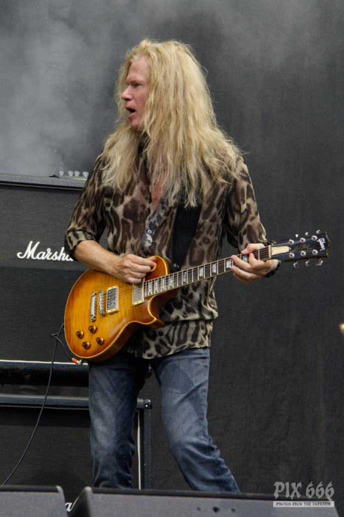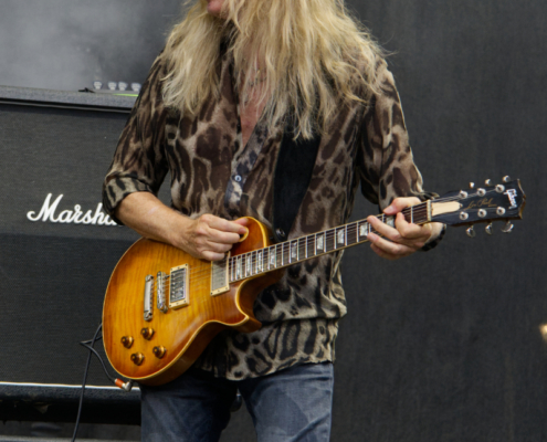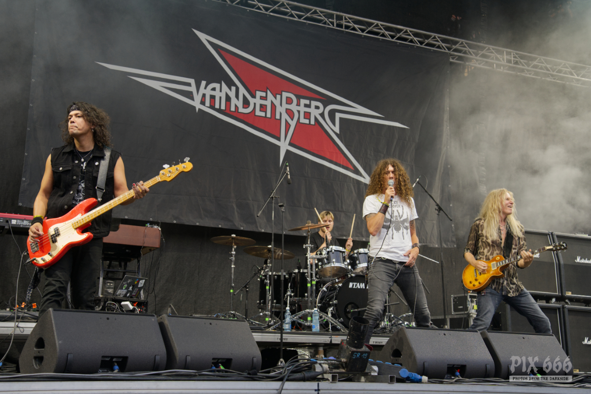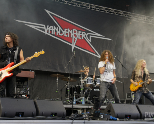 Nun wehte mit der niederländischen Band Vandenberg ein Hauch der guten alten 80er Jahre Hard Rock Zeit durch den Schlosspark. Mit der aktuellen Single ‚Hit The Ground Running‘ begannen die Rocker ihre durchweg coole Show und das Publikum blieb weiterhin richtig gut in Bewegung. Weiter ging es mit vertrauten Klängen und der Whitesnake Coverversion ‚Fool for Your Loving‘. Das sollte nicht der letzte Song der legendären Band sein, der heute gecovert wurde. Immerhin war Gitarrist Adrian Vandenberg über zehn Jahre lang Gitarrist bei einer der erfolgreichsten Rockbands der 80er und 90er Jahre. Aber auch die eigenen Vandenberg Songs fanden Berücksichtigung im Set. „Lets go hiess es dann – „Nun noch ein Stück vom ersten Album – es heisst ‚Wait‘. Inzwischen hatte sich die Sonne hinter den Bäumen versteckt, 30 Grad waren es trotzdem auch um 20 Uhr noch und von einem Unwetter weit und breit nichts zu sehen. Dafür sah man nun zum ersten mal die Bühnenlichter so richtig. Zum Schluss gab es dann kein Halten mehr – viele der Fans sangen laut mit, als der 87er Welthit ‚Here i go again‘ über das Festivalgelände schallte. Nein wir befanden uns nicht auf einer Zeitreise, sondern erlebten eine saustarke Coverversion von Vandenberg.