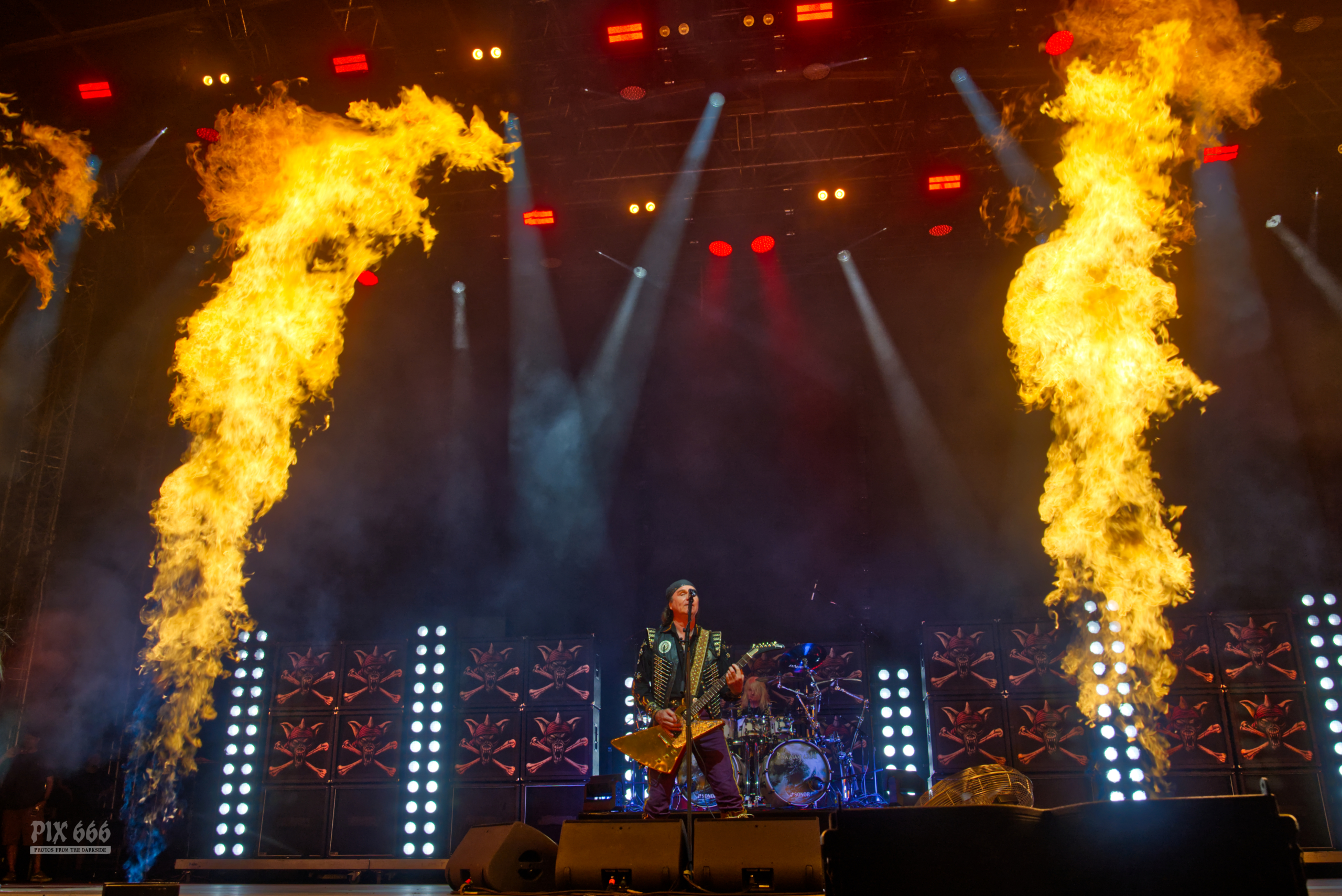 Nun war die Zeit für den Festivalheadliner 2025 gekommen. Wenn Running Wild loslegen, weiß man: Es wird laut, schnell und legendär. Beim Rock Castle Open Air 2025 lieferten die Hamburger Urgesteine einen Auftritt ab, der ganz im Zeichen ihres ikonischen Piratenmetals stand – schnörkellos, ehrwürdig und voller Nostalgie. Sänger Rolf alias Rock’n’Rolf führte mit souveräner Stimme und klassischem Gitarrensound durch ein Set, das für viele Fans einem Best-of gleichkam. Fast alle Songs des Abends wurden lauthals mitgesungen – ein klarer Beweis für den Kultstatus der Band. Die Show ging auf jeden Fall gleich richtig heiss los – Flammen schossen zu ‚Fistful Of Dynamite‘ in die Höhe. „Hey Tschechien, wie geht’s euch“? fragte Rolf und ihm entgegneten lautstarke Schreie der Fans. „Jetzt kommt ein Klassiker – ‚Bad to the Bone‘“. Die Energie stimmte, die Band war top eingespielt, und das Publikum feierte jede Note. Ein Meer aus Fäusten breitete sich vor der Bühne aus. Running Wild bewiesen beim Rock Castle, dass echter Heavy Metal keine Altersgrenze kennt. Dann sagte Rolf einfach nur ‚Under‘ und die Fans ergänzten im Chor ‚Jolly Roger‘. Der Klassiker aus den 80ern hat live immer noch dieselbe Power, wie vor einigen Jahrzehnten. Gelbes, weißes und rotes Licht flackerte jetzt über die Bühne und die Fans waren mit dem Auftritt von Running Wild rundum zufrieden. Danke an Running Wild für den tollen Auftritt und den unvergesslichen Abend beim Rock Castle Open Air 2025.