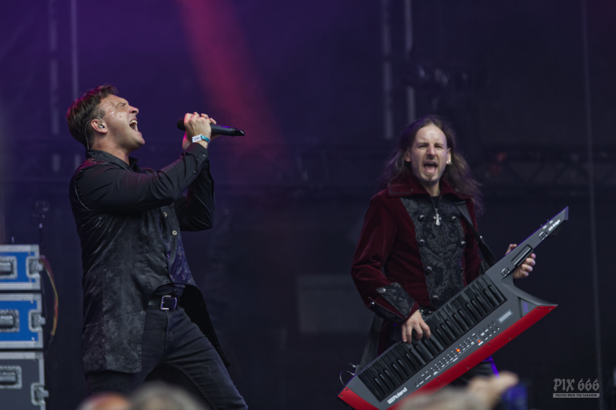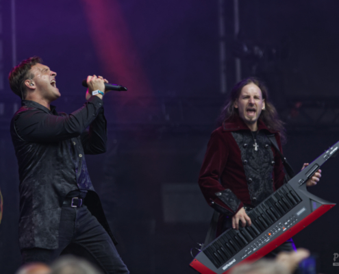Mit ‚Hic Svnt Dracones‘ veröffentlichten Dragony im vergangenen Herbst ihr fünftes Studioalbum und stiegen damit in ihrem Heimatland Österreich in die Top40 der Albumcharts ein. Zu Beginn der Show braute sich am Himmel einiges zusammen, Wind kam auf, es blitzte und donnerte, aber innerhalb weniger Minuten war das Gewitter am Festivalgelände vorbeigezogen. Dragony starteten mit ‚Twilight of the Gods‘ vom aktuellen Album. Die Stimmung war von Beginn an super, die Fans sprangen und klatschten fast pausenlos mit. Dragony hatten heute eine Überraschung mit nach Tschechien gebracht. Bei einigen Songs bekam Sänger Siegfried Unterstützung von Gastsängerin Maria von der Band Red Eye Temple, so zum Beispiel bei ‚If It Bleeds We Can Kill It‘ und ‚Beyond the Rainbow Bridge‘. Und was sollen wir sagen, das passte einfach irre gut und wäre aus unserer Sicht fast etwas für eine Dauerlösung. Die Band präsentierte sich in Topform – mit hymnischen Melodien, mehrstimmigen Refrains und feiner Gitarrenarbeit rissen sie das Publikum förmlich mit – still stehenbleiben war fast unmöglich. Dragony lieferten beim Rock Castle 2025 eine mitreißende, unterhaltsame und musikalisch starke Show ab – ein wahres Fest für Power-Metal-Fans. Im September steht dann noch ein besonderes Highlight in der Bandgeschichte bevor. Dragony gehen gemeinsam mit Twilight Force auf Japan Tour – wir wünschen viel Spaß und viel Erfolg.