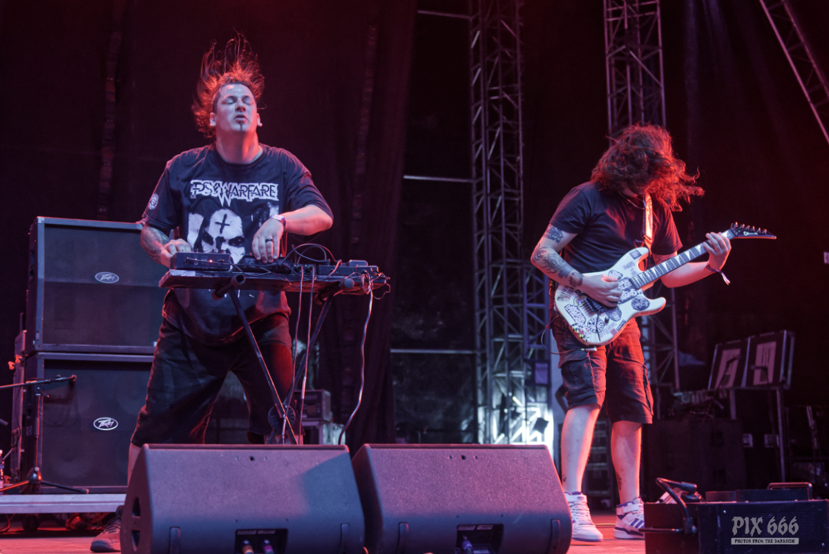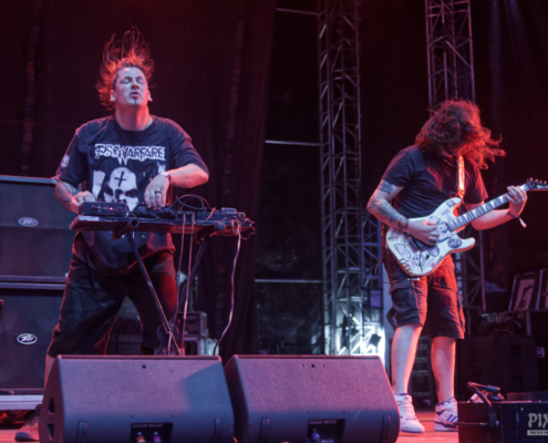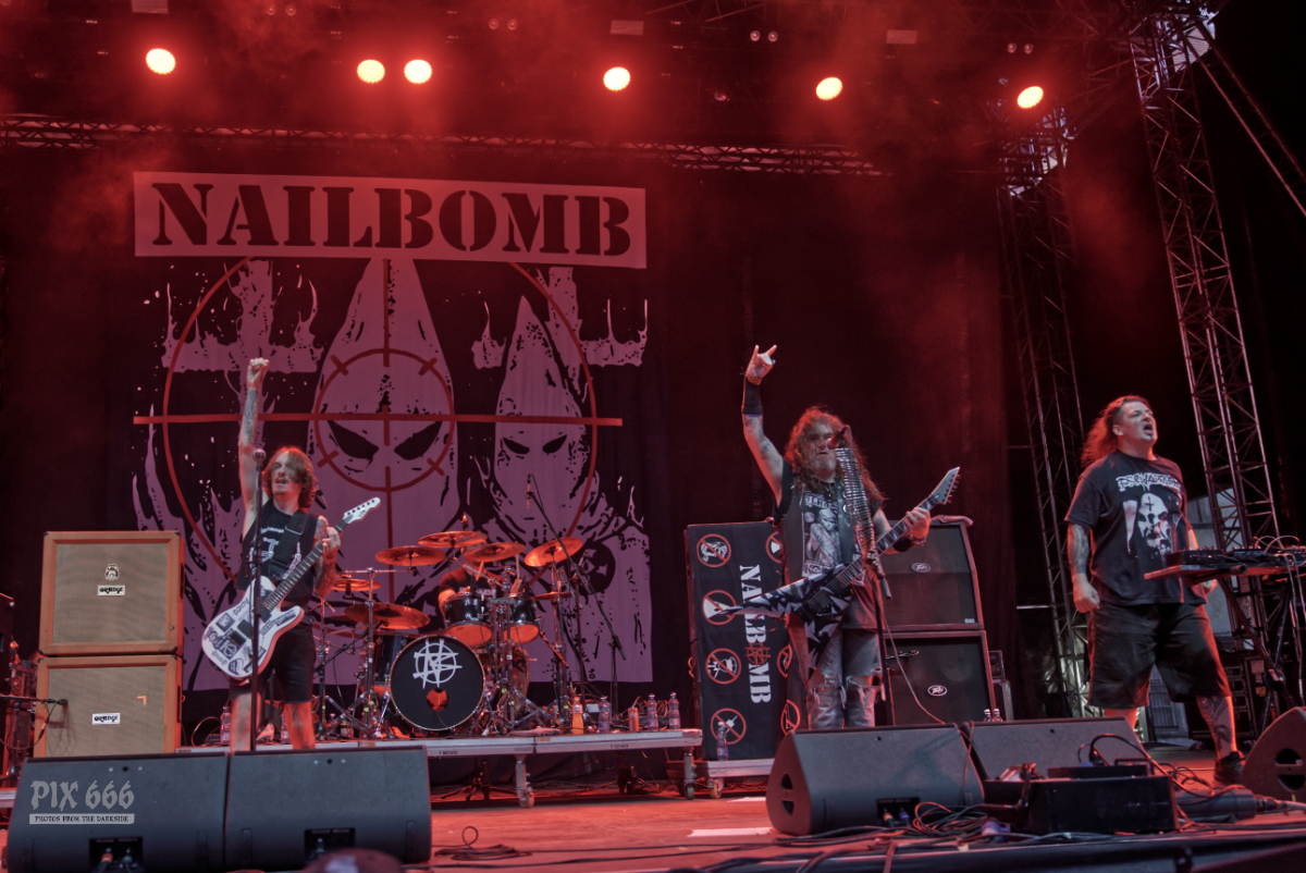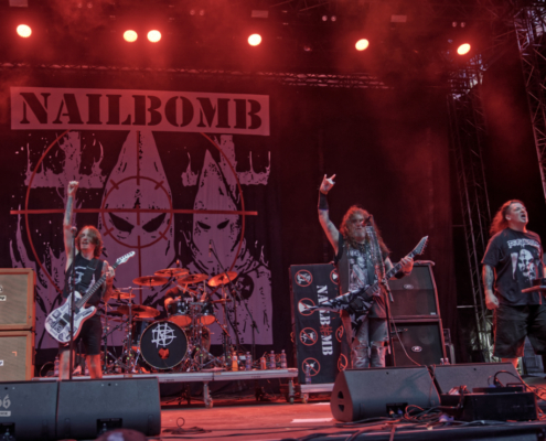 Als Nailbomb beim Rock Castle Open Air 2025 die Bühne betraten, wurde die Atmosphäre schlagartig düsterer, schwerer – und aggressiver. Das Projekt, einst von Max Cavalera (Sepultura/Soulfly) und Alex Newport gegründet, entfachte mit seiner kompromisslosen Mixtur aus Industrial, Thrash und Hardcore einen Metalsturm der Extraklasse. Die Gitarrenriffs waren roh und messerscharf, die Beats maschinenartig hart, die Vocals voller Zorn– genau so, wie Nailbomb klingen soll und muss. Die Bühne war nur schlicht dekoriert, der Fokus lag voll auf der Energie der Musik – und die war enorm. Das Publikum reagierte mit Headbangen, Moshpits und kollektivem Ausrasten. In dem Wissen, dass Nailbomb Auftritte eine absolute Seltenheit sind, feierte die Metalgemeinde die nun schon über 30 Jahre alten Songs, als gäbe es kein Morgen. „Macht Lärm“ schrie Metal Legende Max Cavalera immer wieder ins Mikrofon. Die Musiker gingen genau so ab, wie das Publikum. Bei den extrem schnellen Songs drehten sich die Haare bei Alex an den Samples in Windeseile. Auch die Gitarristen wirbelten über die Bühne und Bassistin Jackie war da kein Bisschen zurückhaltender. Meist weißes und rotes Licht flackerte im Takt. Manchmal war die Bühne auch nur mit ganz spärlichem grünem Lichtschein erhellt. Nailbomb lieferten beim Rock Castle 2025 einen brutalen Abriss – roh, ehrlich, intensiv – und genau deshalb war es so gut.