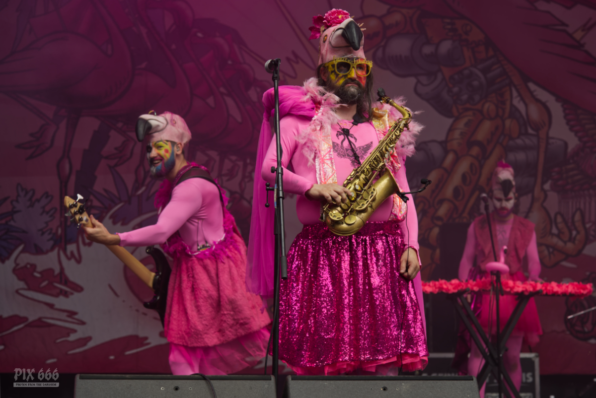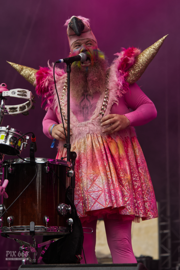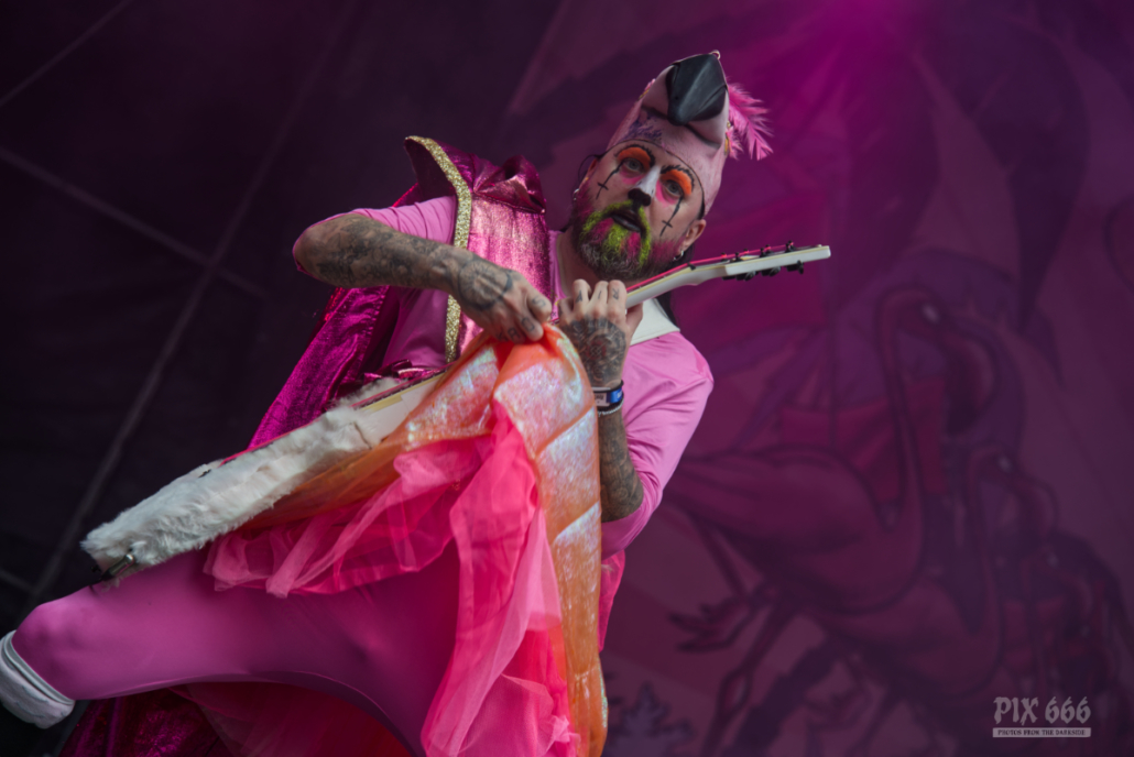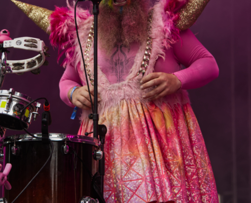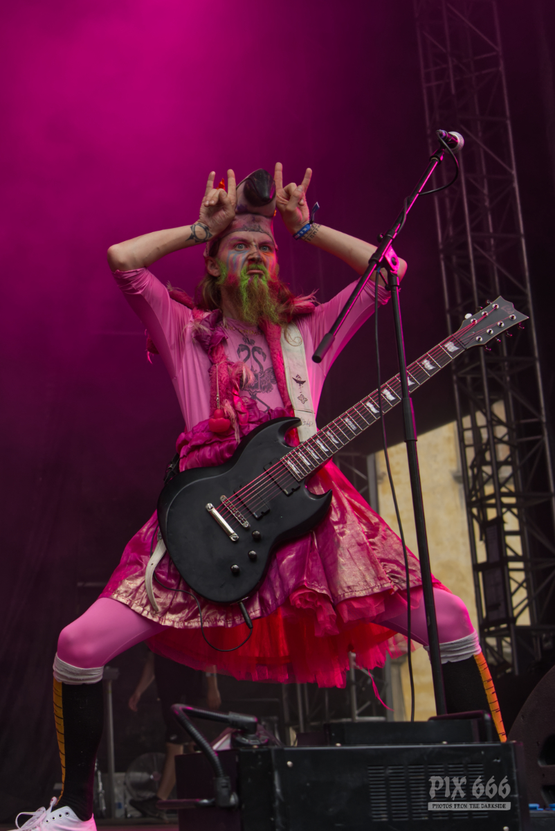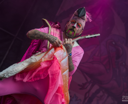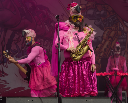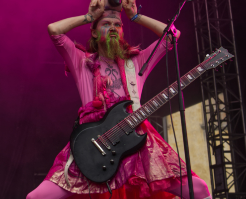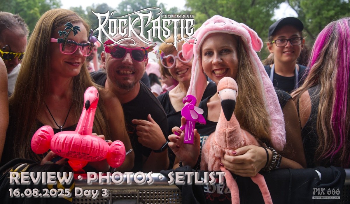Schon im Vorfeld des Auftrittes wurde klar, jetzt wird alles anders, als zuvor. Zahlreiche Fans hatten aufblasbare Flamingos dabei, auch die Fans ganz vorn dekorierten die erste Reihe mit kleinen Gummiflamingos oder Plüschtieren – aus traditionellem schwarz wurde pink, sehr viel pink. Wenn Trollfest auf der Bühne stehen, wird aus einem Metal-Konzert ein anarchisches, schillerndes Spektakel – und genau das lieferten die norwegischen Folk-Metaller beim Rock Castle Open Air 2025: eine bunte Explosion aus Blasinstrumenten und trolligem Wahnsinn. Mit ihrem einzigartigen Mix aus Folk Metal, Humppa und Balkan-Polka sowie schrägen Kostümen sorgten Trollfest sofort für maximale Stimmung. Kaum ein Publikumsteilnehmer blieb still stehen – stattdessen wurde getanzt, gesprungen und mitgegrölt, als gäbe es kein Morgen. Ob Klassiker wie ‚Kaptein Kaos‘ oder neuere Kracher – jedes Lied wurde zur wilden Mitmach-Orgie. Dann wurde es noch besser und wilder – ein Musiker machte sich als Anführer der riesigen Trollfest-Polonaise auf den Weg über das gesamte Festivalgelände – erst langsam, dann immer schneller. Ein wilder Lauf, an dem sich hunderte Fans beteiligten. Weiter ging es mit Crowdsurfenden Flamingos und Flamingos im Moshpit. Auch das hinsetzen und hochspringen klappte heute eigentlich besser, als an den Tagen zuvor – die Fans hatten noch jede Menge Energie oder sich alle Kraft für diese mitreißende Show aufgehoben. Trollfest sind eine Liveband der Extraklasse – chaotisch, laut, tanzbar –einfach grandios. Wer dabei war, wird’s nicht so schnell vergessen.