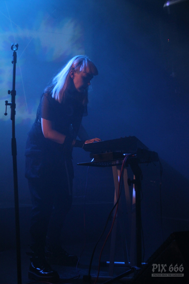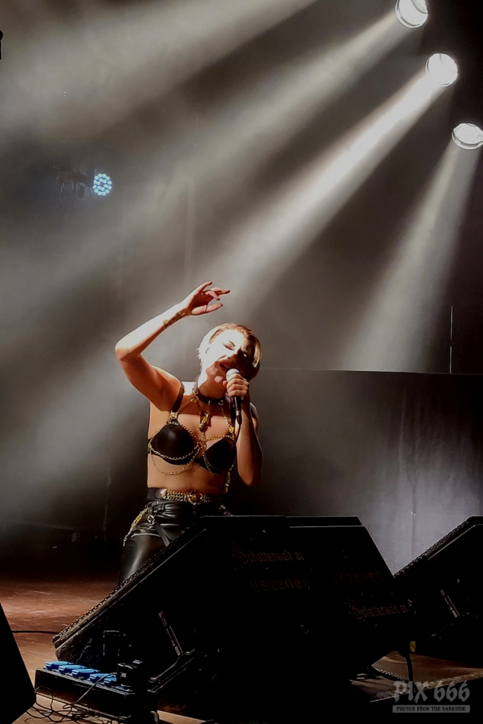 Die Wiener Solokünstlerin Warteraum, die kurzfristig beim Schattenwelt 2022 eingesprungen ist, lockte dann die Gäste wieder aus dem Biergarten vor die Bühne. Die Fans erlebten eine interessante und düstere ‚One-Woman-Show‘ mit Musik von Dark Wave bis Synthpunk. Sanfte, angenehme Synthieklänge beschallten die Szene und auch getanzt oder zumindest hin und her gewippt wurde im Publikum wieder. Die ursprünglich aus Prag stammende Künstlerin schlängelte sich elegant zwischen ihren beiden Keyboards herum, stimmlich konnte die Wahlwienerin auch überzeugen. Sie hatte dem Publikum neben älteren Songs ihrer bisherigen 7-jährigen Bandkarriere auch drei bisher unveröffentlichte Songs mit zum Schattenwelt Festival gebracht. Es gab zum Schluss ordentlich Applaus für eine unterhaltsame Performance.