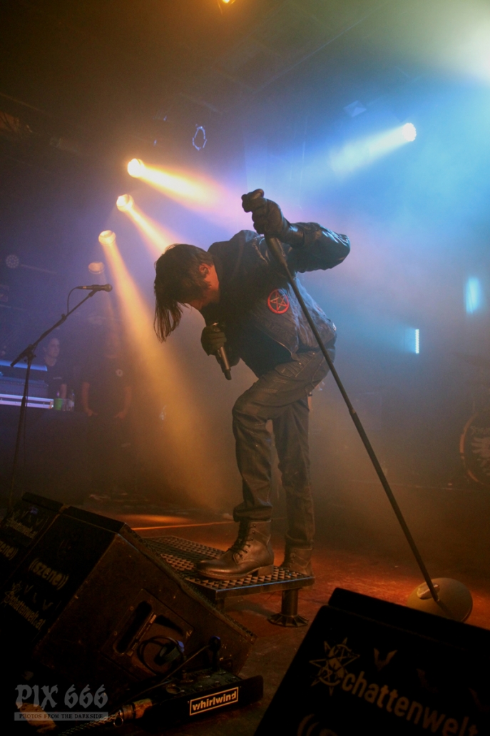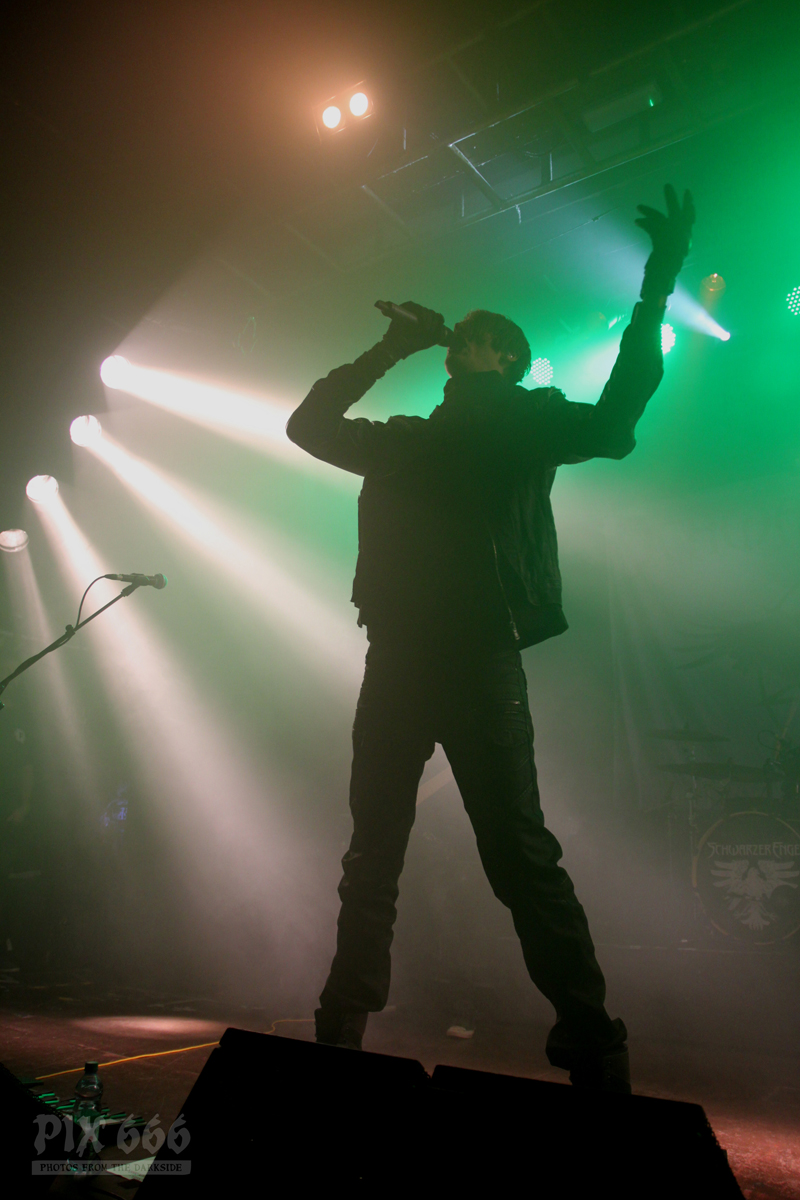 Nun gab es einen kompletten Stilwechsel und zum ersten Mal heute Abend war ein richtiges Schlagzeug auf der Bühne. Dark Metal war angesagt beim Schattenwelt Festival. Seit nunmehr 15 Jahren sind Schwarzer Engel ein fixer Bestandteil der Gothic und Metal Szene. Auftritte beim M’era Luna oder Wave Gotik Treffen und zahlreiche Touren zusammen mit Szenegrößen wie Oomph! – oder selbst als Headliner stehen in der Vita der beliebten deutschen Band. Das Schattenwelt Publikum empfing die Band warmherzig und war wirklich offen für jedes Musikgenre.