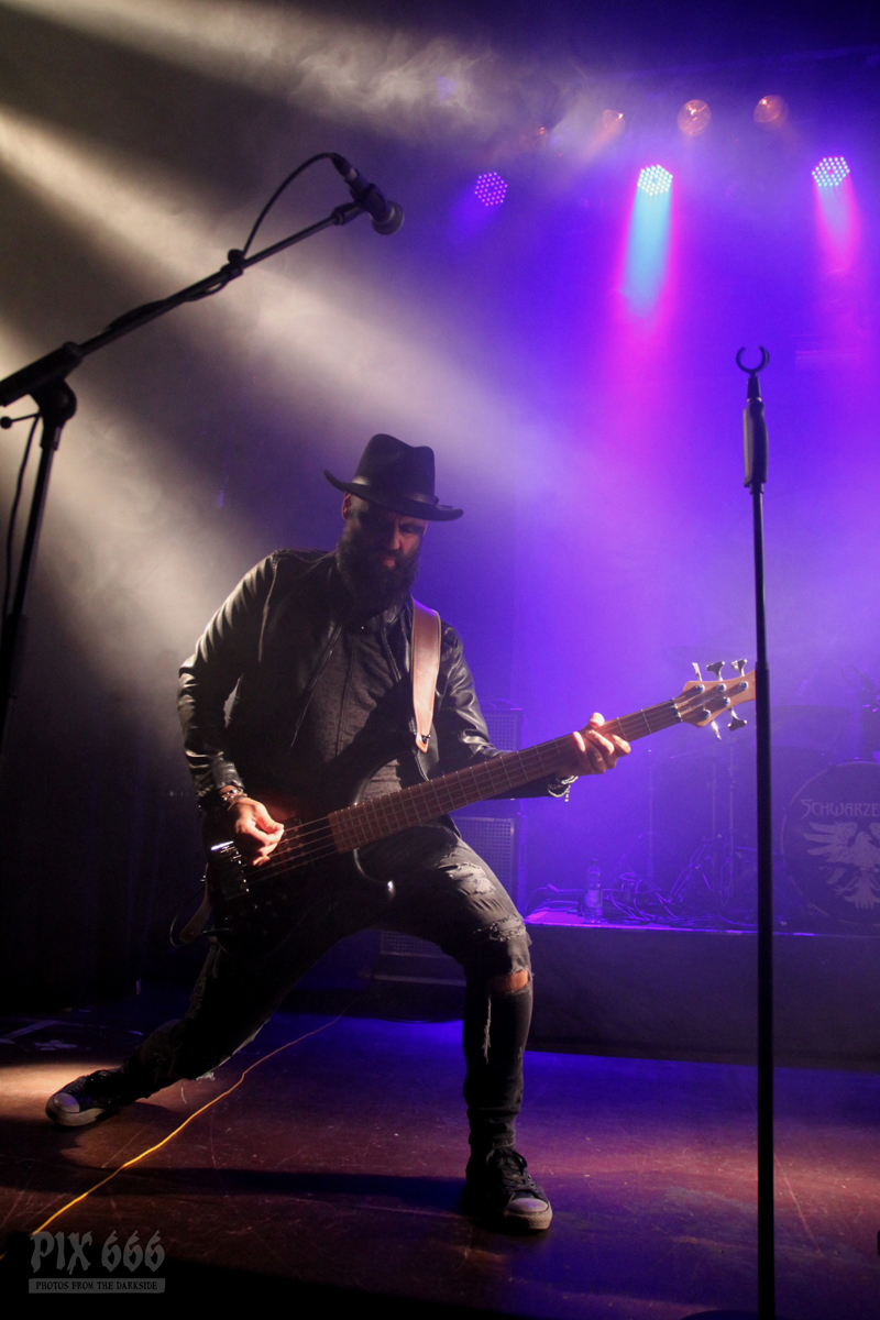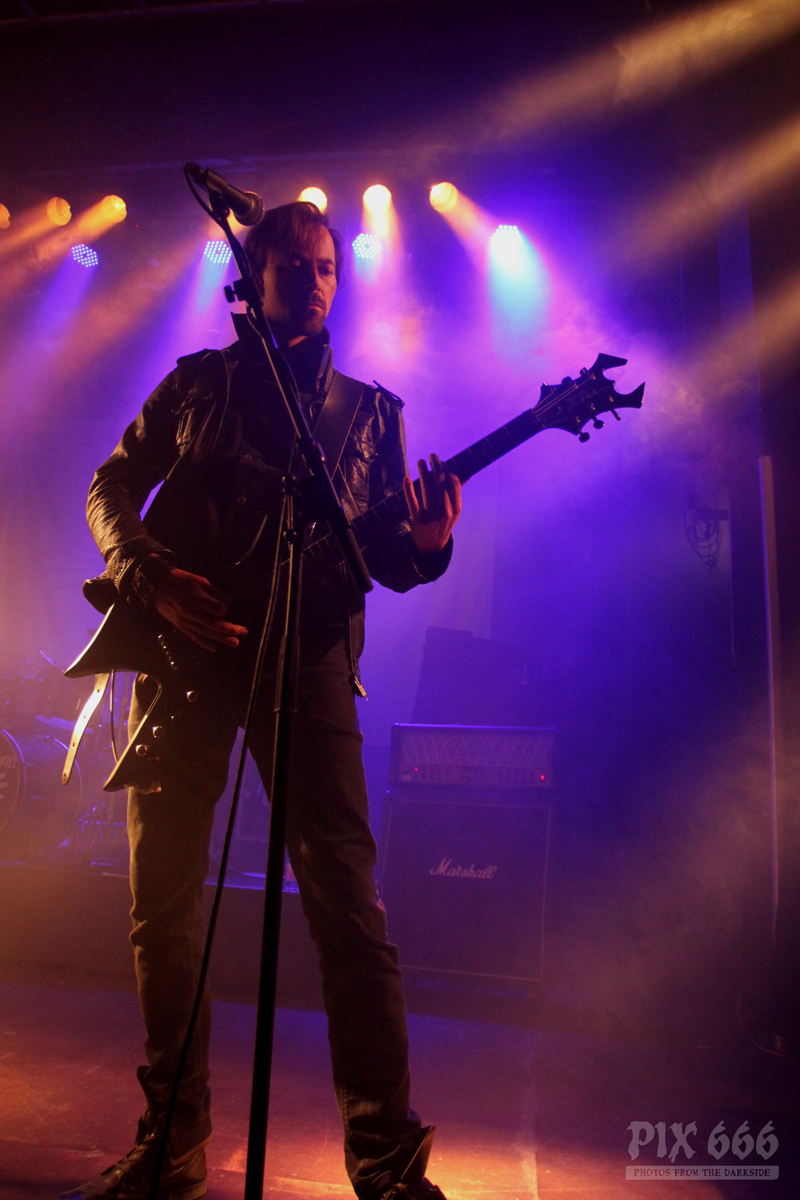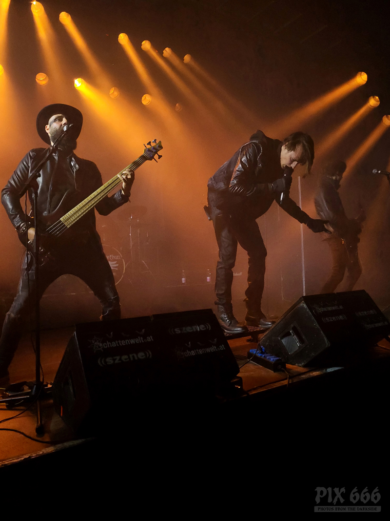 Bei ‚Meine Liebe‘ gab es dann einige Peitschenhiebe für den Gitarristen und den Bassisten und die Stimmung schaukelte sich immer weiter hoch – nun gab es neben Tänzern auch Headbanger in den ersten Reihen. „Zur Abwechslung wieder etwas ruhiges – ‚Traum einer Nacht‘ – zeigt mir eure Hände – Sehr schön“. Auch die Band war von den Wienern begeistern, die sich wirklich voll ins Zeug legten. Dave ergänzte dann noch „… unglaublich – ein Jahr hat es gedauert vom letzten Auftritt bis jetzt. Lasst uns die Sau rauslassen, solange es noch geht – vielen Dank Schattenwelt – danke, dass ihr da seid“.