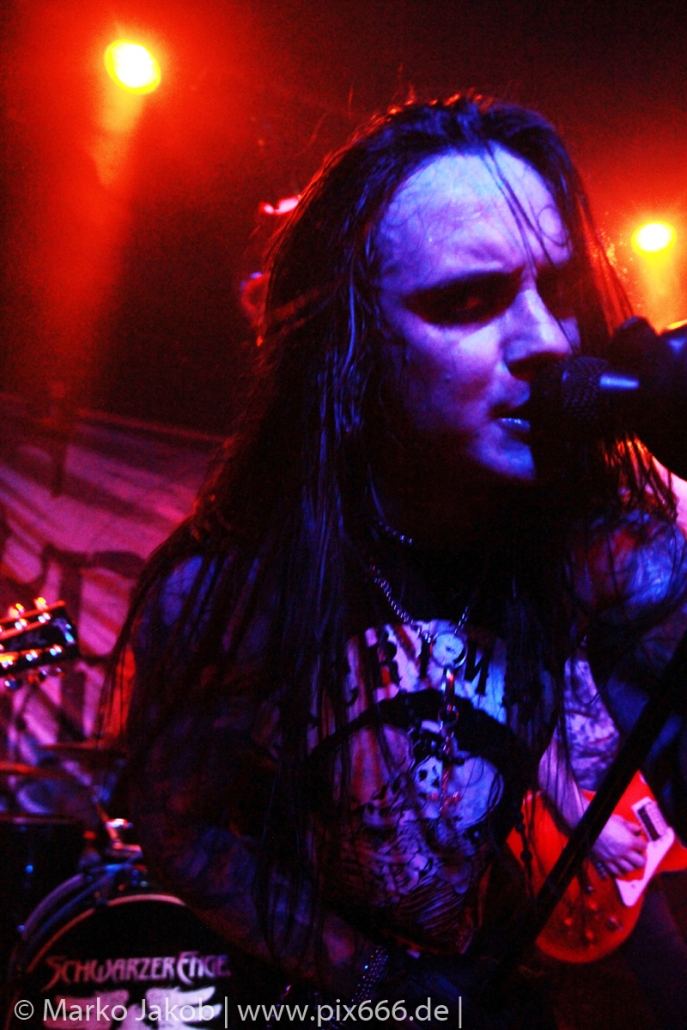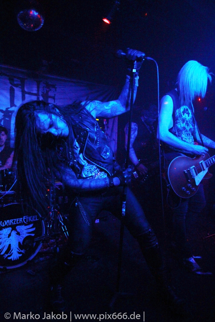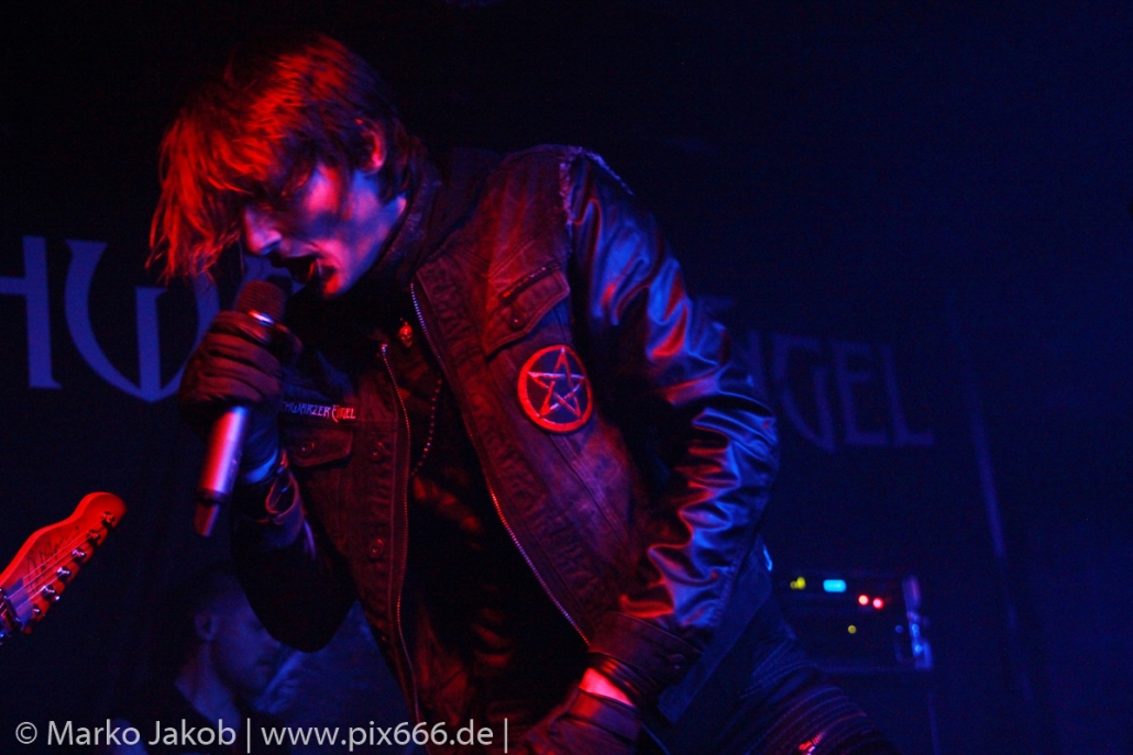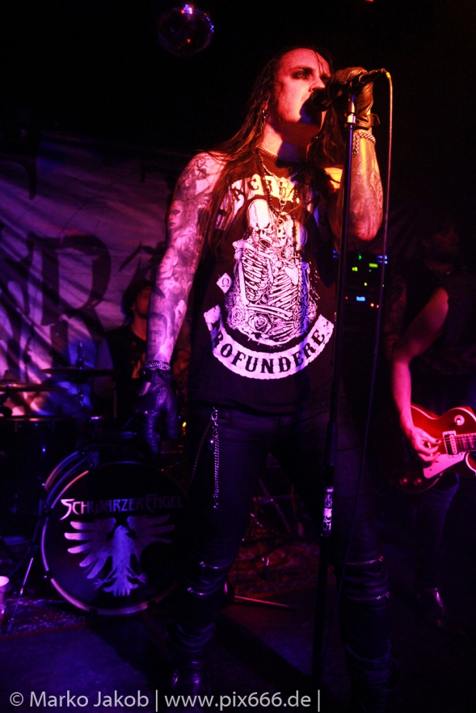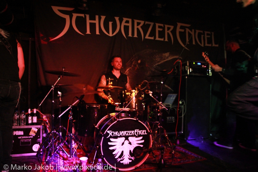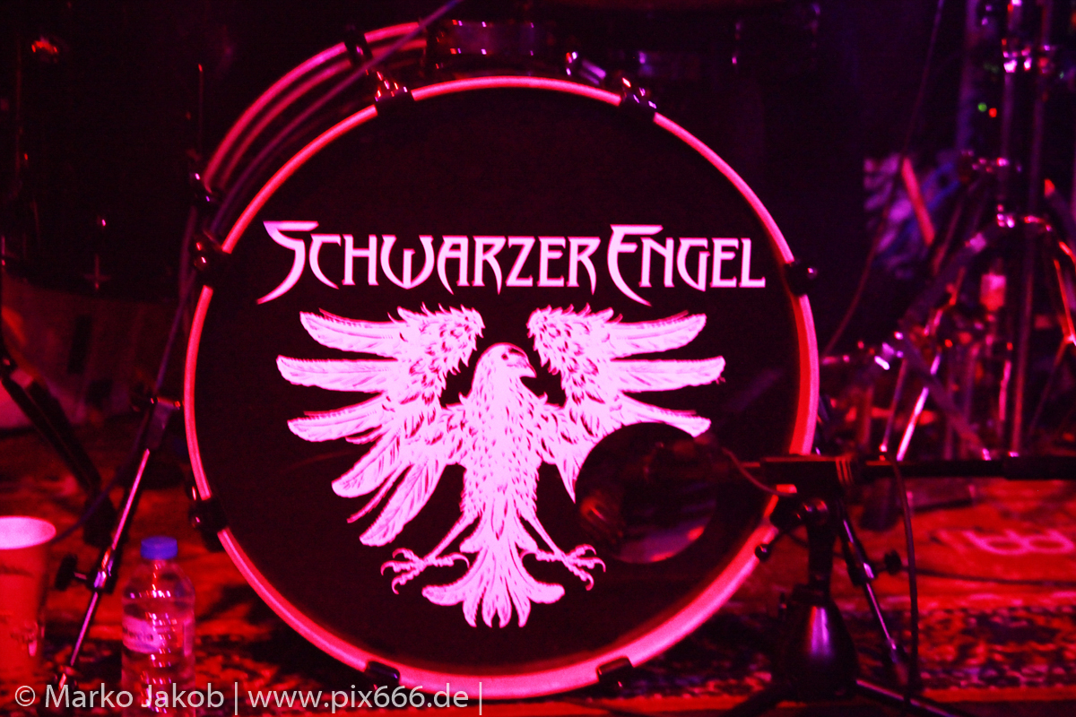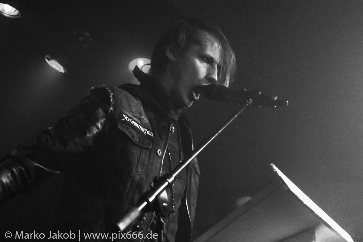 Etwa 20 Minuten nach den letzten Klängen von The Fright betrat Schwarzer Engel mit seinen Musikern die Bühne. Ein großes Backdrop mit dem Schriftzug der Band sowie ein Pult, hinter dem Dave den ersten Teil des Sets verbrachte, schmückten die Bühne. Im düsteren Licht erklangen die ersten Töne von ‚Krähen An Die Macht‘, dem Opener des erst vor kurzem erschienenen aktuellen Albums ‚Kult Der Krähe‘.