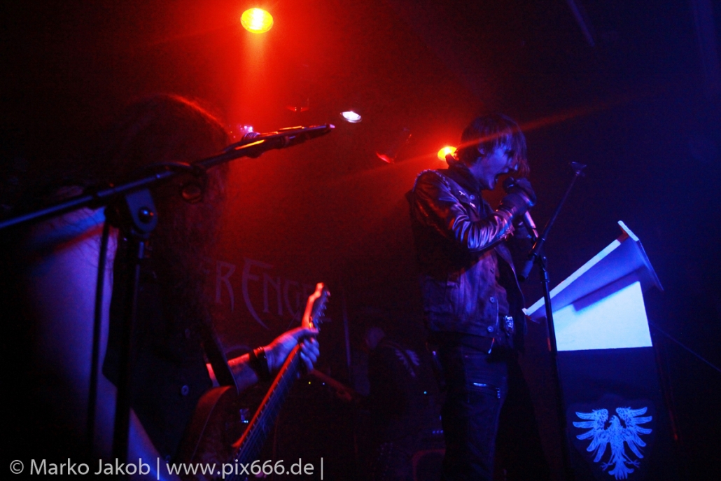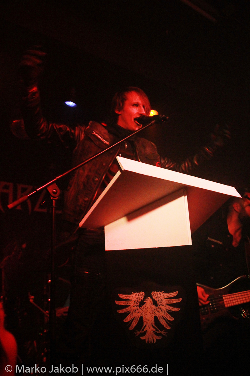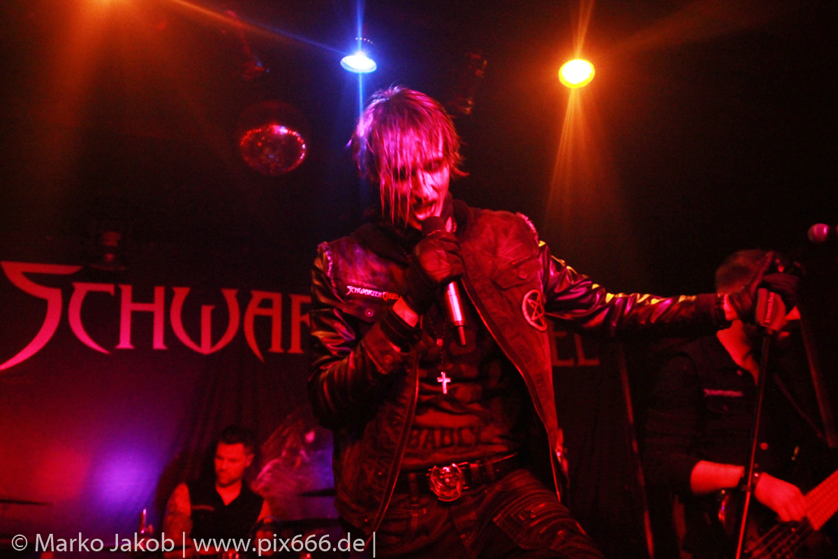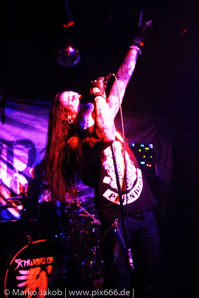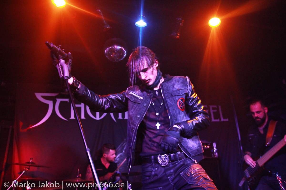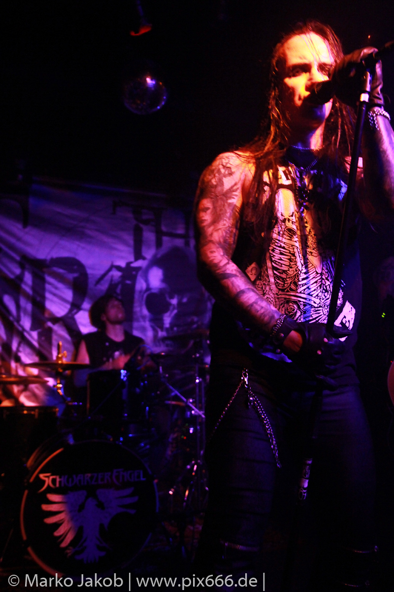 Etwa 20 Minuten nach den letzten Klängen von The Fright betrat Schwarzer Engel mit seinen Musikern die Bühne. Ein großes Backdrop mit dem Schriftzug der Band sowie ein Pult, hinter dem Dave den ersten Teil des Sets verbrachte, schmückten die Bühne. Im düsteren Licht erklangen die ersten Töne von ‚Krähen An Die Macht‘, dem Opener des erst vor kurzem erschienenen aktuellen Albums ‚Kult Der Krähe‘.