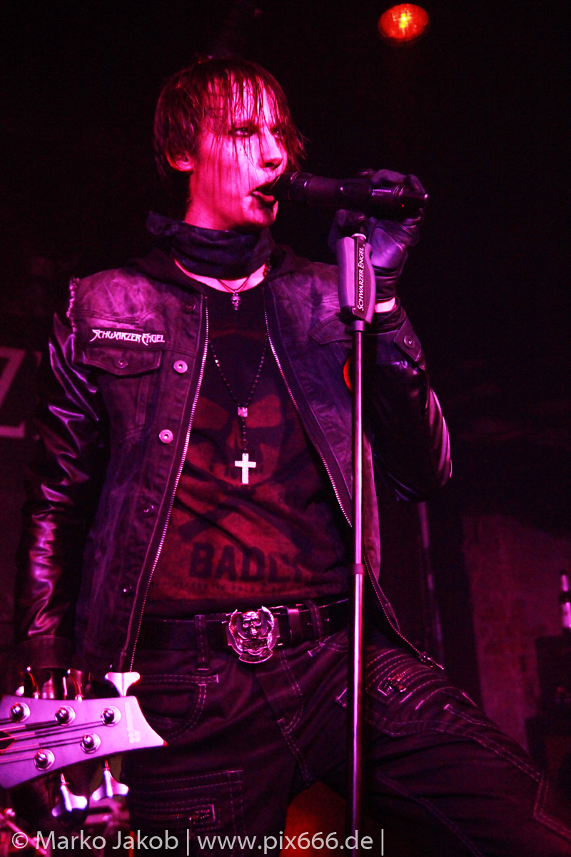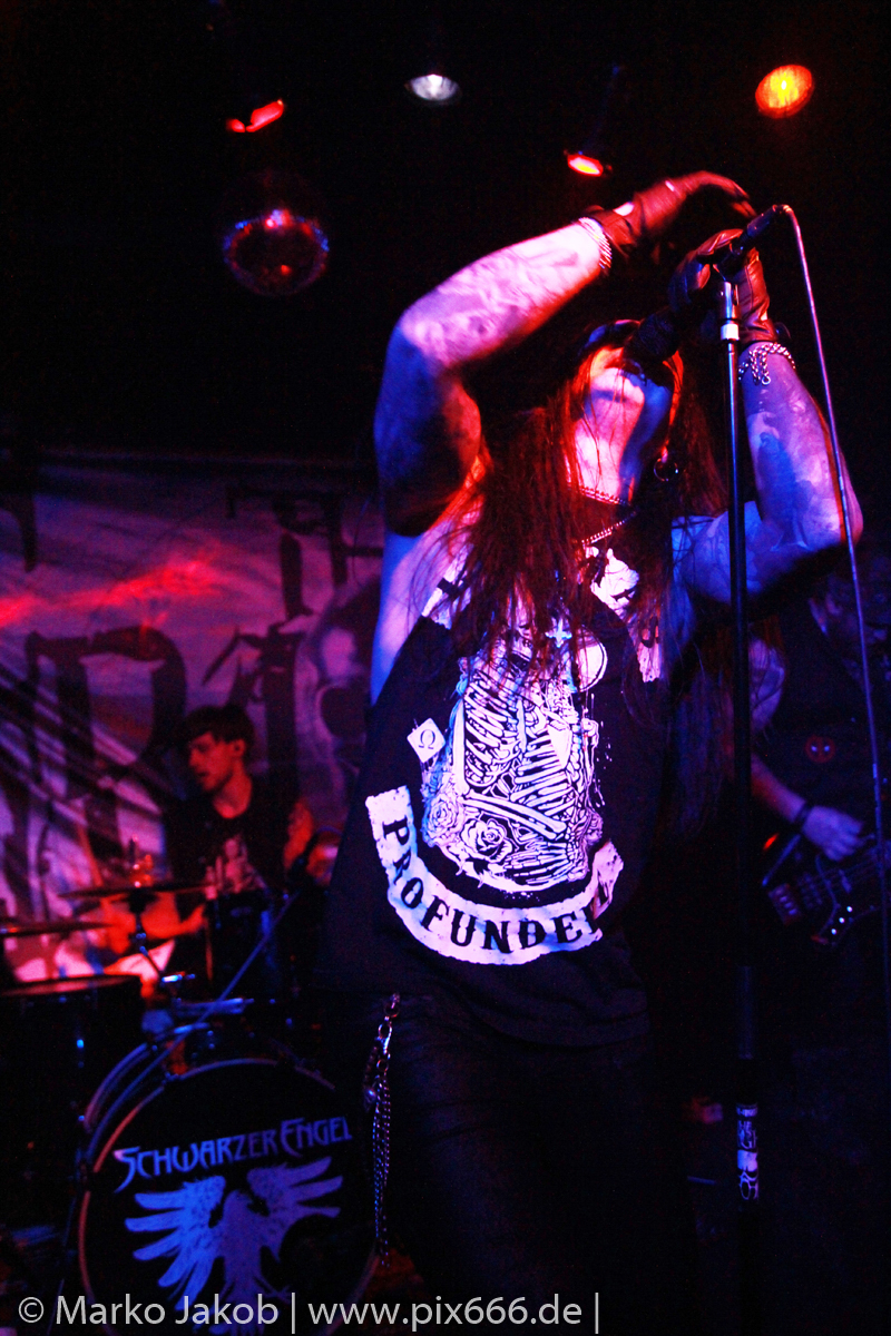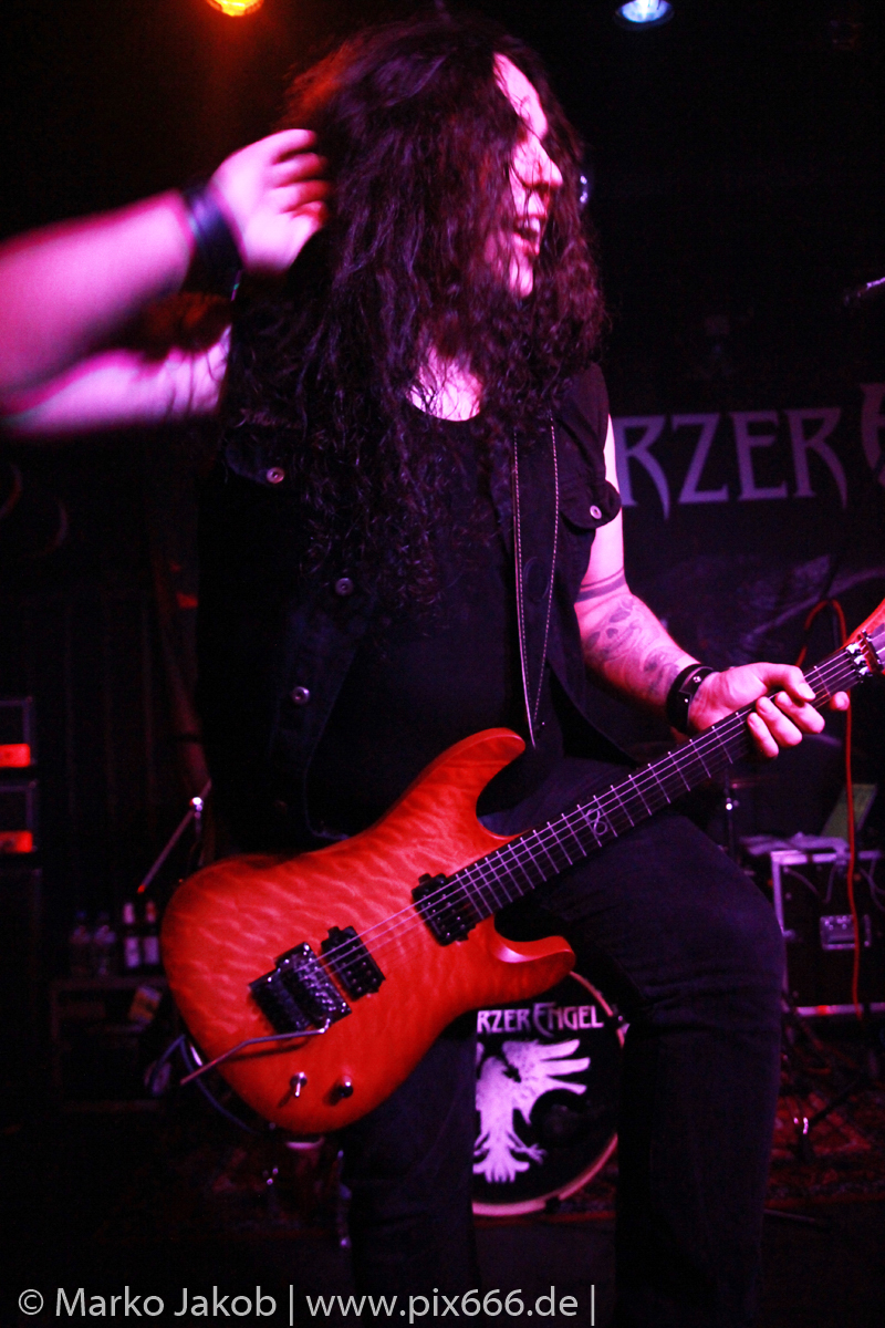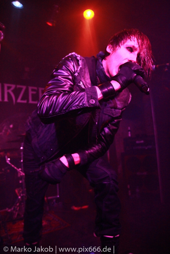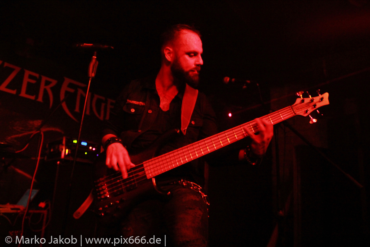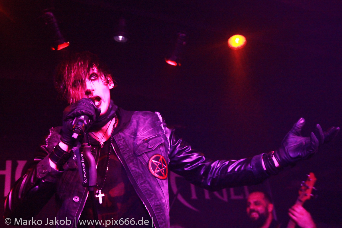 Etwa 20 Minuten nach den letzten Klängen von The Fright betrat Schwarzer Engel mit seinen Musikern die Bühne. Ein großes Backdrop mit dem Schriftzug der Band sowie ein Pult, hinter dem Dave den ersten Teil des Sets verbrachte, schmückten die Bühne. Im düsteren Licht erklangen die ersten Töne von ‚Krähen An Die Macht‘, dem Opener des erst vor kurzem erschienenen aktuellen Albums ‚Kult Der Krähe‘.