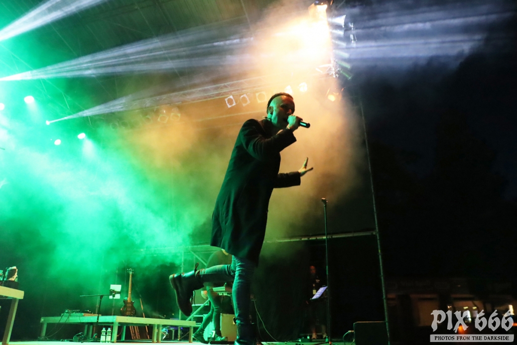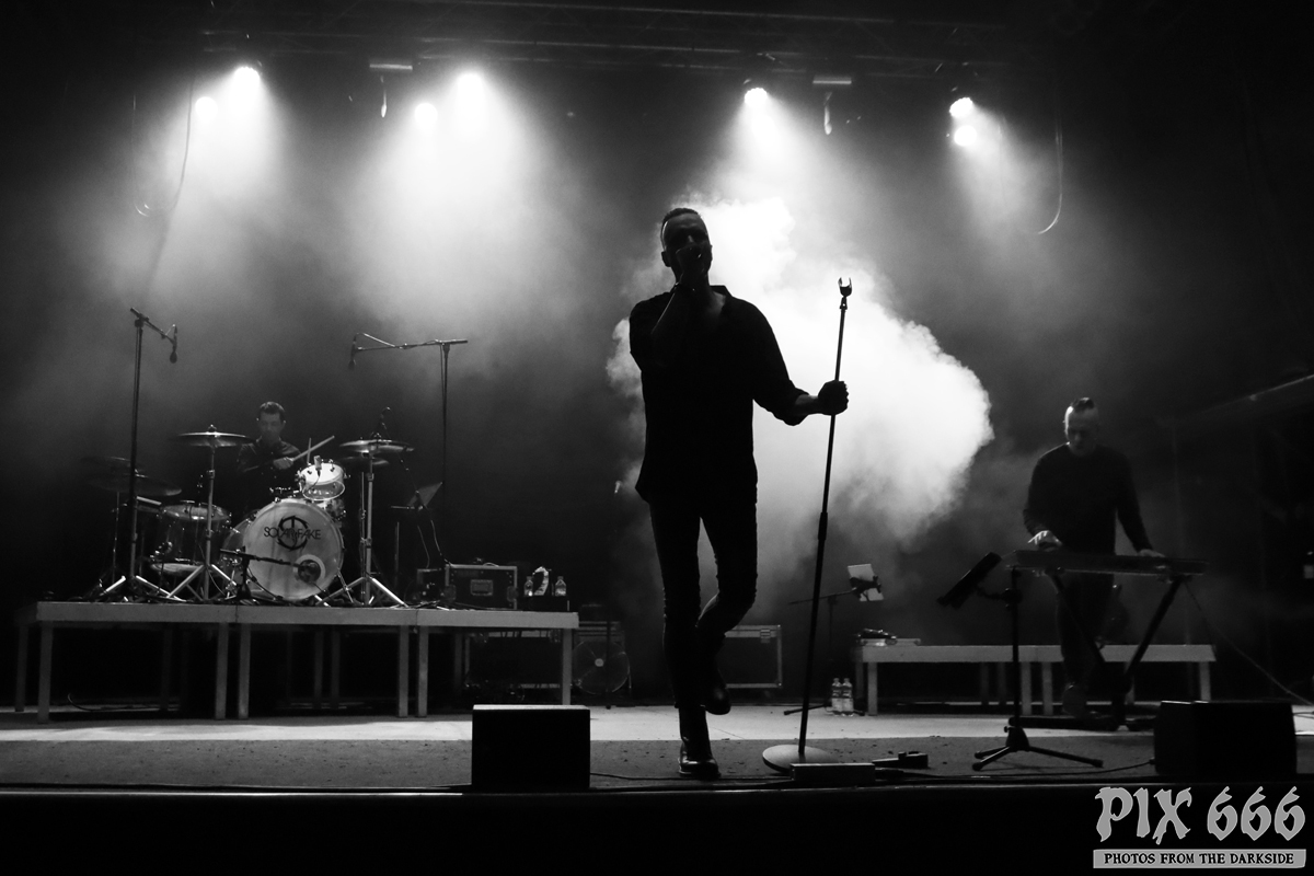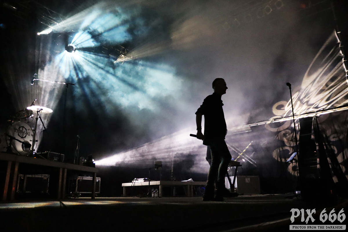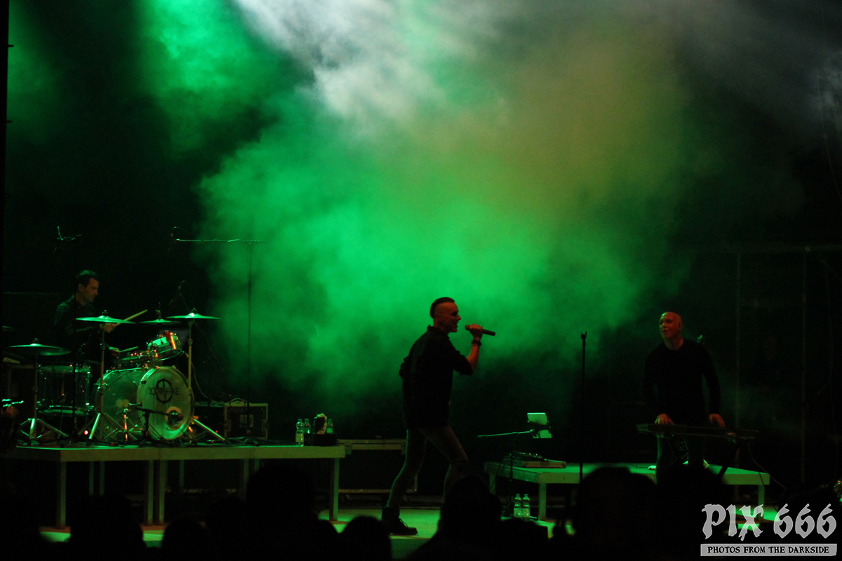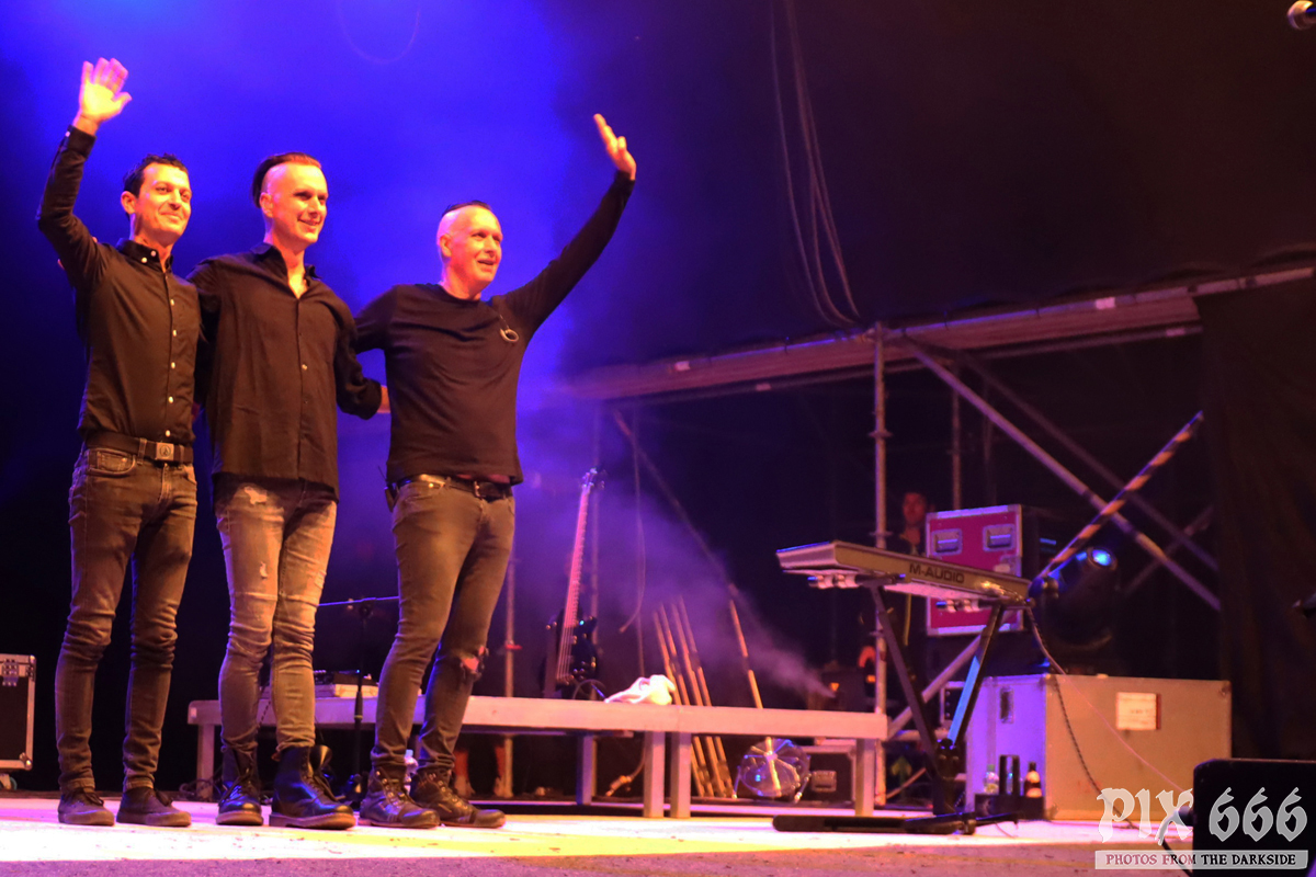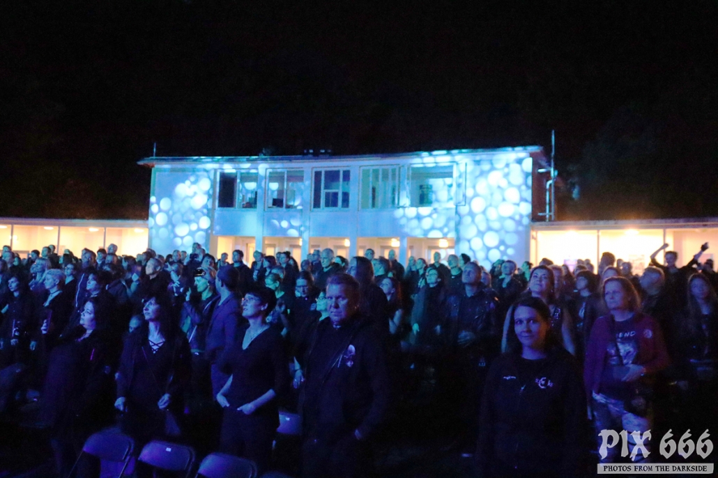 Das Gelände füllte sich nur zögerlich. Aber pünktlich zu Konzertbeginn war die Parkbühne dann ganz in ‚Schwarz‘. Viele Besucher trugen Solar Fake Fanshirts oder die coolen Shadowplay e.V. Jacken – eine gute Wahl, denn nach Sonnenuntergang wurde es spürbar kälter. Die Open Air Veranstaltung war mit knapp über 500 Menschen ausverkauft. Dafür wurden 500 Stühle auf dem Areal verteilt – die Stühle waren in Vierergruppen aufgestellt – mit jeweils genügend Sicherheitsabstand zu allen Seiten.